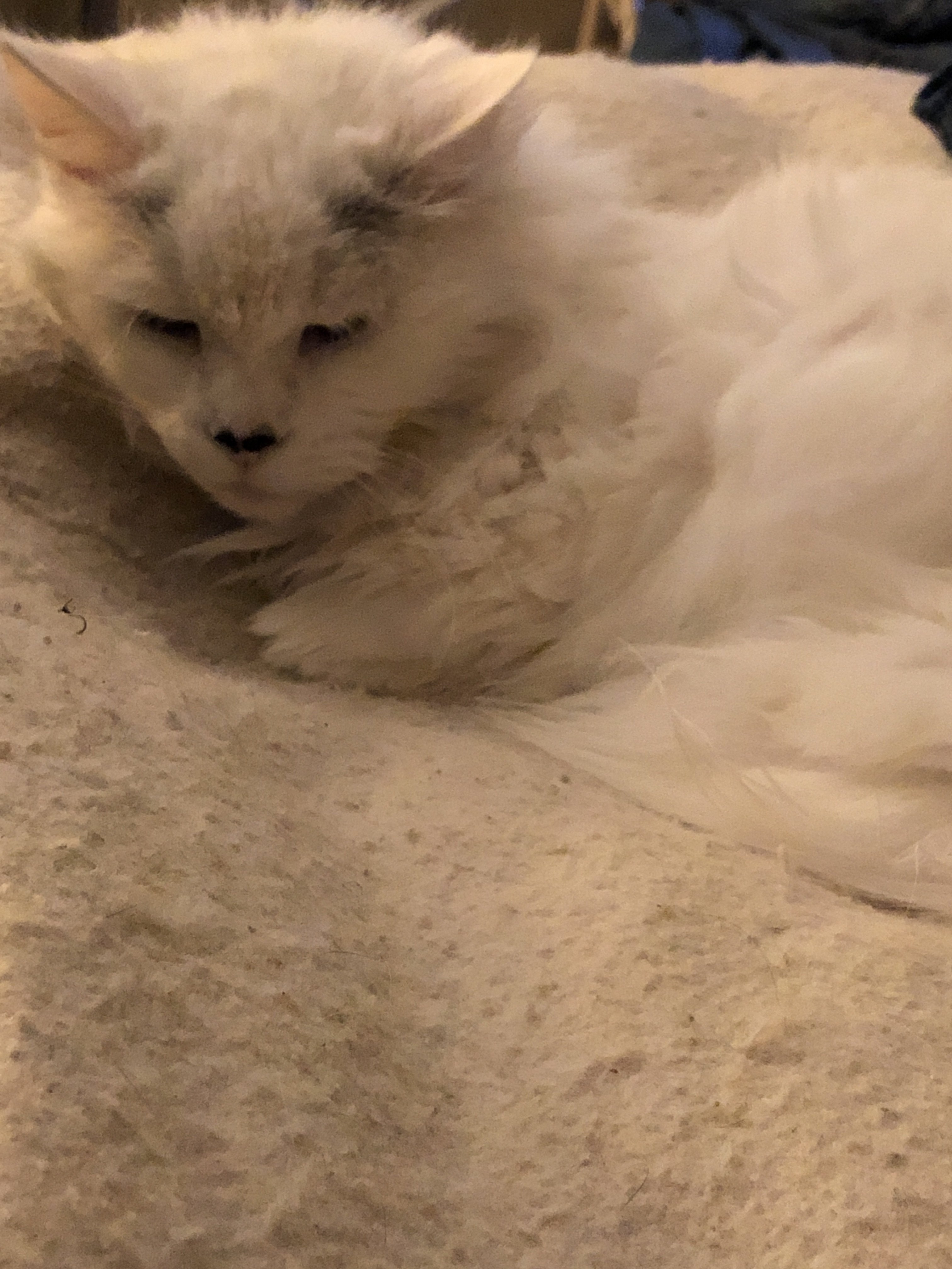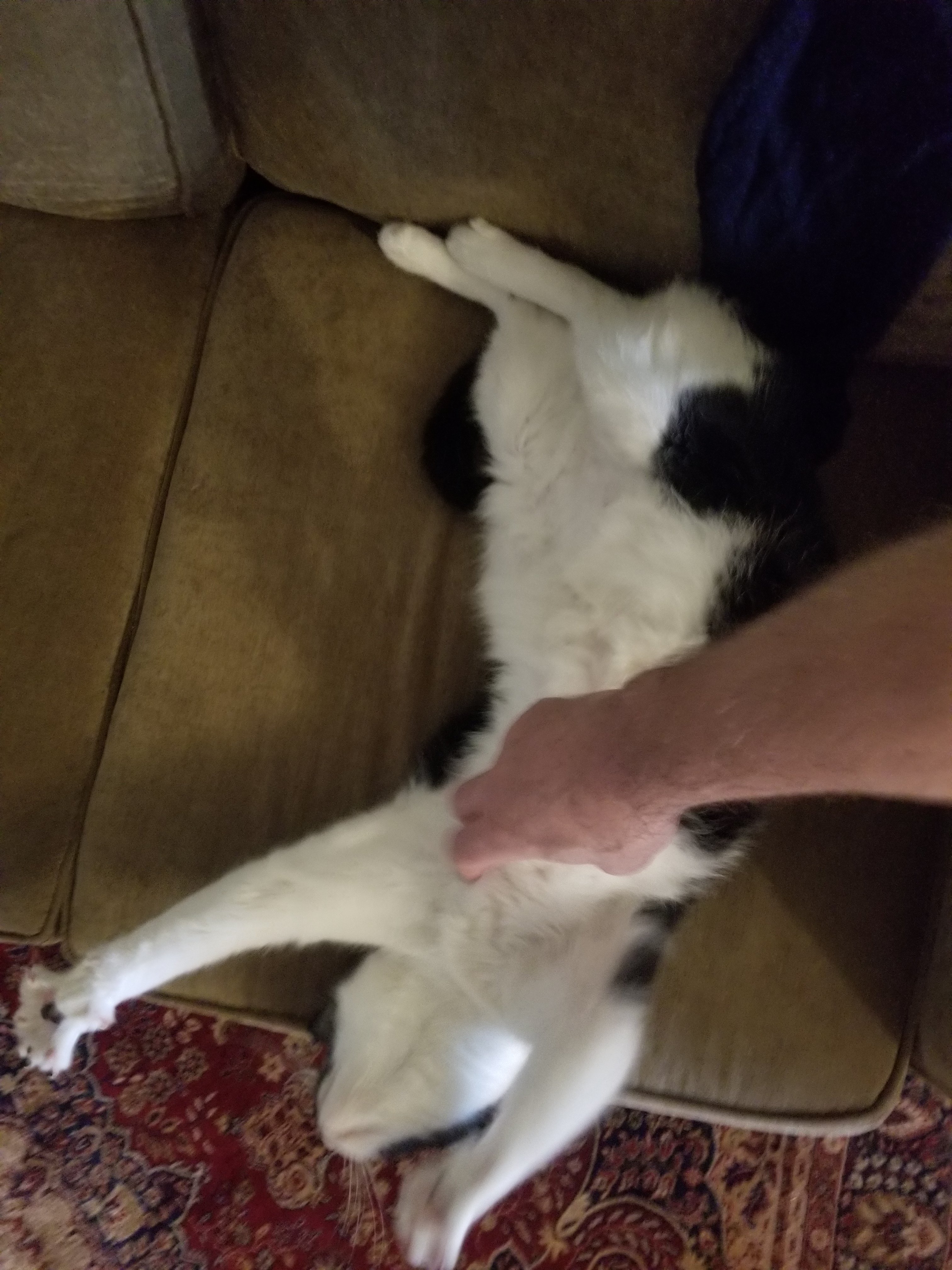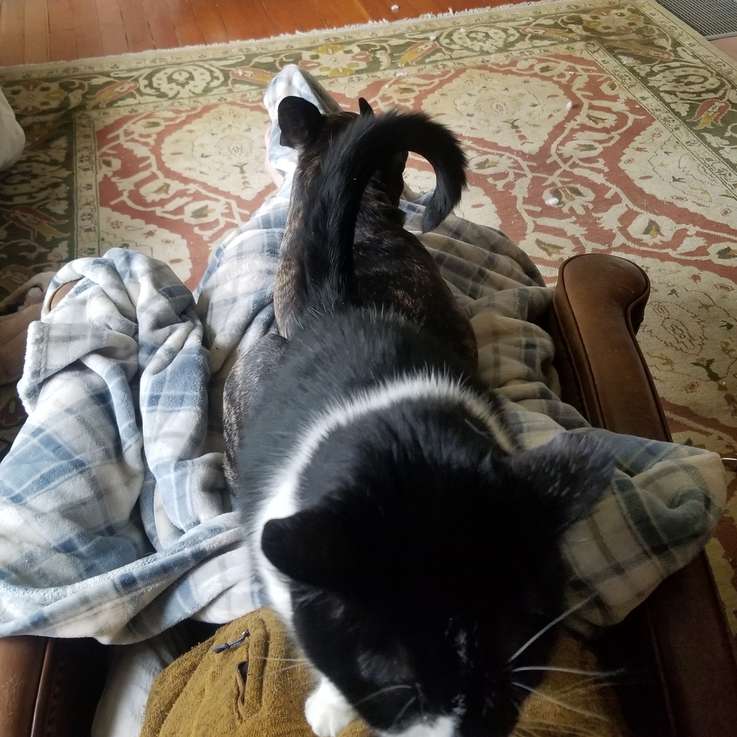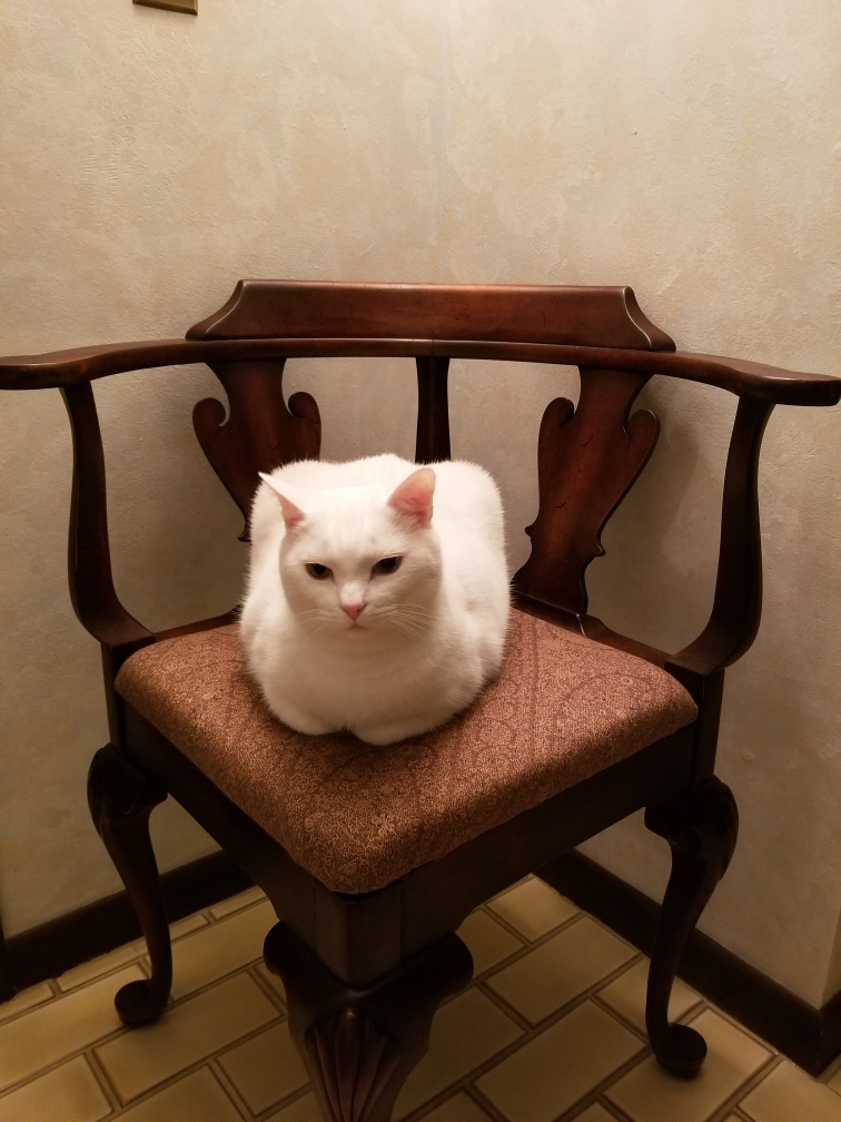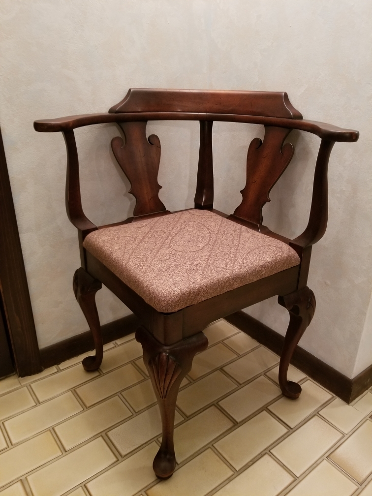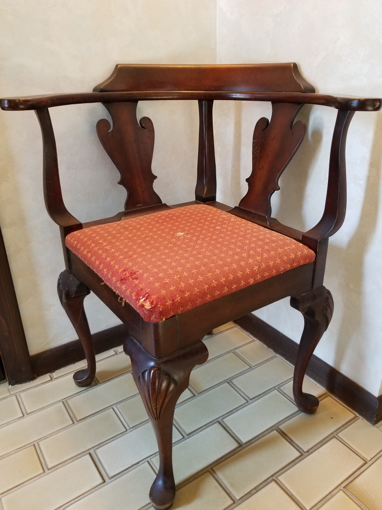 Last evening , my wife and I finished restoring and reupholstering this antique corner chair for our entry way for people to use while taking off and putting on shoes when entering or leaving the house. Guess who made sure he was the first to use it.