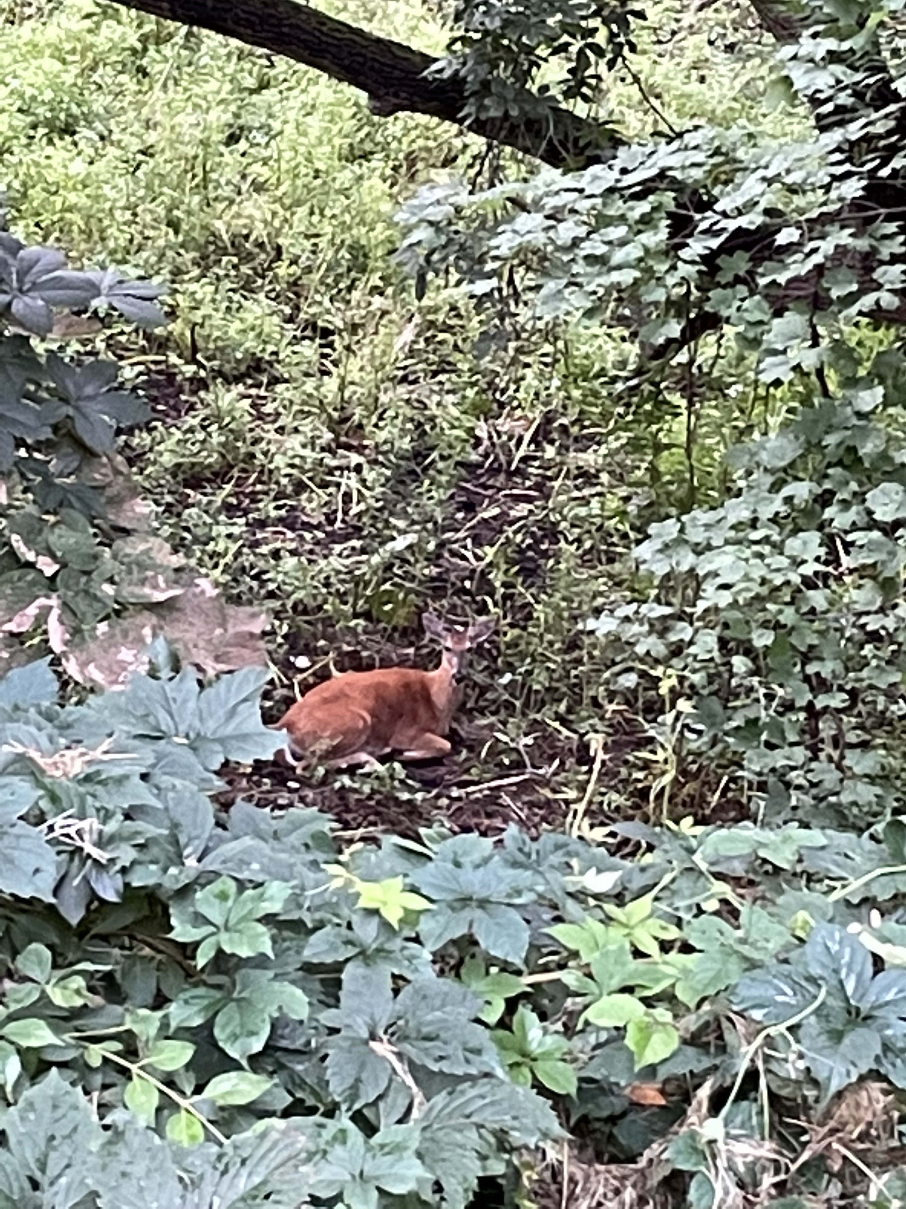 View attachment 1268746 View attachment 1268747 Very hot here today. Our doe and fawn are lying down out back.