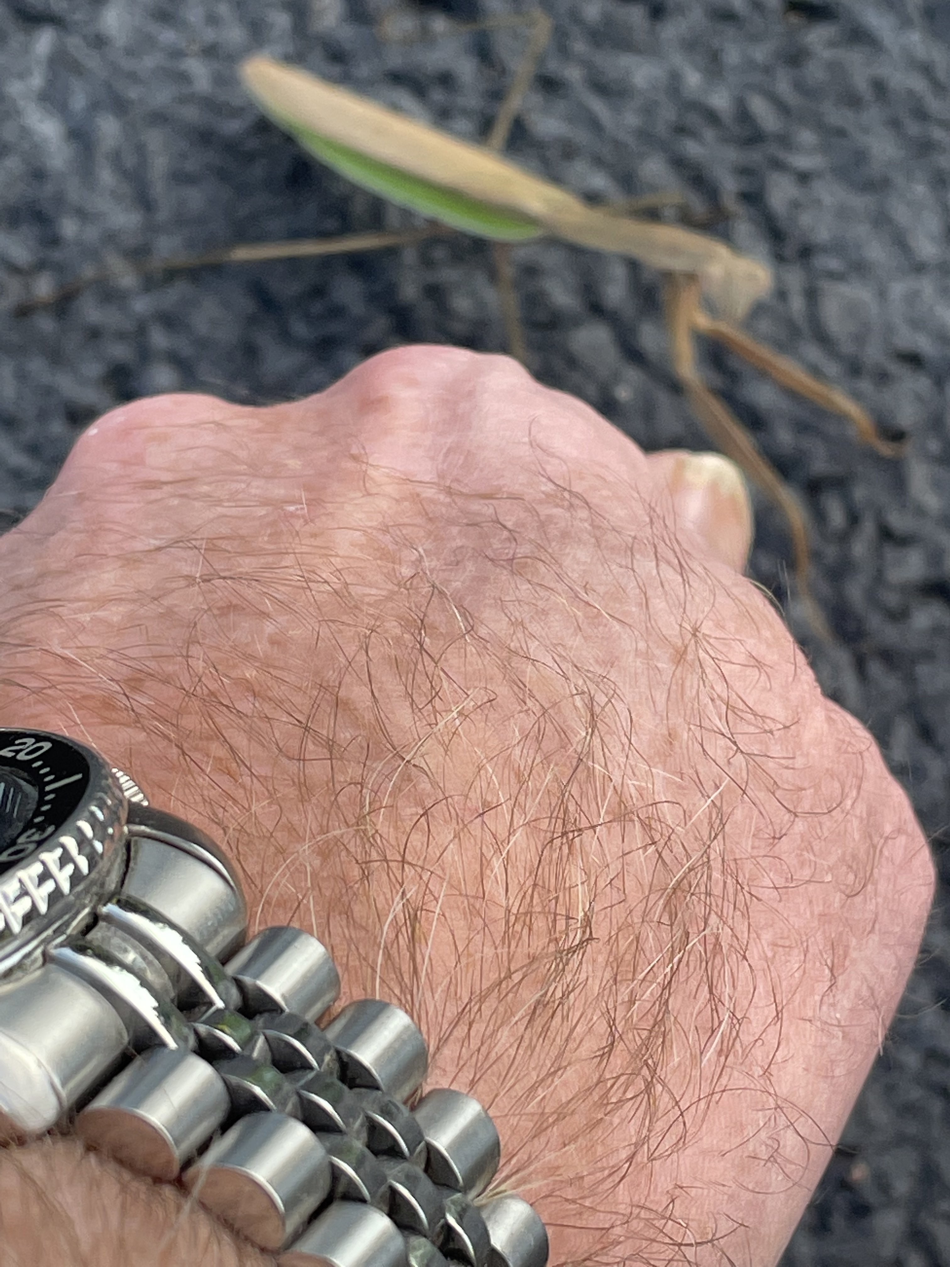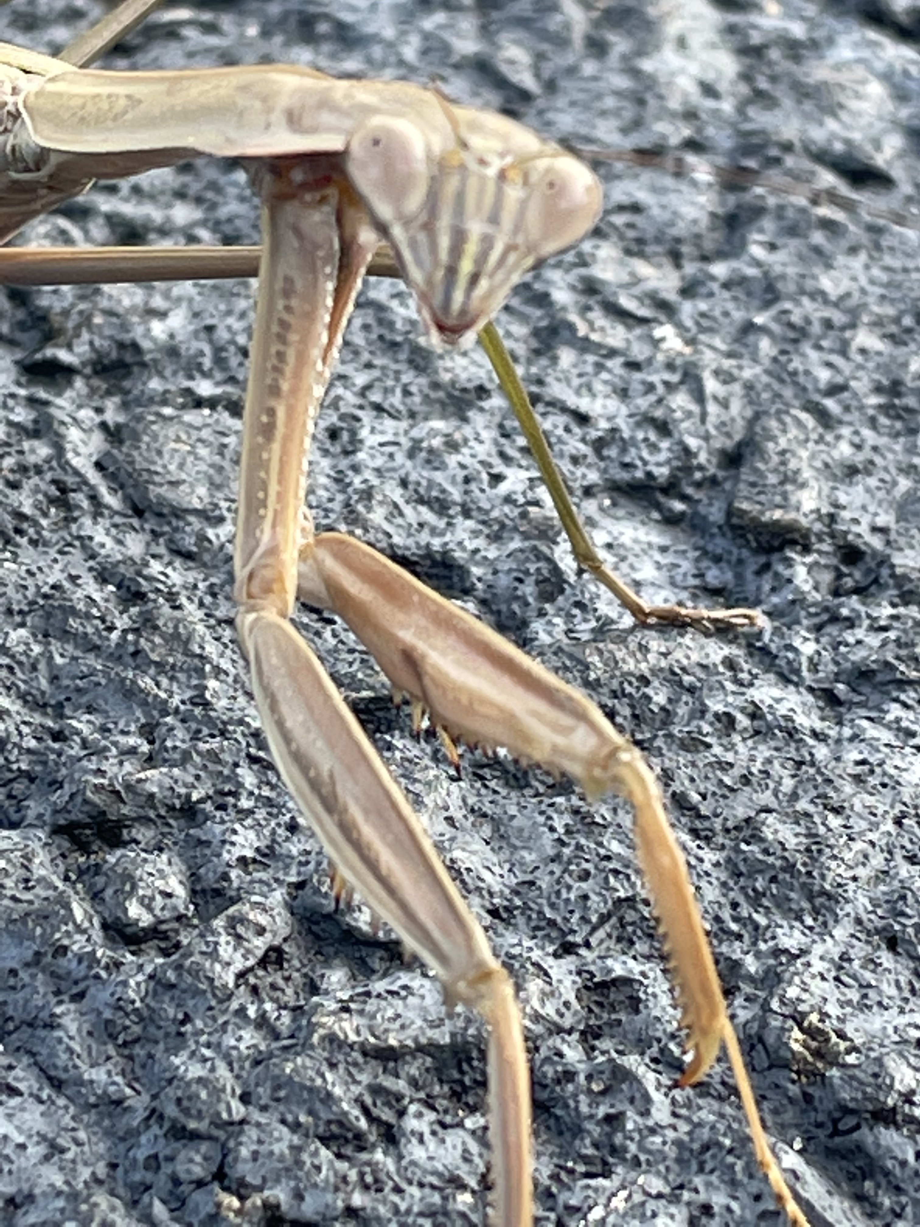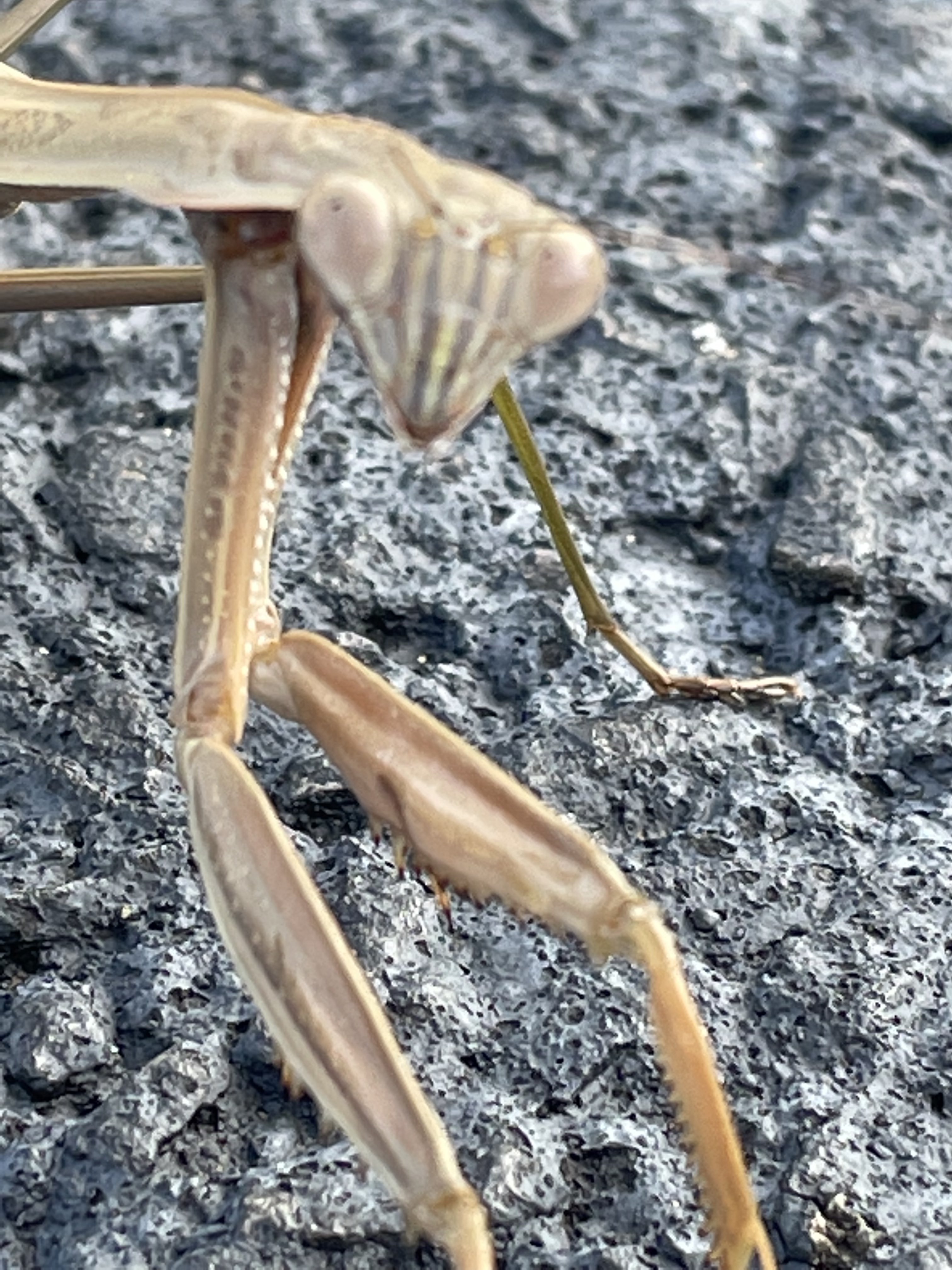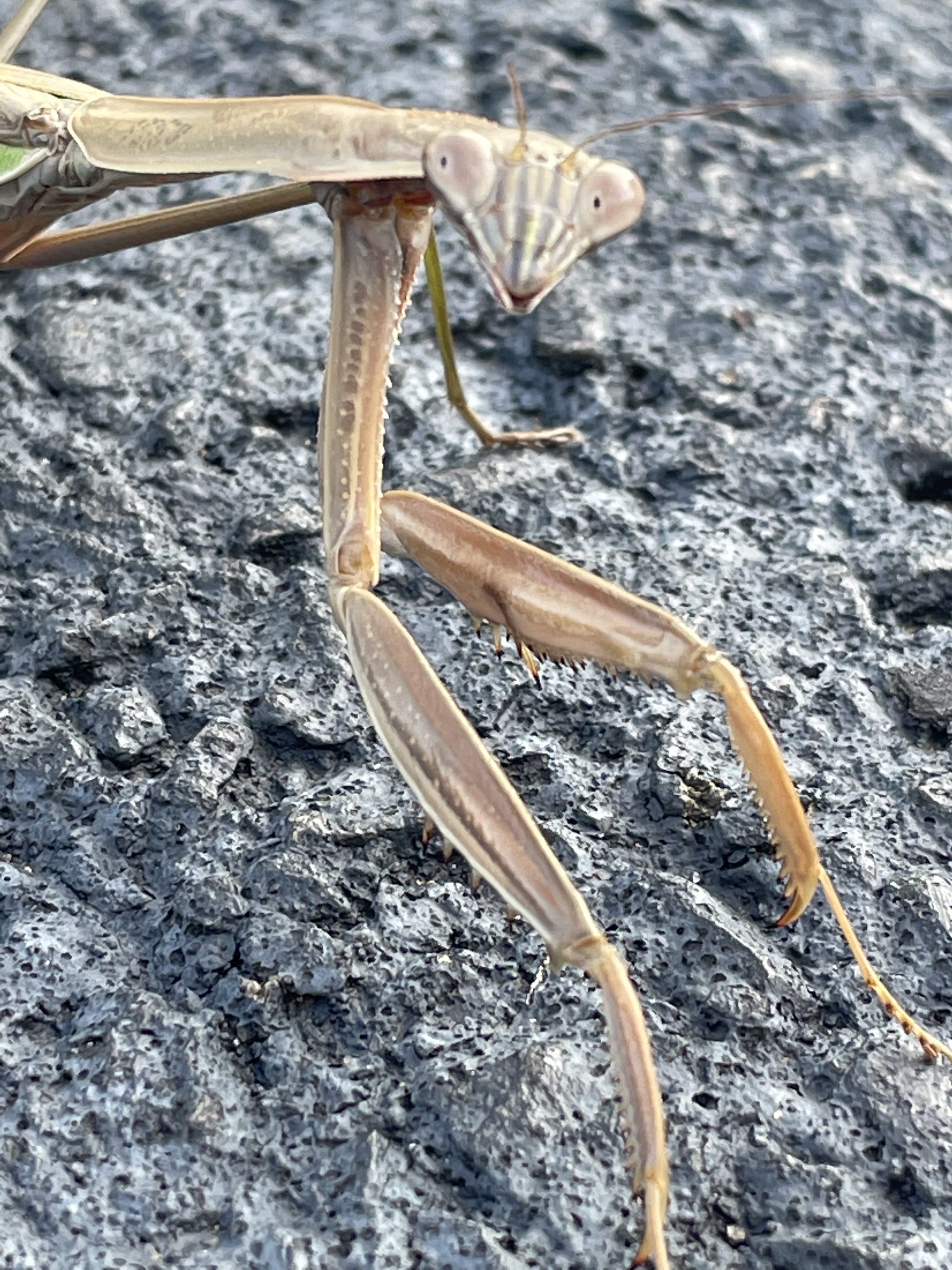 ·Ok this is getting a little weird I just got home and was bringing the garbage can up the drive and my buddy Mr. Mantis is back. I know it’s weird but I pet him. He was in the driveway I don’t want him getting run over so I thought If I tried to pet him like a cat or dog it would scare him off. Instead he walked towards me. Is he an “Australian” mantis and wants to eat me or have we bonded? Is he trying to tell me something? Or is he thinking “why is this dude showing up everywhere I go, is he trying to tell me something? I guess I should name him. Shoot what do I call him. Ah, Kitty. Perfect name. So yes for the third or fifth time now pictures of my pet kitty