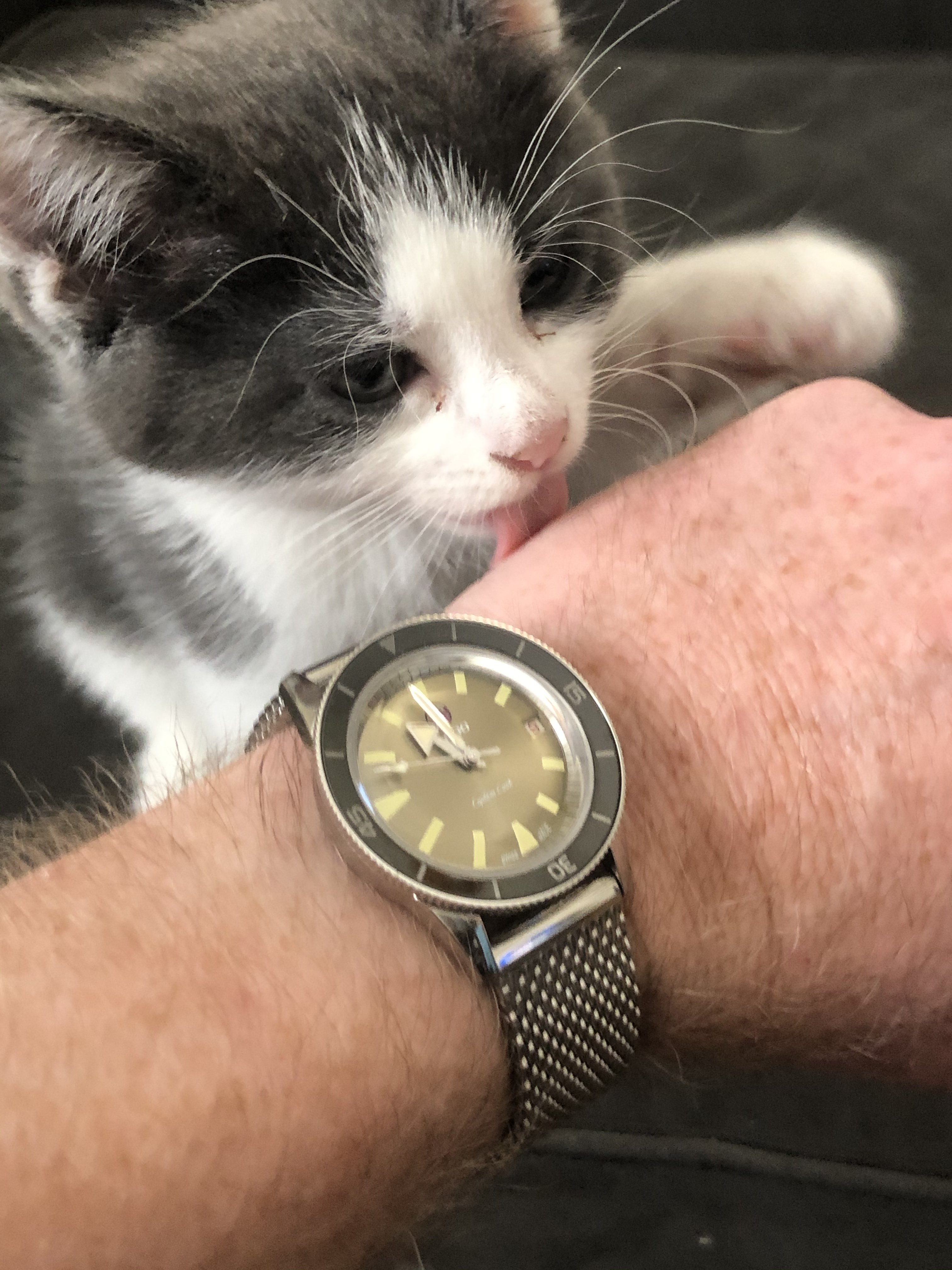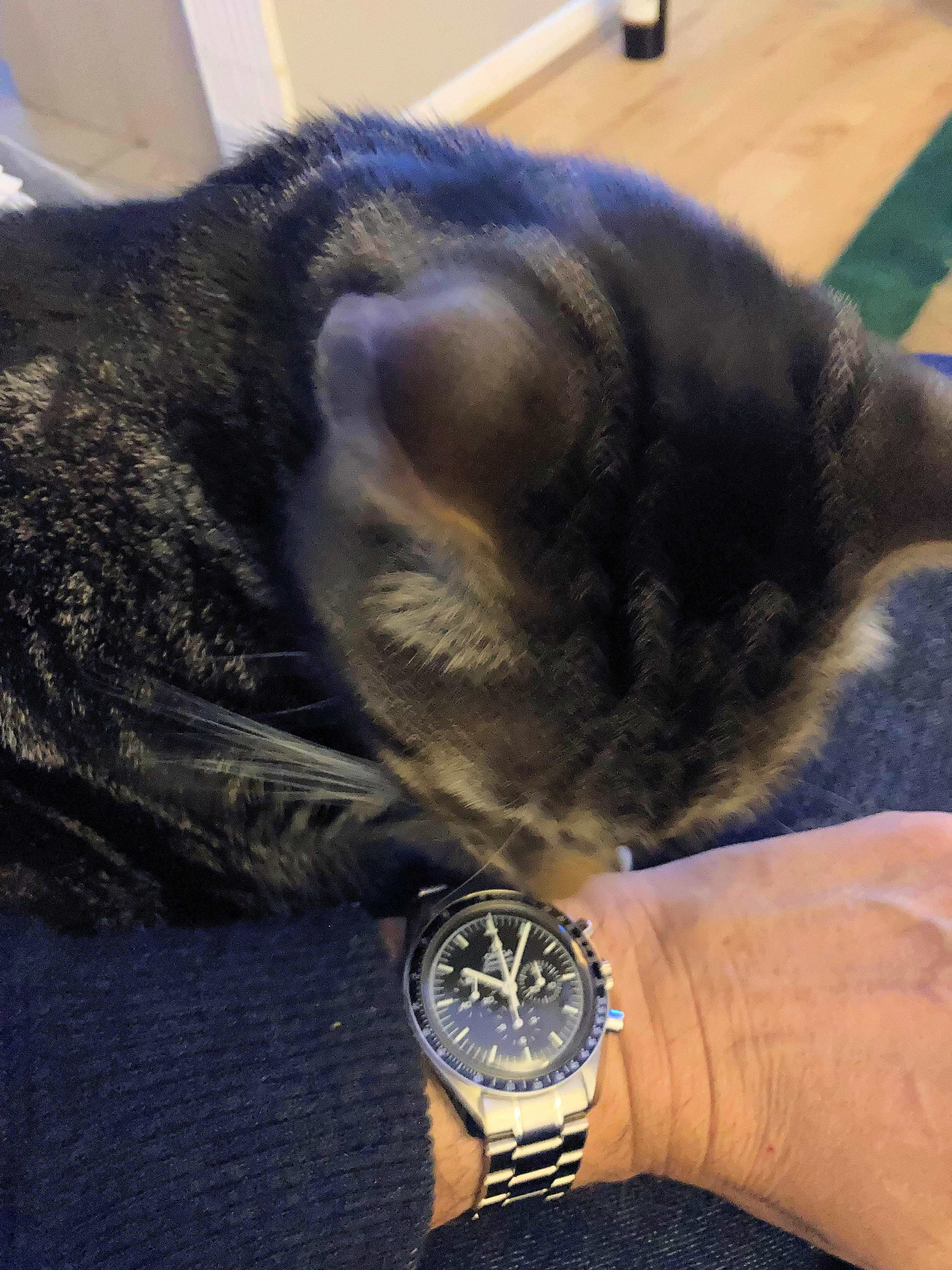 This cat is Crazy (by name and nature). I was out visitng last night and made new friend which they said was unusual for him. I think he liked the watch. Old boy was giving me the what time do you call this / where the hell have you been when we got back.