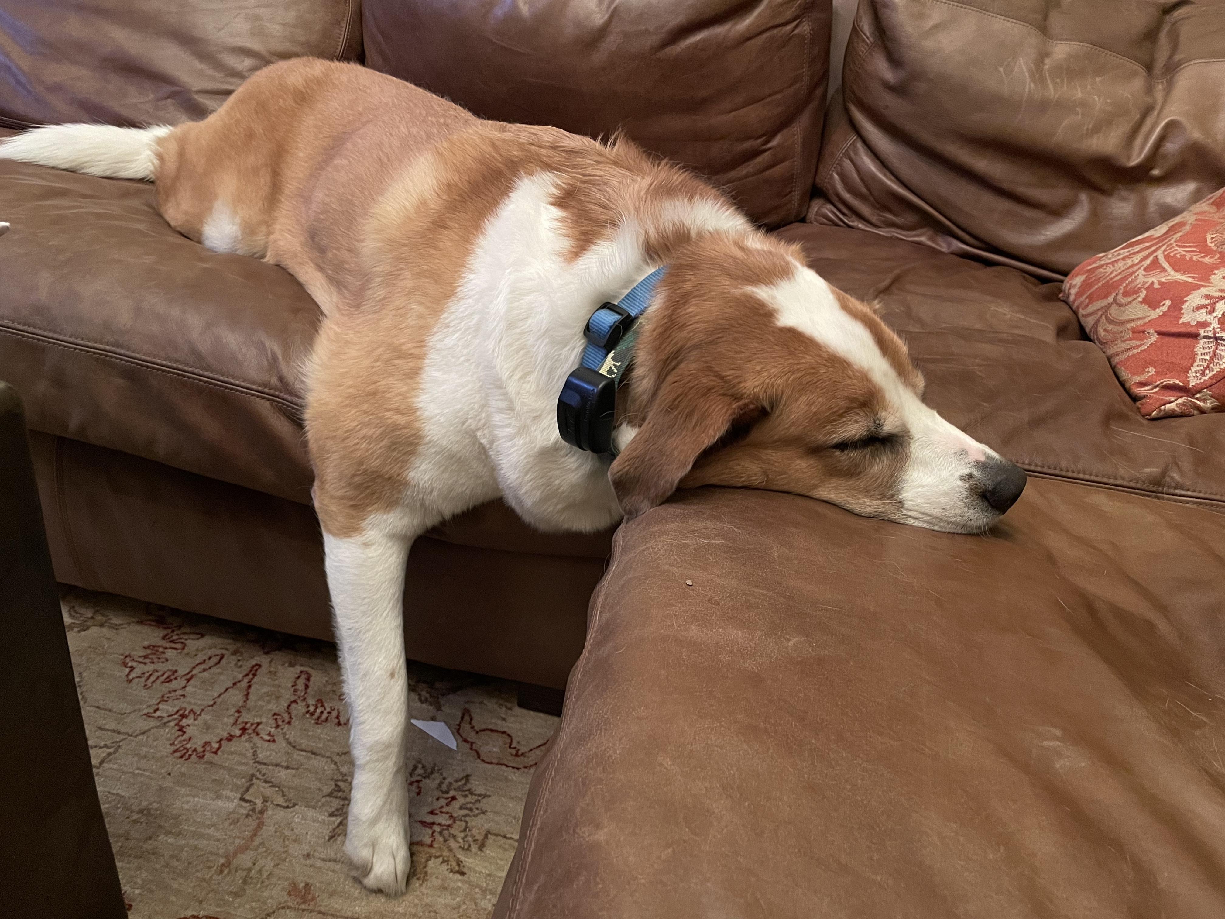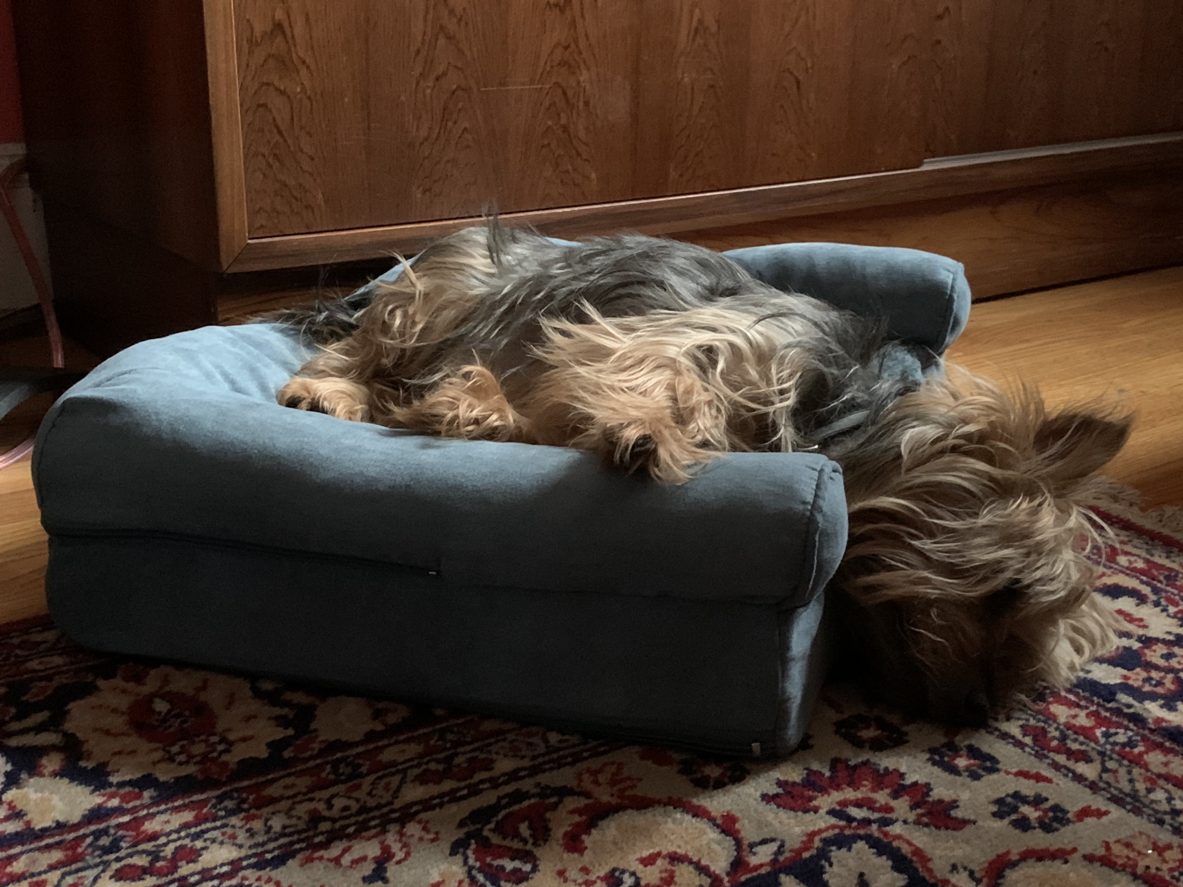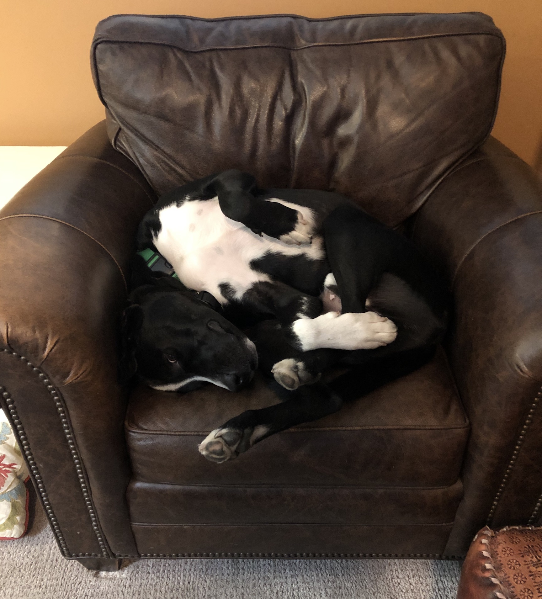 Max is settling in to the family well, and appears to have found a new dog bed. For perspective, this is an 80 lb dog.