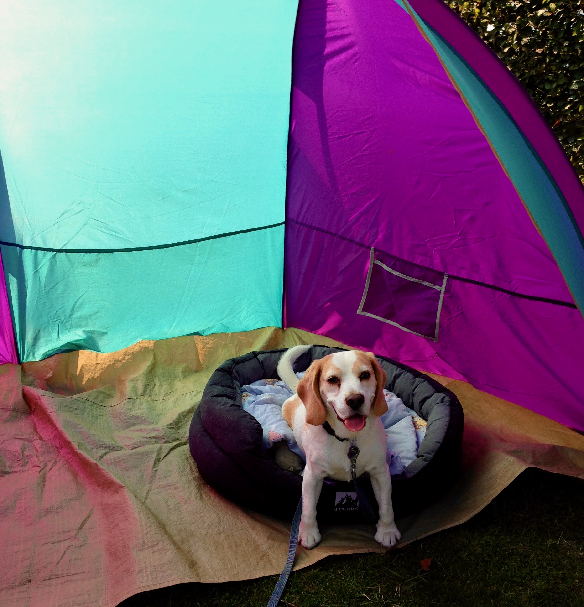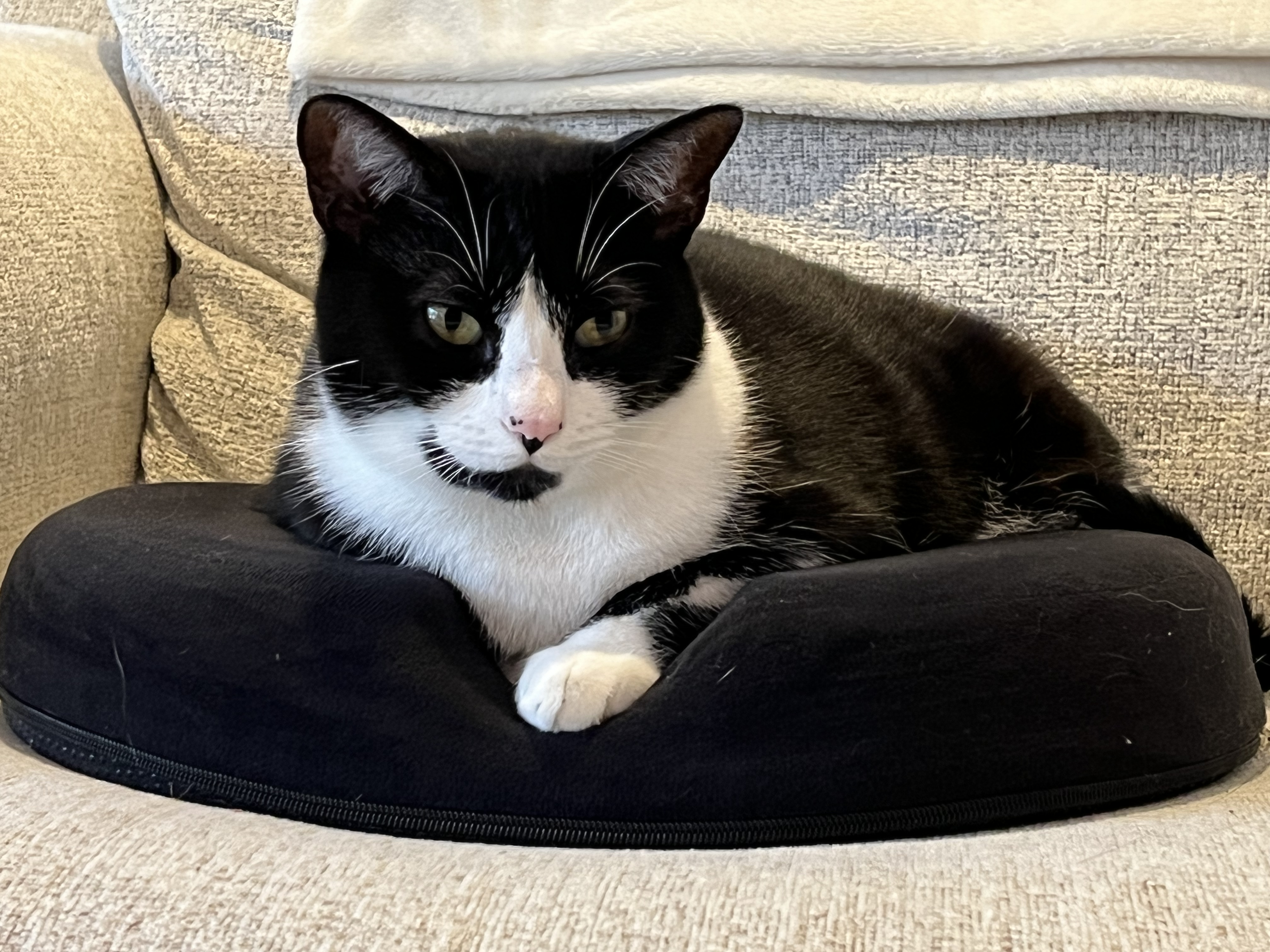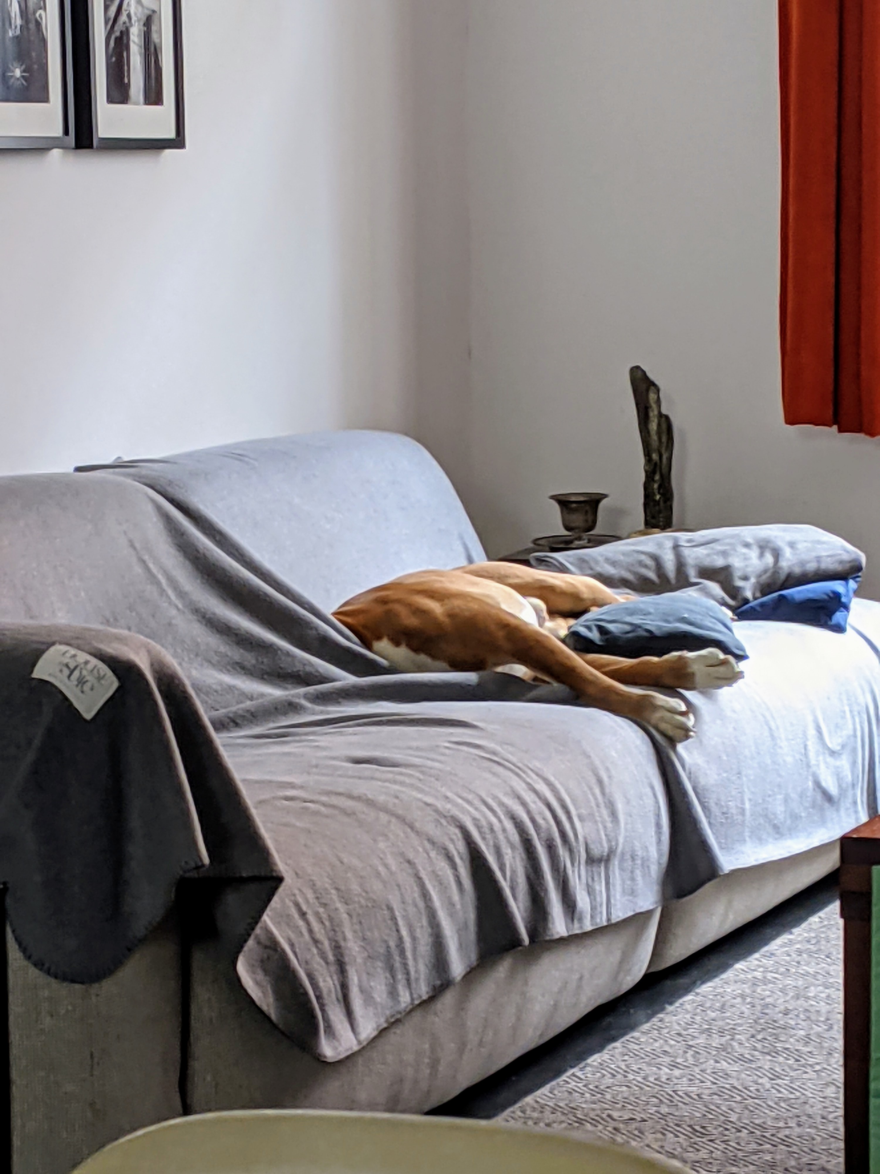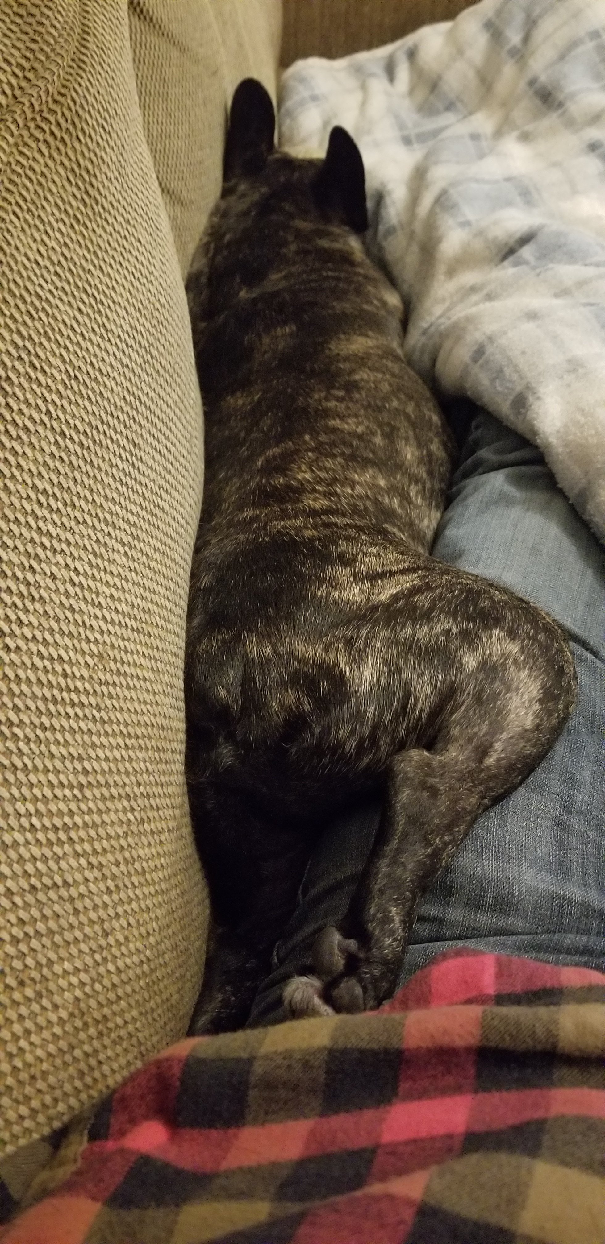 Max is settling in to the family well, and appears to have found a new dog bed. For perspective, this is an 80 lb dog.