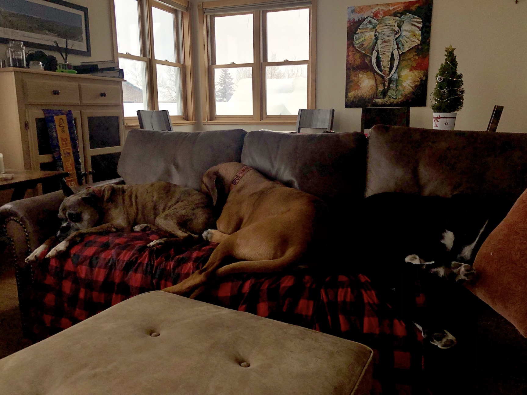 ·Wherever we are, the dogs are monopolizing the couch, currently at our mountain getaway home. We've received more than four feet of snow in the past three days, so there has been a fair amount of couch-time. Mrs. S just returned from taking Max on his first ski adventure, and he is particularly pooped.