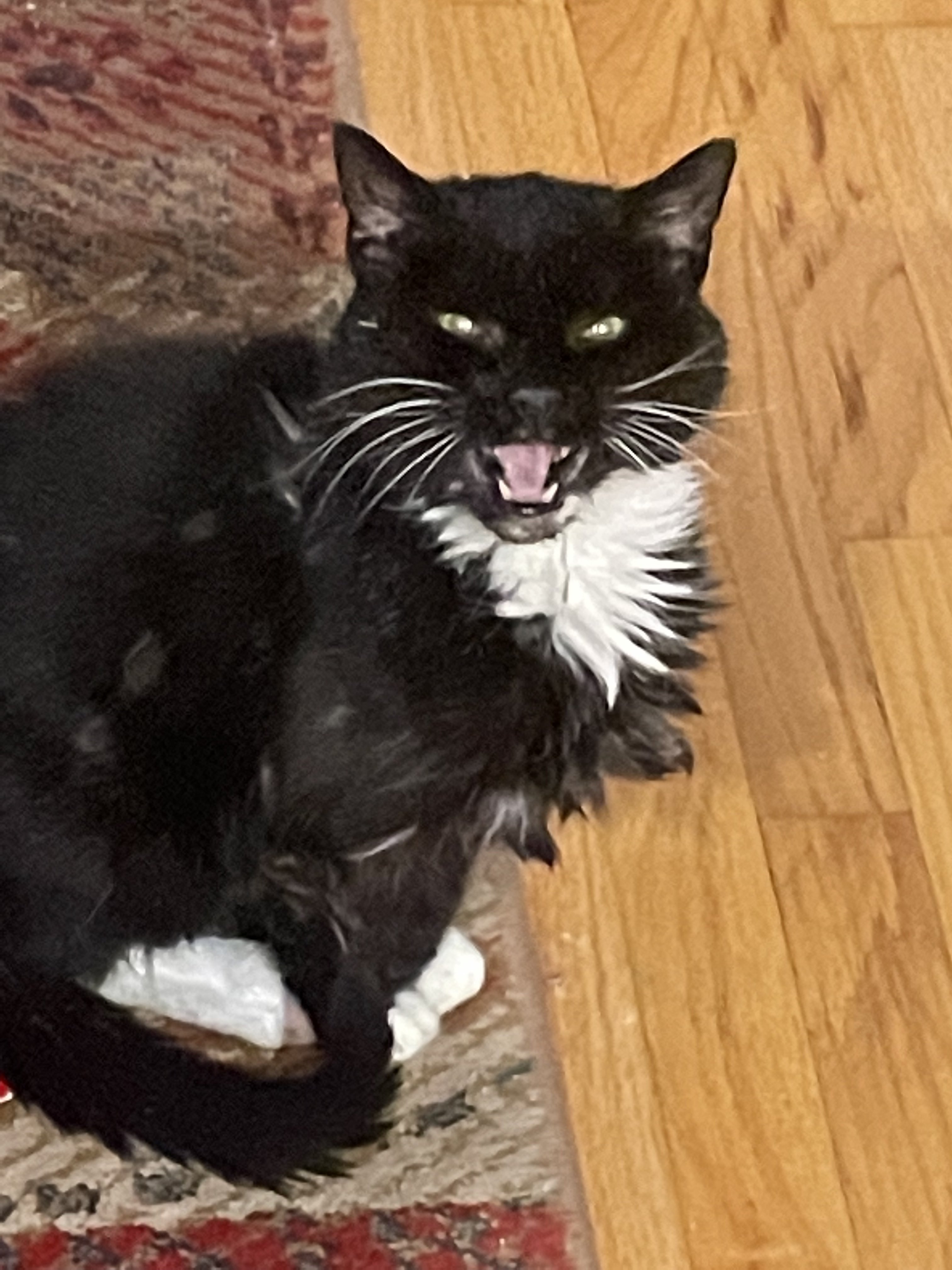 . Although this may look like a vicious picture and she is about to attack and kill the entire household she is simply meowing for food. Right after she knocked back a can of fancy feast.
