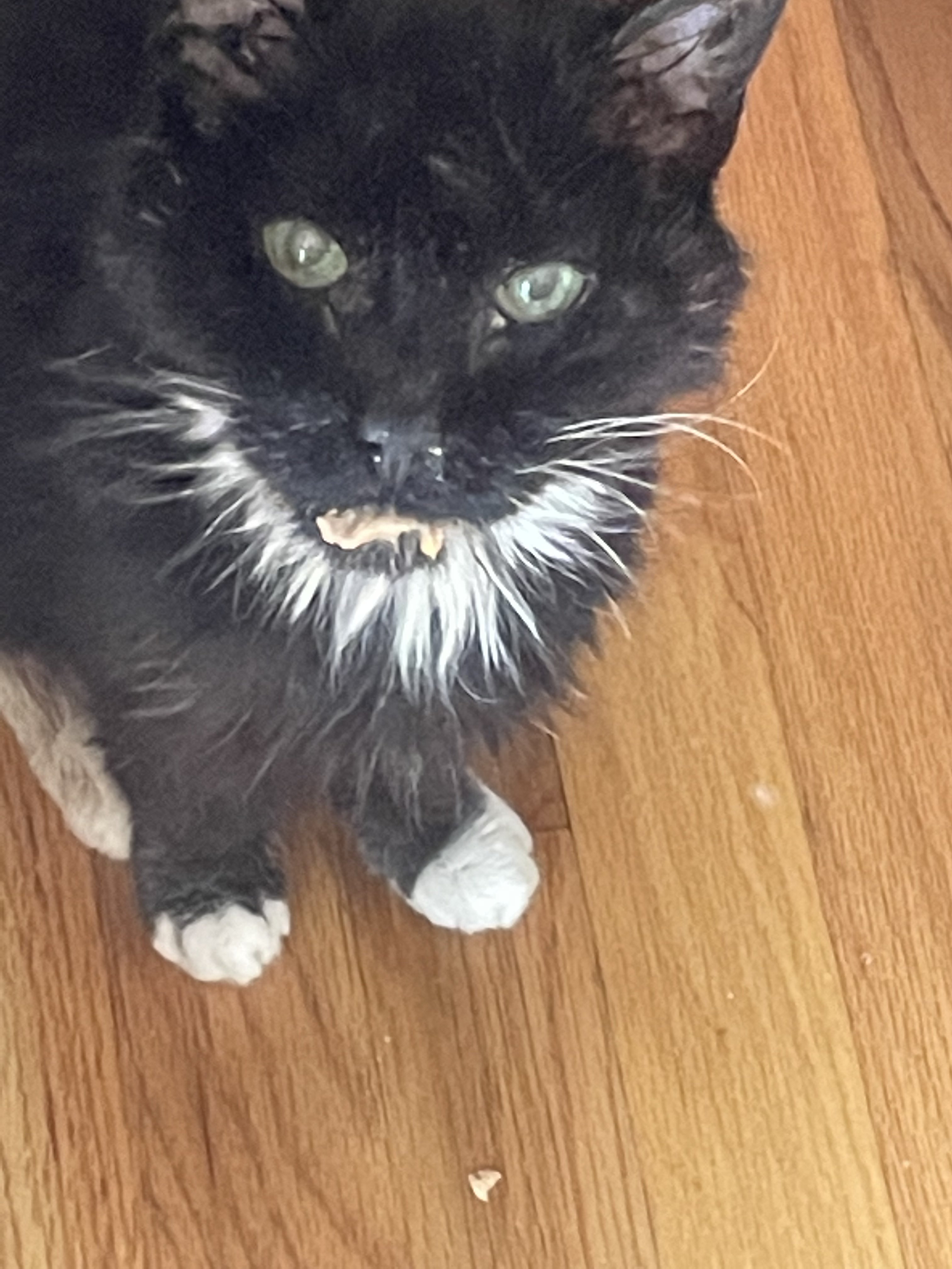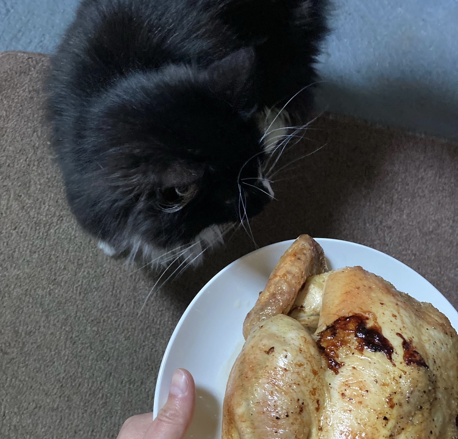 We felt like chicken tonight… and an old cat knows the ropes,. Old Boy unmoved and chilled at the dinner table while Young Girl goes mad in the garage… at the right time Old Boy wakes up and is like… yes smells ready now / prime bits only please :0).