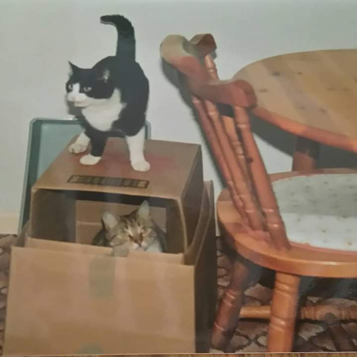 Little un, on top, had kittens when she was only 11 months old but it was her friend Tigger who looked after them.