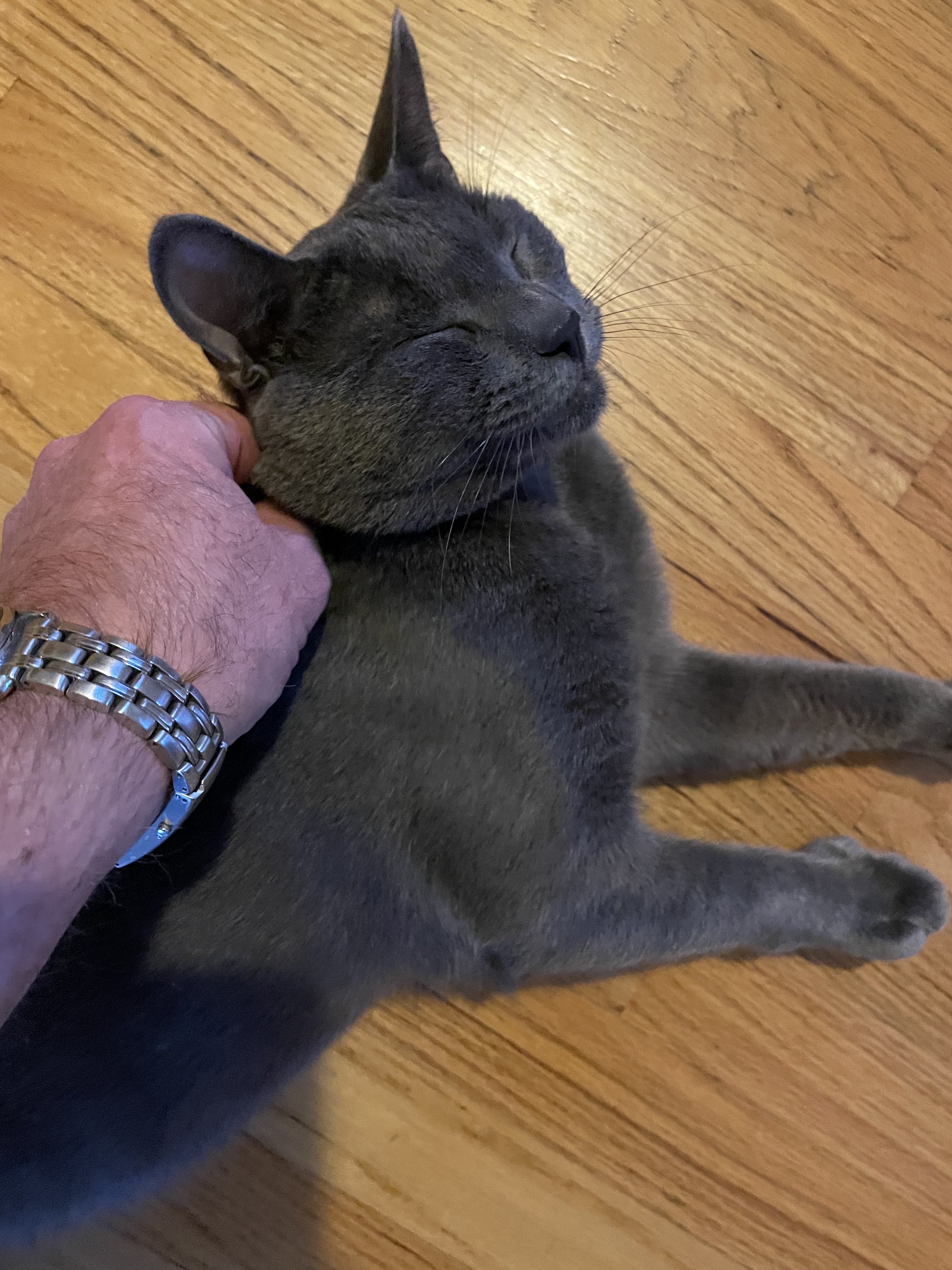 I got two brothers at a rescue. I was not 100% sure they were Russian Blue but looking through the paperwork I found the doctor (vet) wrote “Russian blue” in his notes. I don’t have any other papers but I think with both the look and behavioral characters they are at least half Russian blue, I don’t know if I can say 100% without a dna test and papers all I have is a vet and people at the rescue telling me this. In certain light the blue becomes prominent.