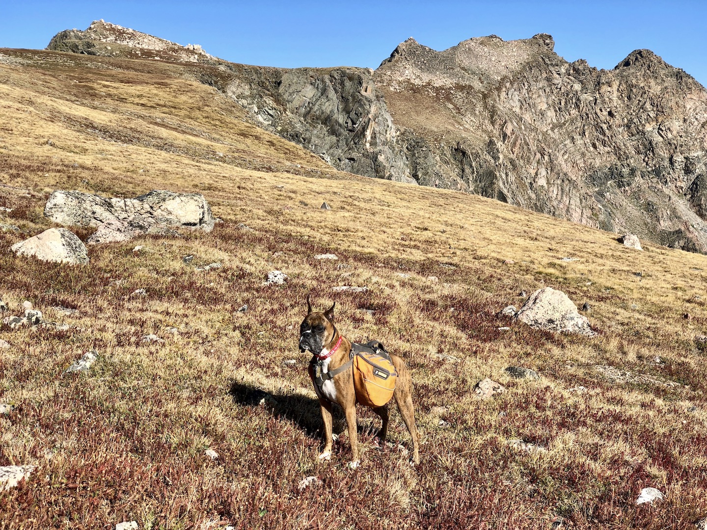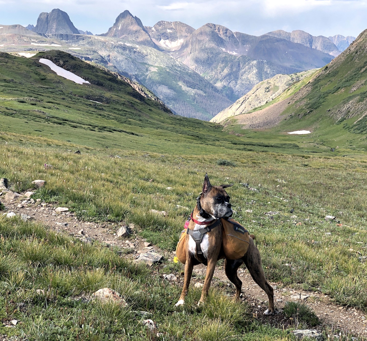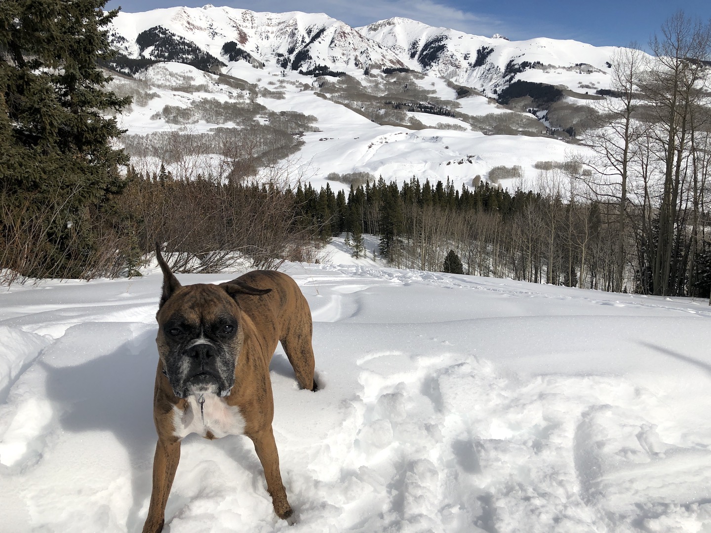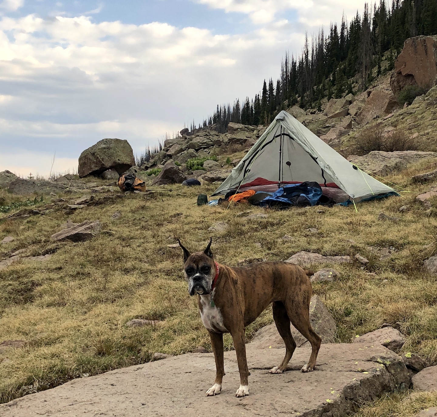 Zelda had an adventurous spirit and lived life with enthusiasm. She had an infectious personality and often made strangers smile with her eye contact and her goofy "jumpies" on our walks around the neighborhood. We traveled thousands of miles together, including hundreds of nights in the Colorado mountains, where she summited peaks, scrambled over boulder fields, forged swollen creeks, bushwhacked through dense forests, and plowed through deep snow. Zelda was our "try-hard" dog, and would not be stopped by any obstacle. She was athletic and agile, but sometimes a bit reckless, resulting in some memorable events, including a double "cut by ski" incident on Christmas Day 2019. I will never forget a heart-stopping moment when she tumbled down a 40-foot cliff, landing hard on a narrow ledge above a sheer 500-foot drop. True to her breed, she was fearless, with a strong prey-drive, and was always on the lookout for wildlife. On a few occasions, these interactions did not go in her favor, most notably with a porcupine, a rattlesnake, a skunk, and a grumpy bull moose. A few years ago, she successfully chased down a mouse on a high alpine ridge, swallowed it whole, and promptly fainted - causing her to keel over and slide down the tundra, fortunately coming to a stop before she reached the edge of a cliff. Terrifying at the time, but funny in retrospect.