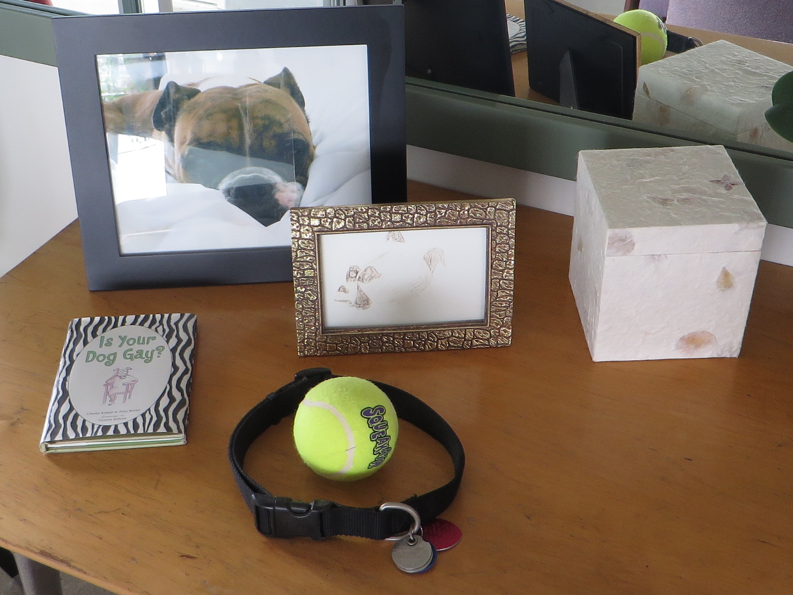 ·We have accumulated a bit of a memorial in our home to celebrate the lives of our five departed canine family members. Cremains, plaster-of-paris paw prints, fur clippings, collars/tags, coats, and favorite toys. My wife says she wants to be buried with these things, but I think she may have forgotten that she also wants to be cremated.