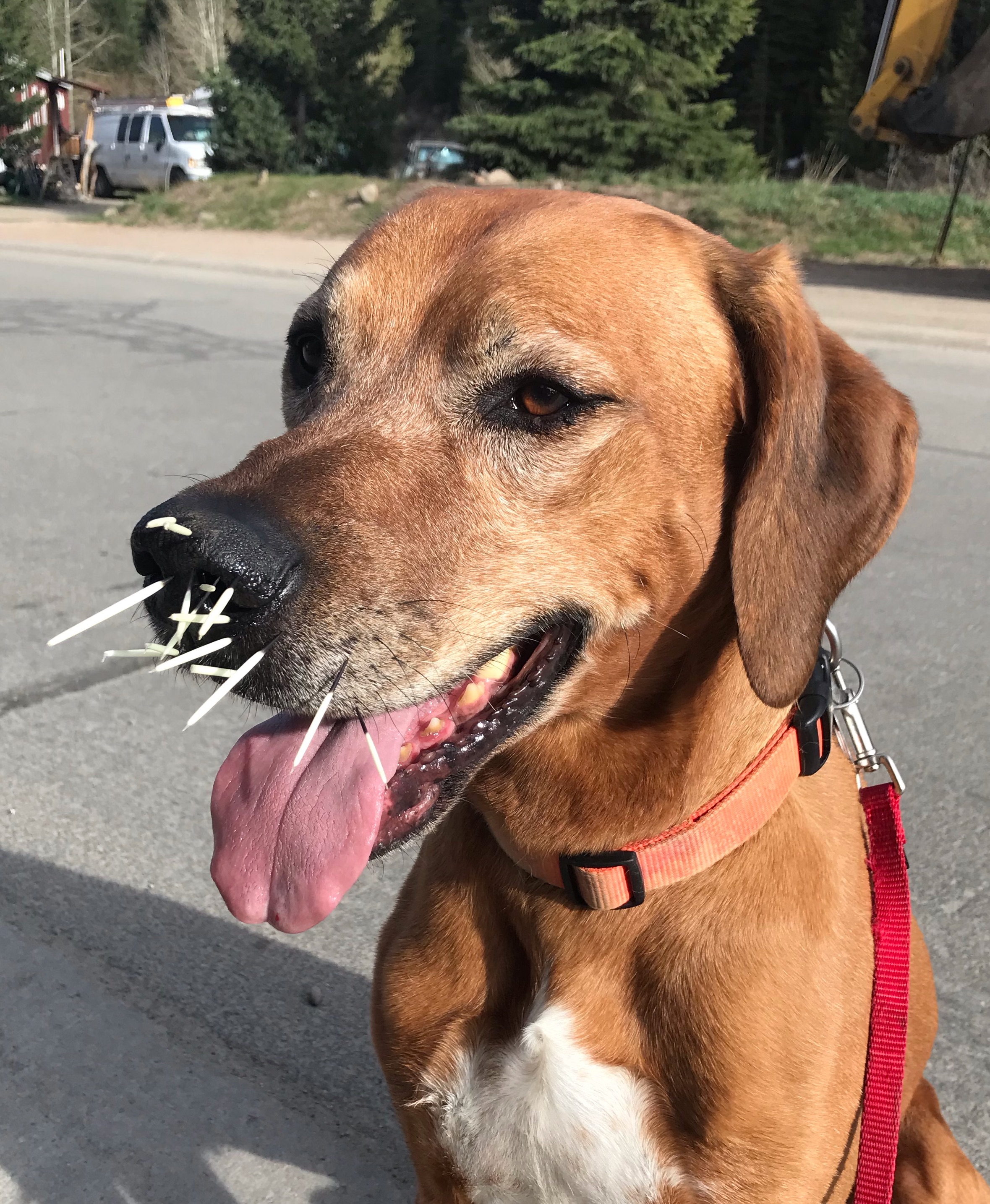 Things like this always seem to happen either deep in the wilderness or on a holiday evening. Opus was with my wife at our place in the mountains, and she wasn't comfortable pulling them out by herself, so she called our local small-town vet, Dr. Laura, who came in to take care of it. At least there were only about a dozen quills. This happened to two of our Boxers (Piper and Zelda) on backpacking trips, and both times there were 40-50 quills all over their faces, chests, and legs. On both of those occasions, the Rhodesian Ridgebacks (Sheba and Lola) were smart enough to keep away from the porcupine, but apparently Opus isn't that smart.