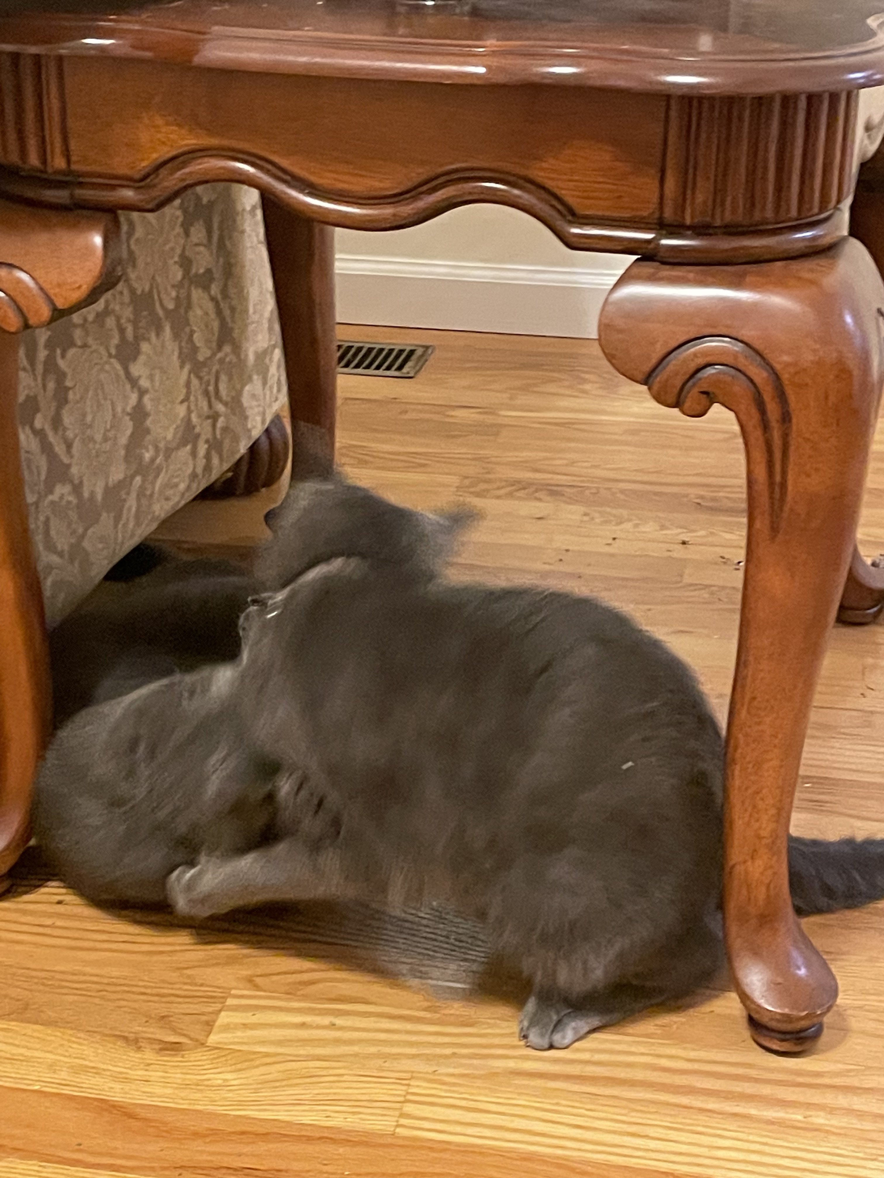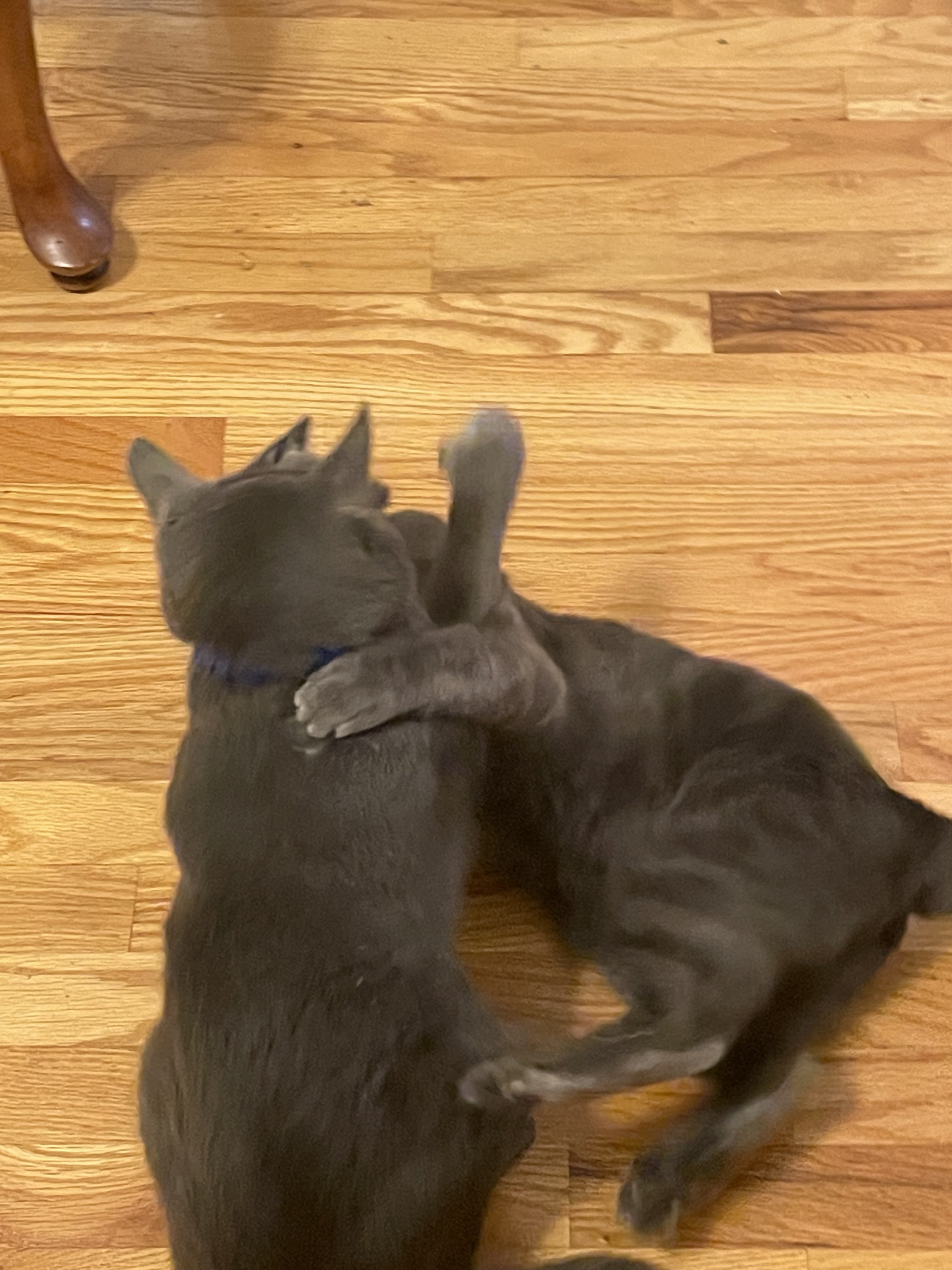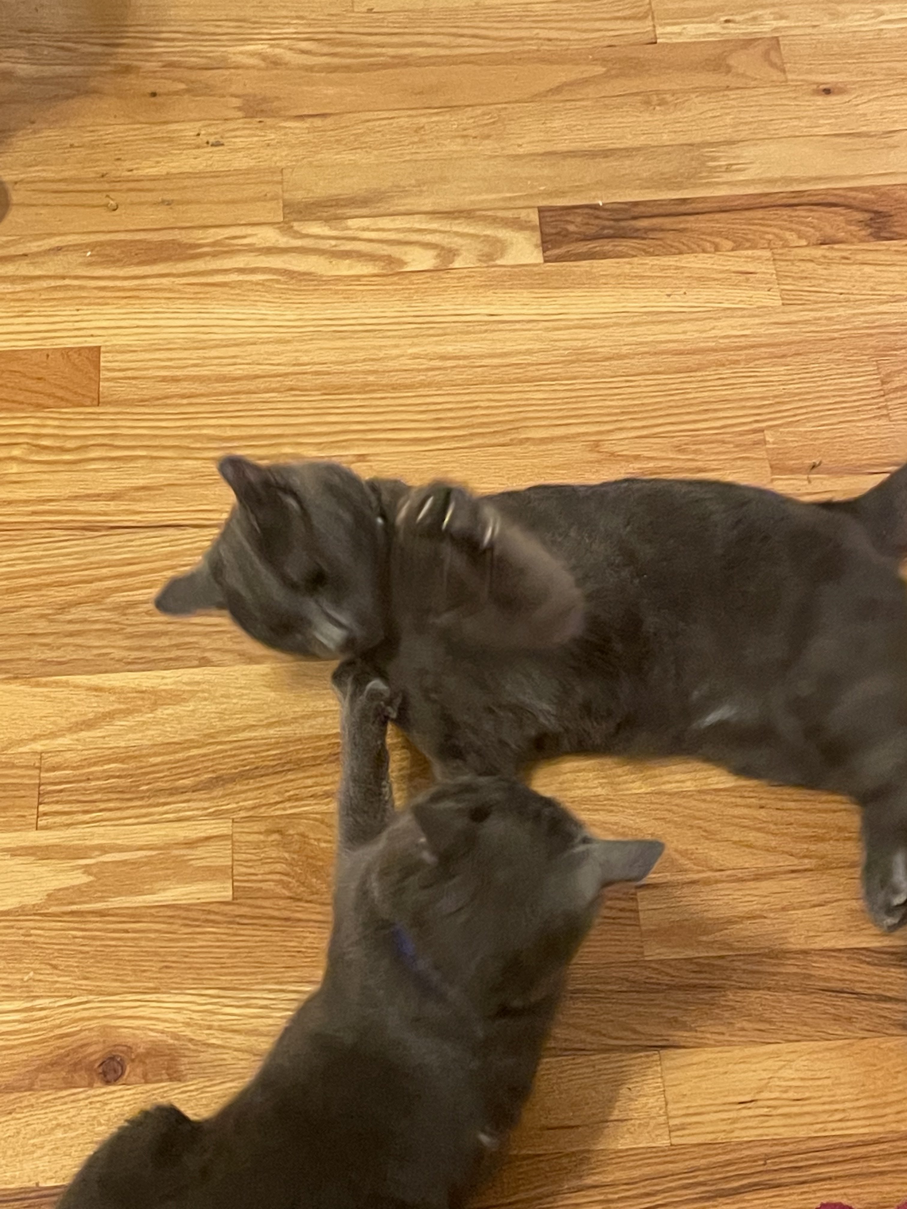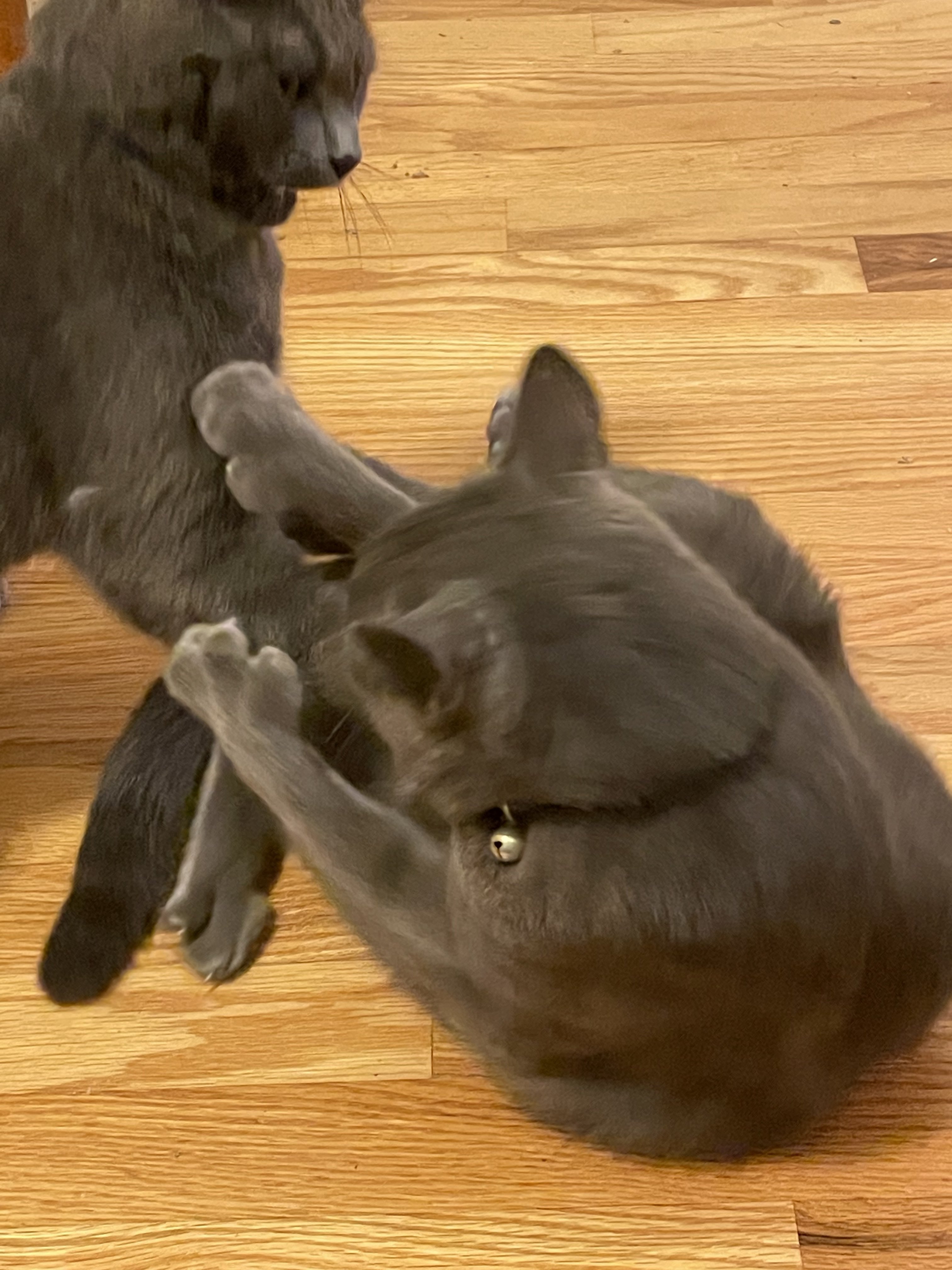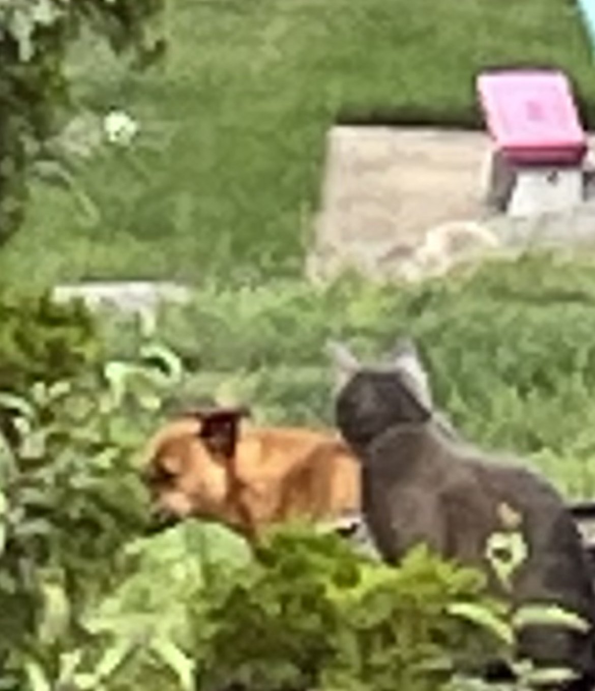 ·It’s hard for me to get a photo of the brothers trolling the neighbors dog. Here is a cropped blurry photo of Maharishi Yogi sitting on the fence and if the dog tries to get a hold of him doggy gets seven claws to the nose. This is a barrel chested dog who probably is five times the weight of Maharishi so if he screws up is timing this could go South fast but they both seem to enjoy this activity.