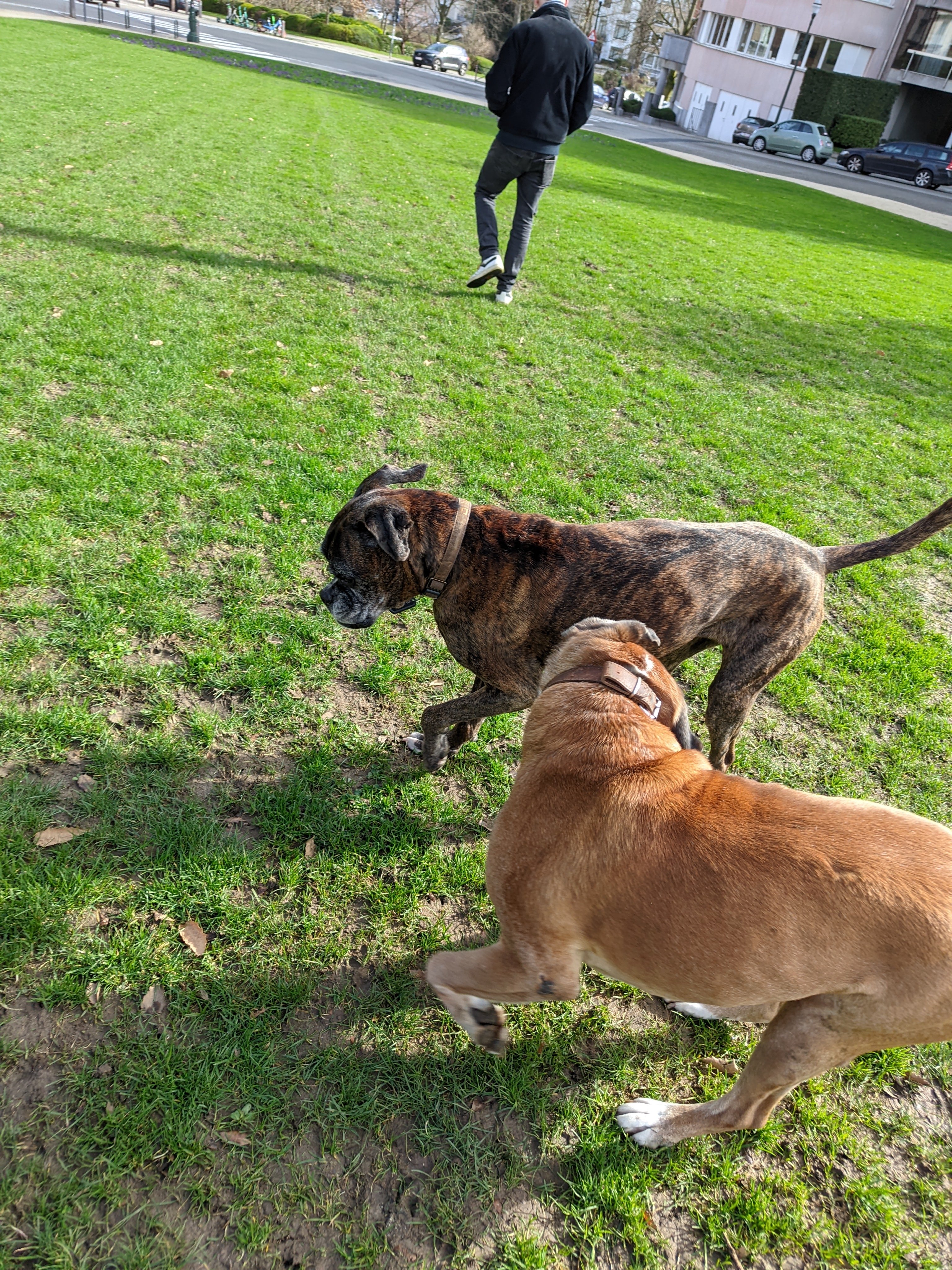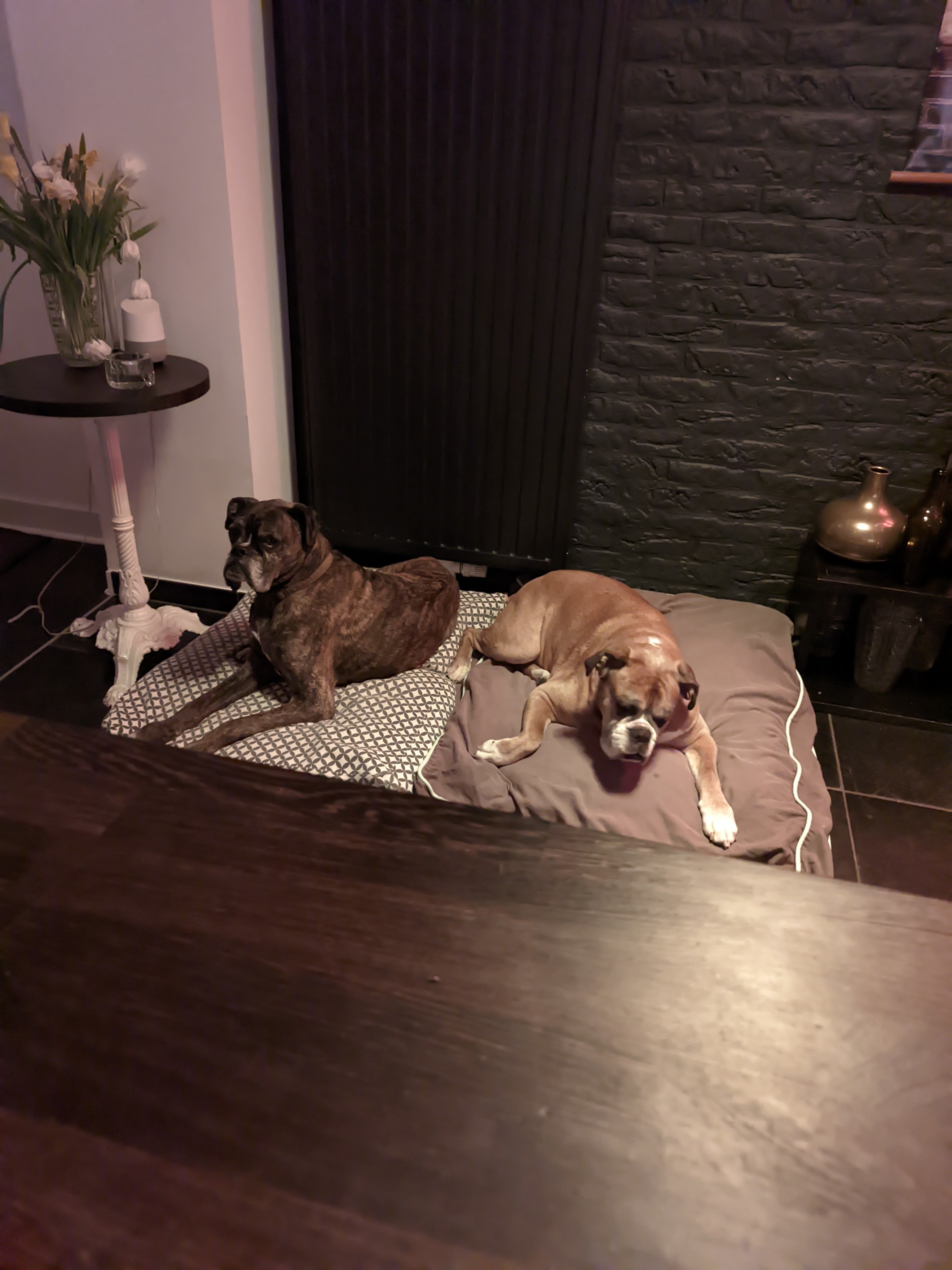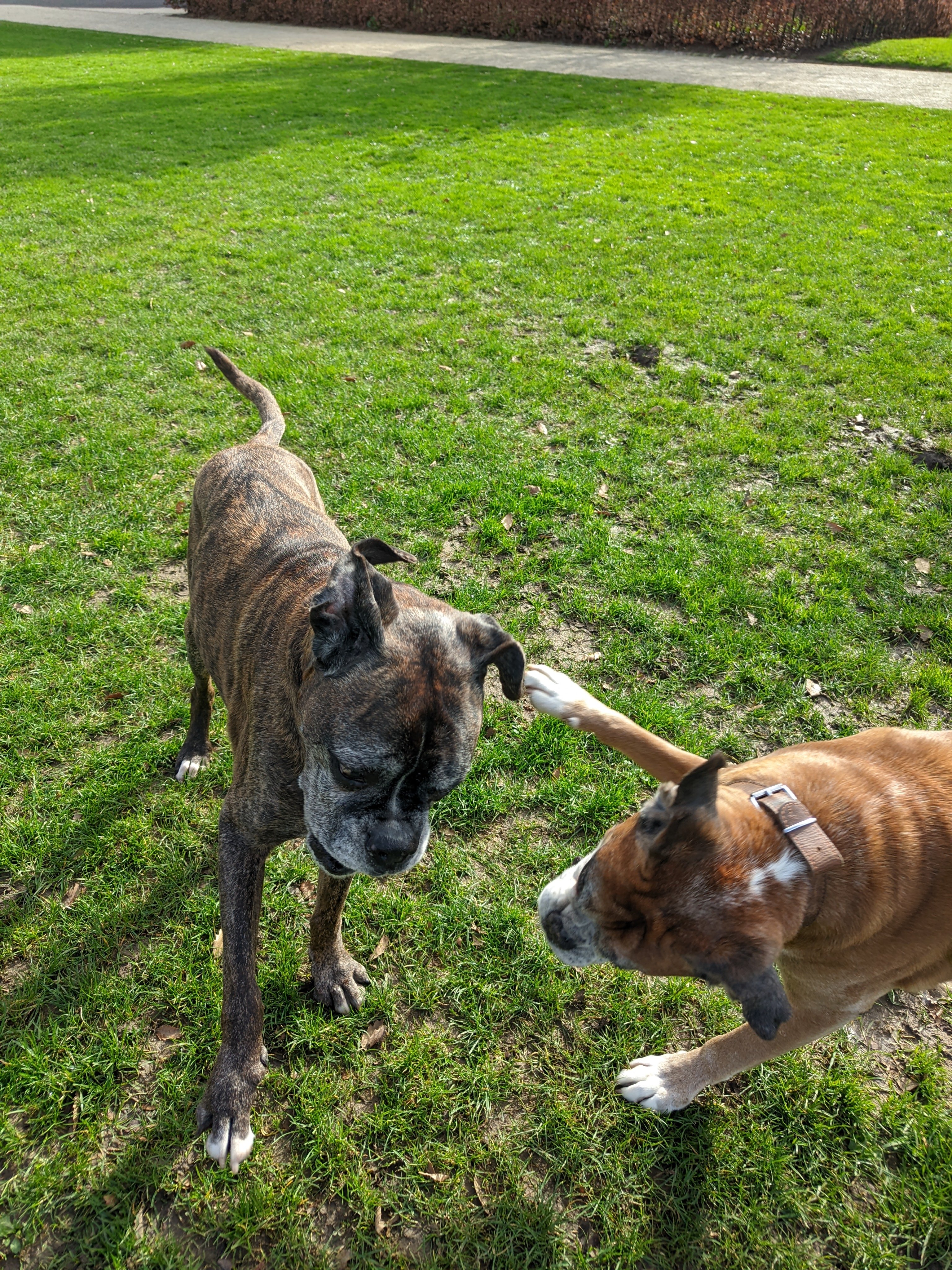 Here are the 2 oldies playing, both 12yo now. We dog-sitted her last weekend or so, while her parents were enjoying some time alone... It does require organising as she takes pills at exact time/hour morning and evening. But Neo enjoys having her around... They're like an old couple 😀