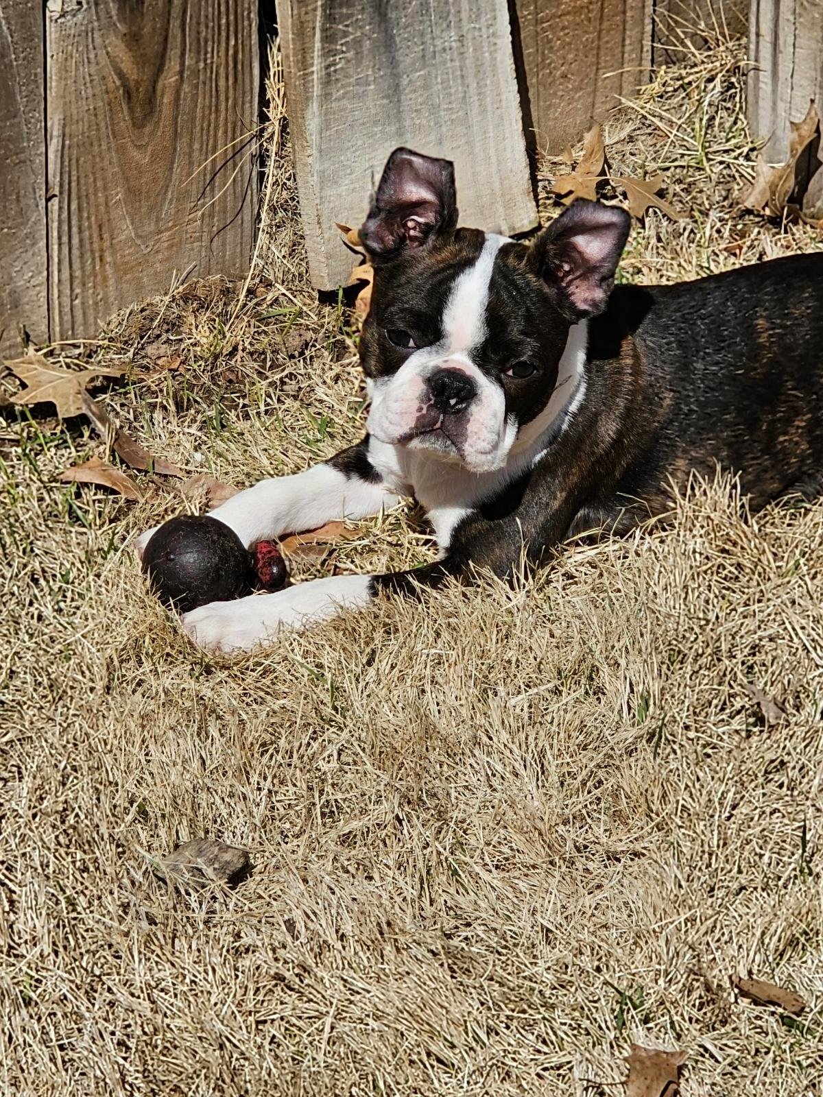 Well...after nearly four years of doglessness we're back in business. A big boy at 6 months and 72 pounds. Very very loving. Not that my seven cats are terribly impressed....the stuff in his ears is dried glue. He had his ears taped while he was crated and transported from his breeder in Va to me in NJ.