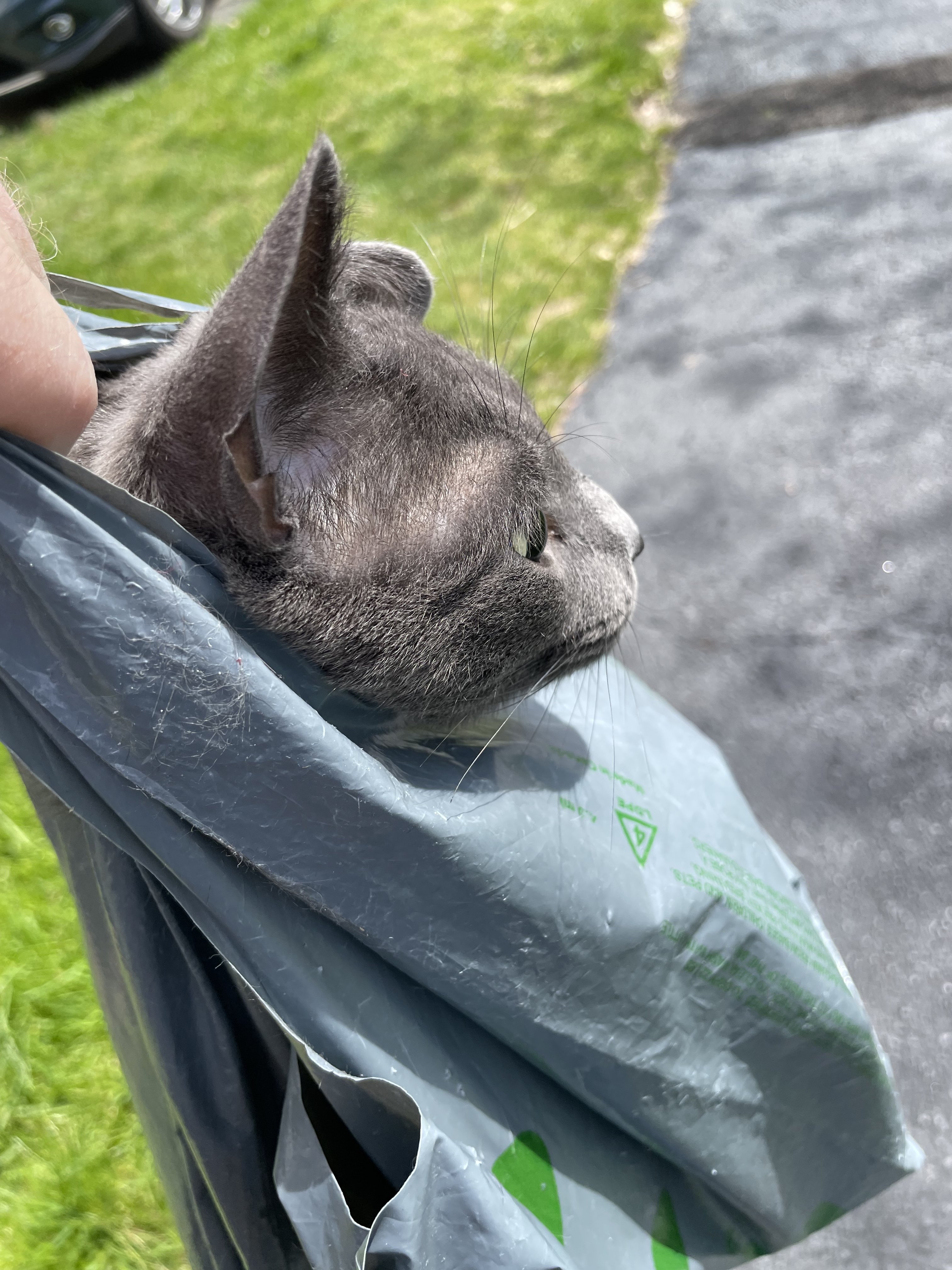 Yes this is strange but with my current living situation I don’t let Rocky raccoon out anymore. He got a thing for bags when boxes aren’t accessible so I walk him around with his head sticking out of the bag. He seems to love it. No chance of suffocating as he put 2,099 nail punctures in the bag.