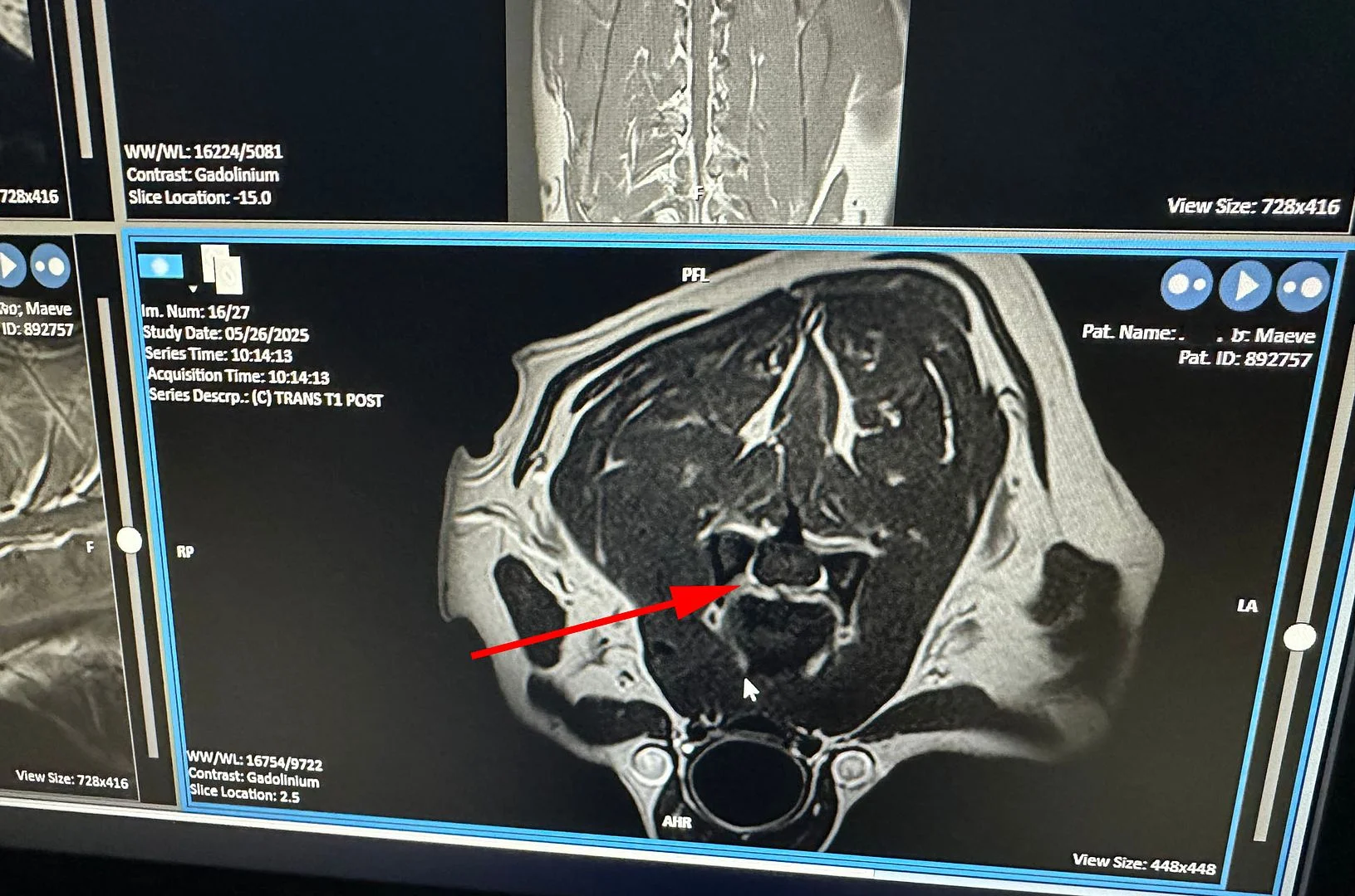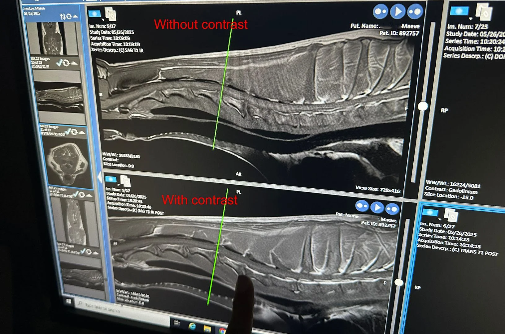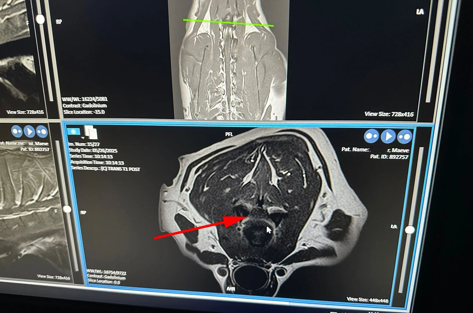 Maeve has been unsteady on her feet for a while, and we took her to see a neurologist recently, and they confirmed she had something going on in the C5 C6 area. We've been through this before, and in the past one of the area hospitals allowed use of their research MRI on weekends for veterinary purposes. Since covid that has been shut down for some reason, so that's why we were on the road to a clinic 2 hours away. Maeve needed X-rays, MRI, and sampling of spinal fluid. Top panel is without contrast and bottom panel is with contrast injected: