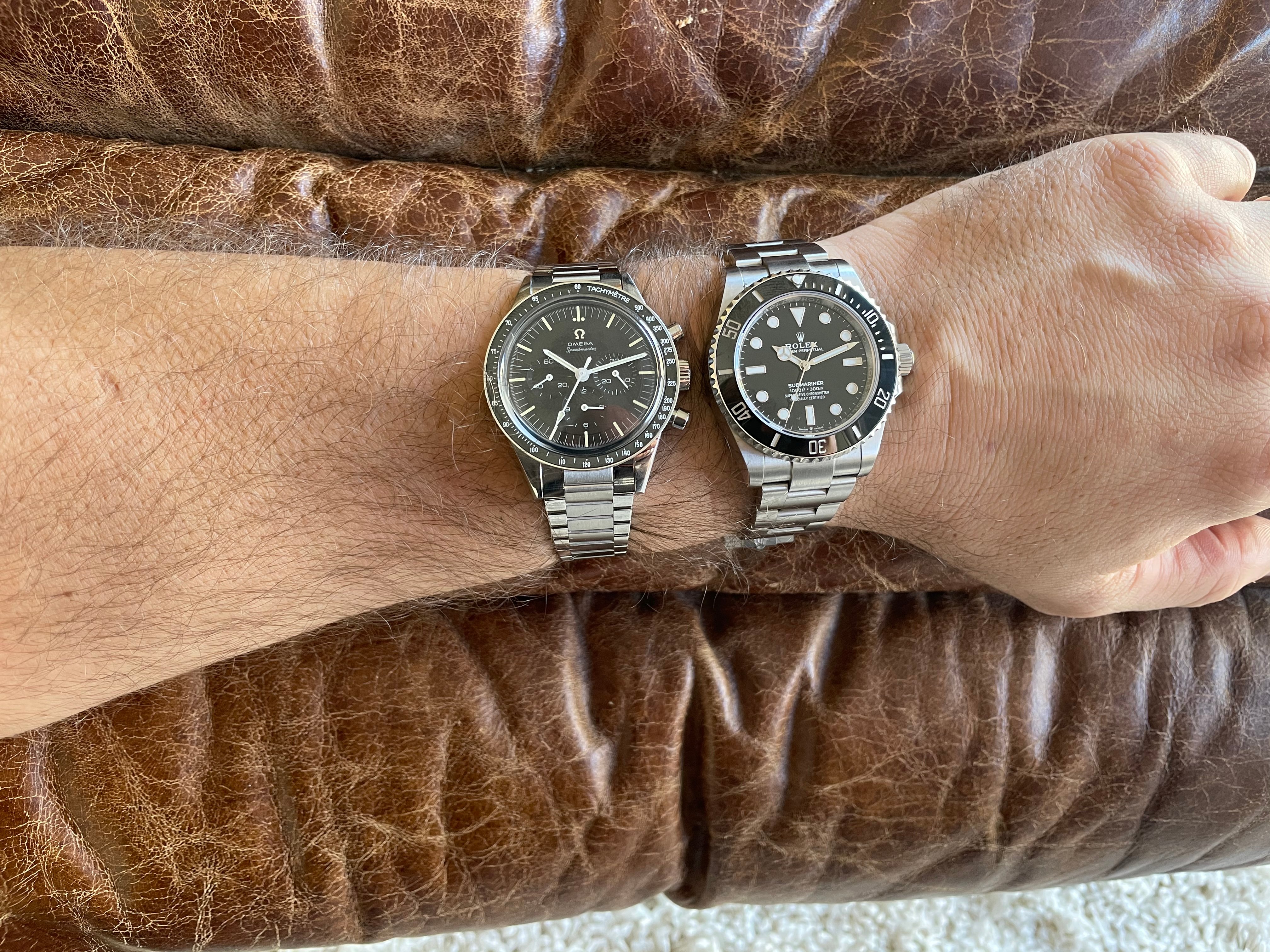 For comparison is the 39.7mm cal.321B next to a 41mm 2020 Sub. Due to the Sub’s bezel-to-dial proportions, the 41mm Sub I find wears smaller than its on paper measure; conversely, for the same reasons but reversed, the thin-bezeled 39.7mm cal.321B in black-on-black wears larger than its on-paper measure. (The tapering of the cal.321 bracelet also perhaps provides a visual amplification of the head size.)