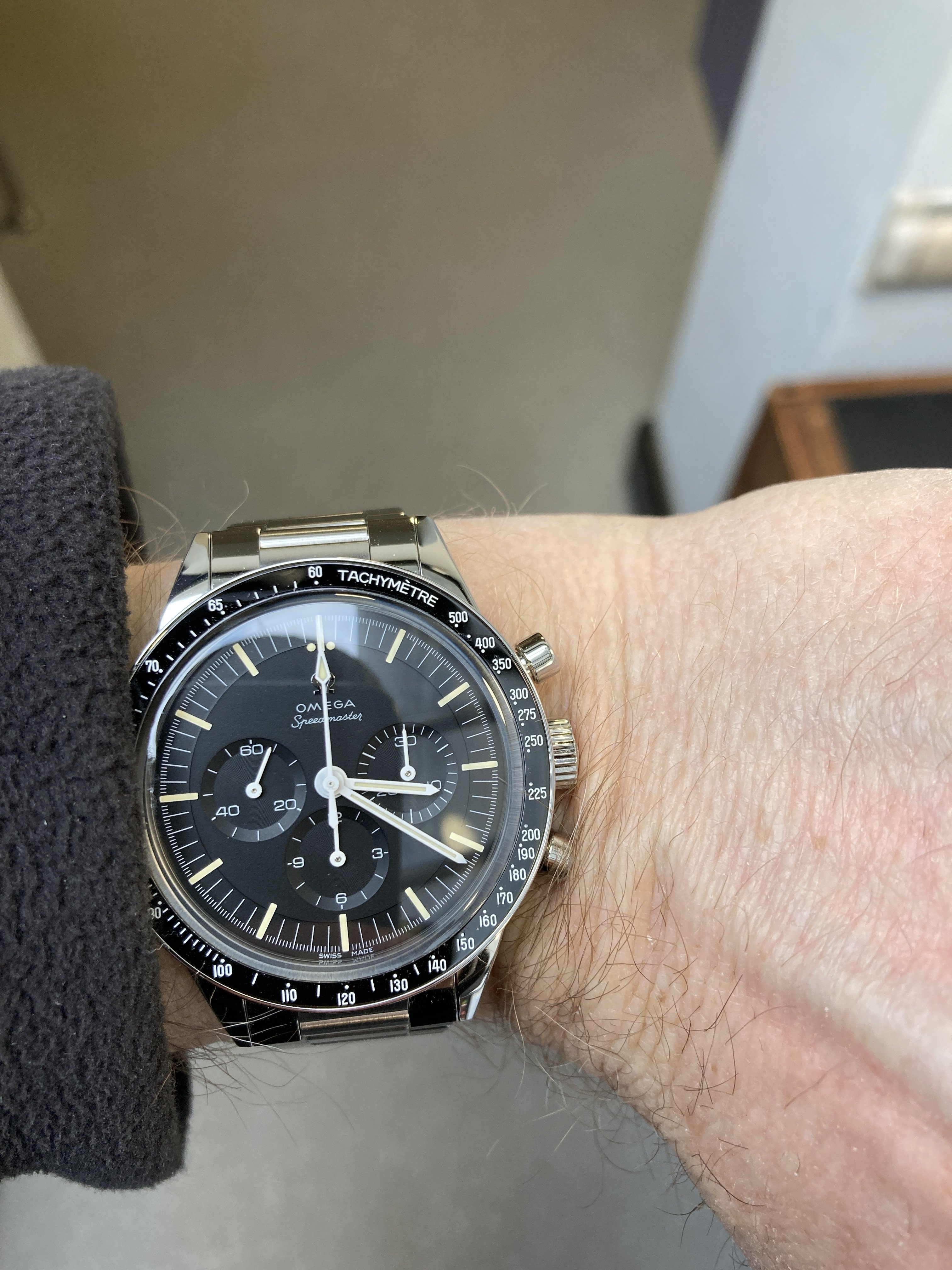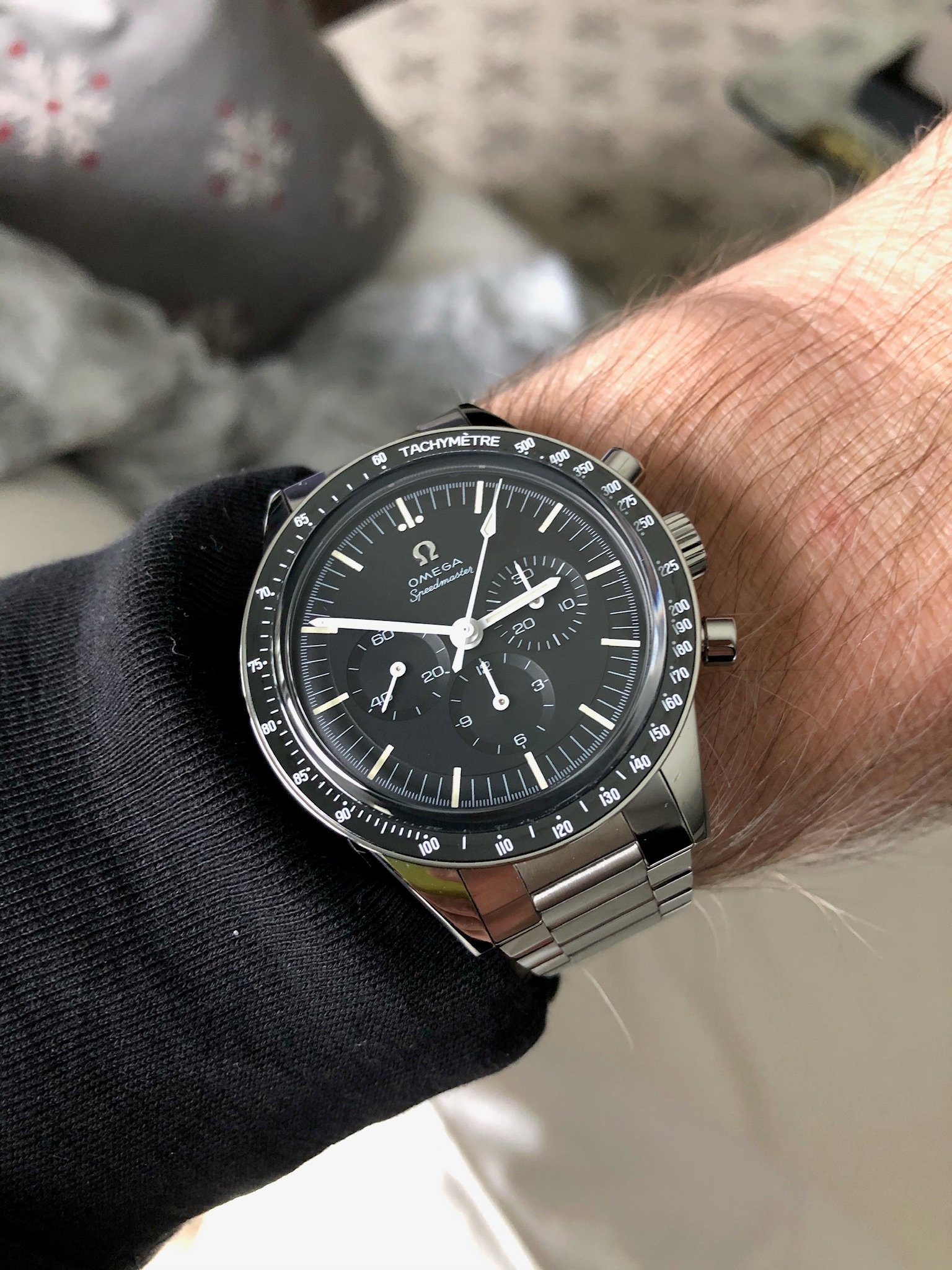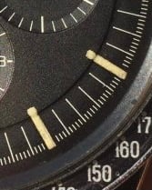 The black-on-black of the cal.321B provides a larger visual footprint than does the black-on-white of the Tokyo 2020 Panda. And in this comparison, the straight lugs of the cal.321B does its normal thing of seeming to enlarge the footprint.
