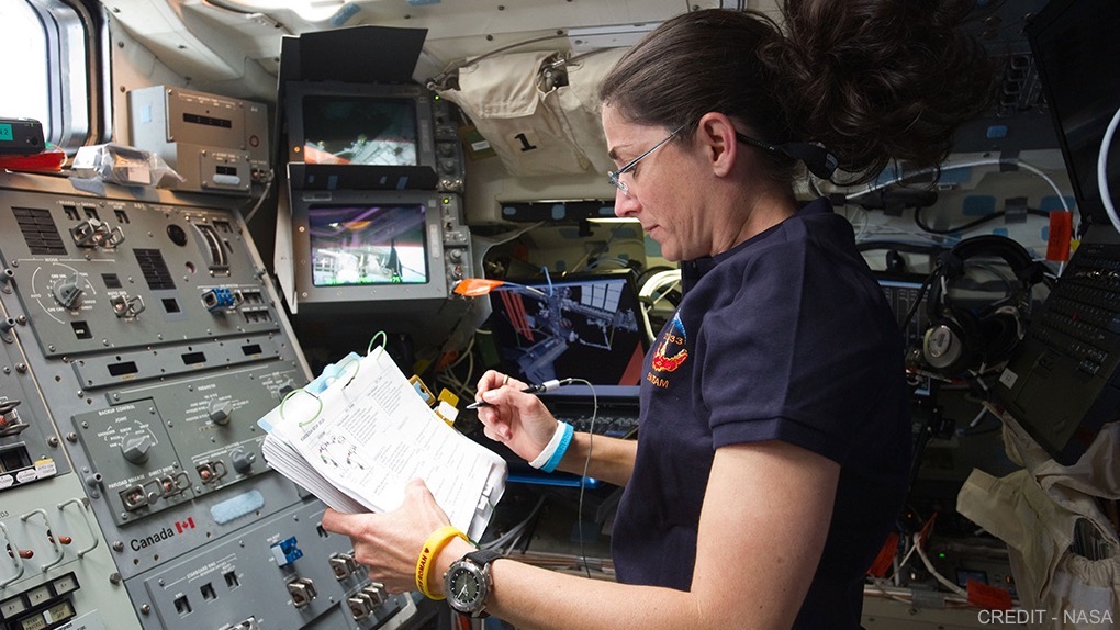 Mission Specialist Nicole Stott and her X-33 working on Discovery’s aft flight deck.