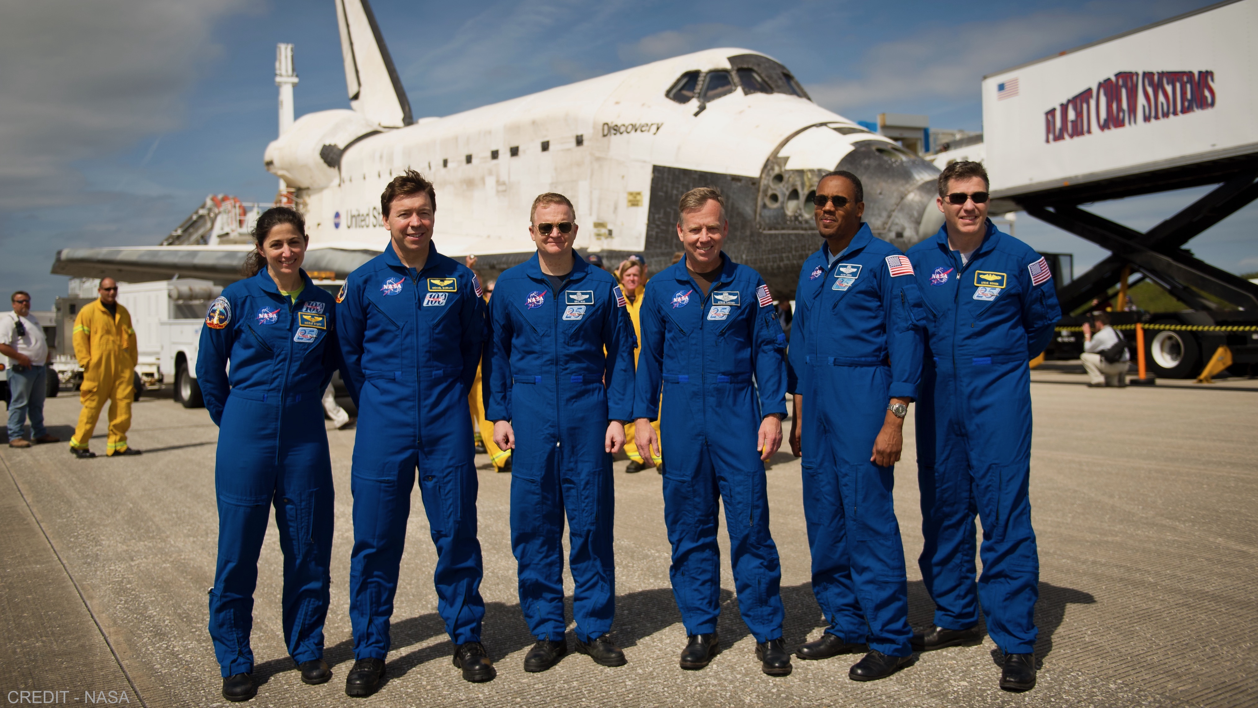 The STS-133 crew poses with the Shuttle Discovery after their successful mission. Crew members, from left, Mission Specialists Nicole Stott, Michael Barratt, Pilot Eric Boe, Commander Steve Lindsey, Mission Specialist Alvin Drew and Steve Bowen.