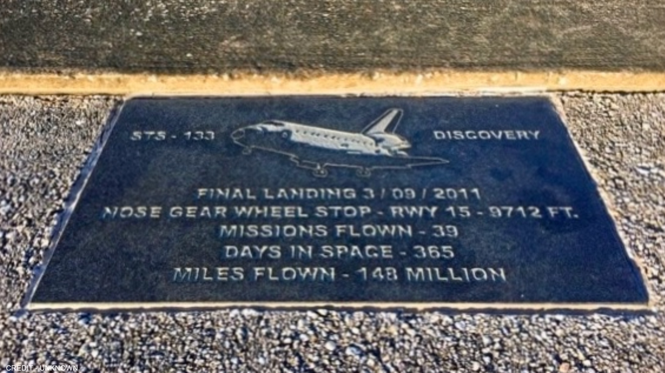 This plaque is embedded at the edge of runway 15 where the Shuttle Discovery came to stop for the final time at the Shuttle Landing Facility in Florida. More on these plaques can be found at collectSPACE.