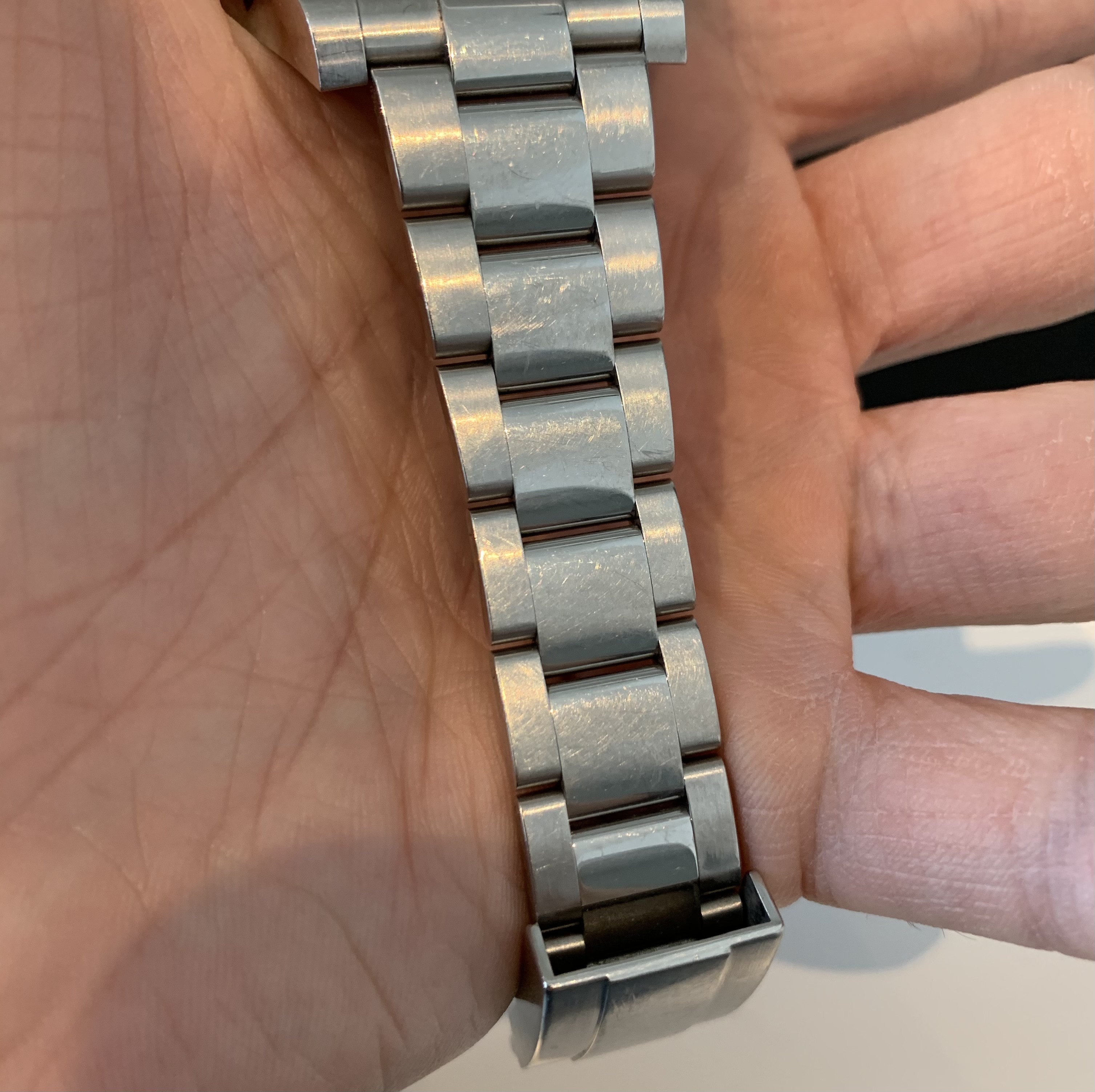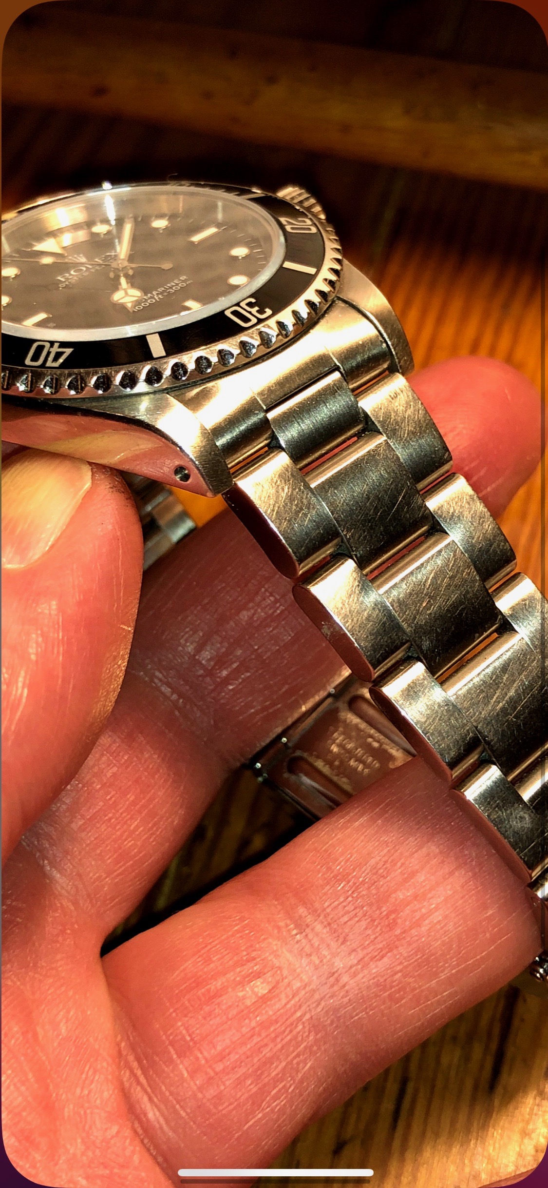 I was wearing my DJ today when I noticed a line that resembles a big scratch.. Initially I thought it was dirt but after I was trying to get it off I realized that it was not only in the center polished link but in the brushed links as well. The weird thing is thay I cannot feel the scratch at all with bear hands and I am really surprised as I am very careful with my watches and at least I would know if I have banged it somewhere..