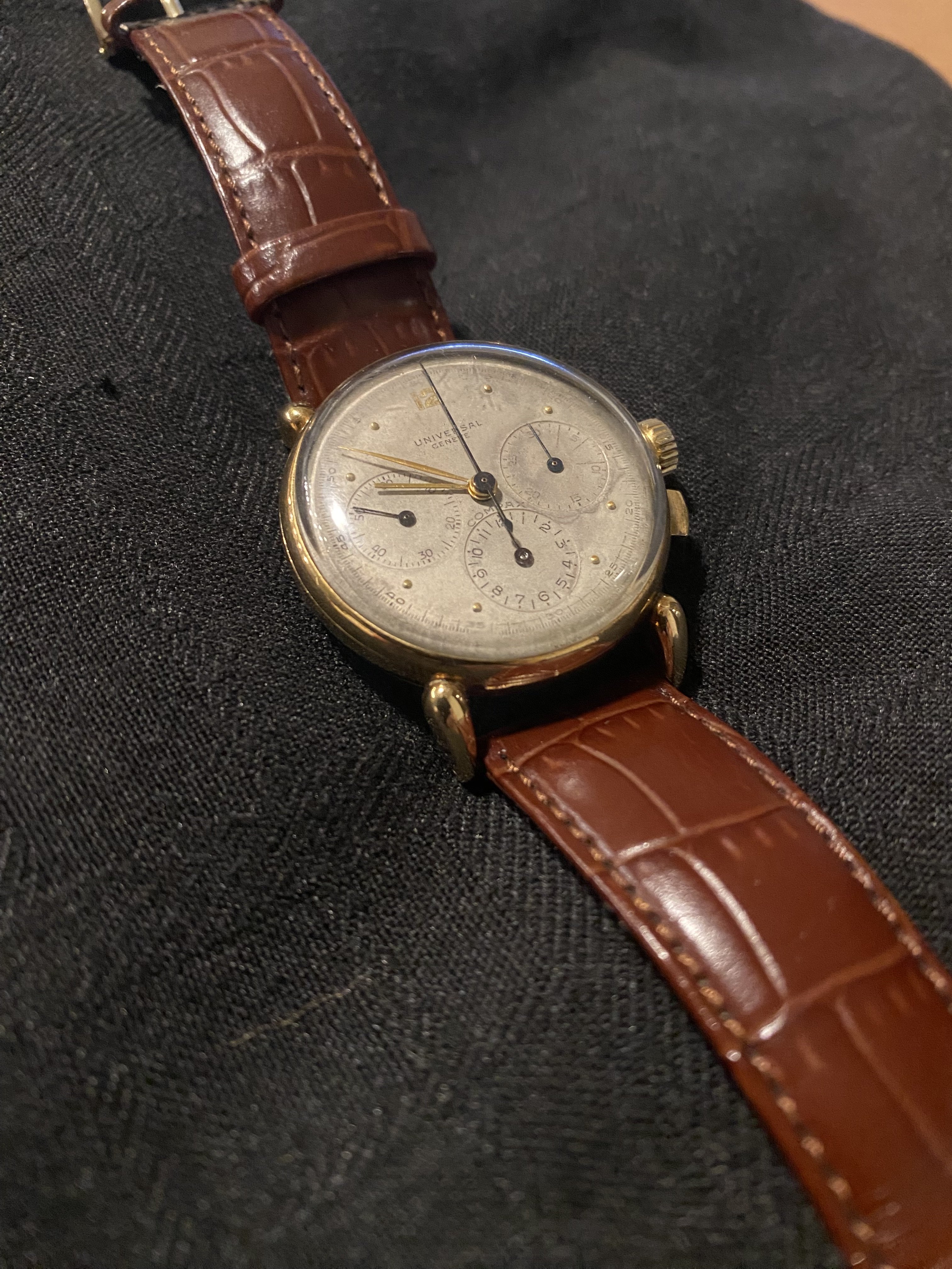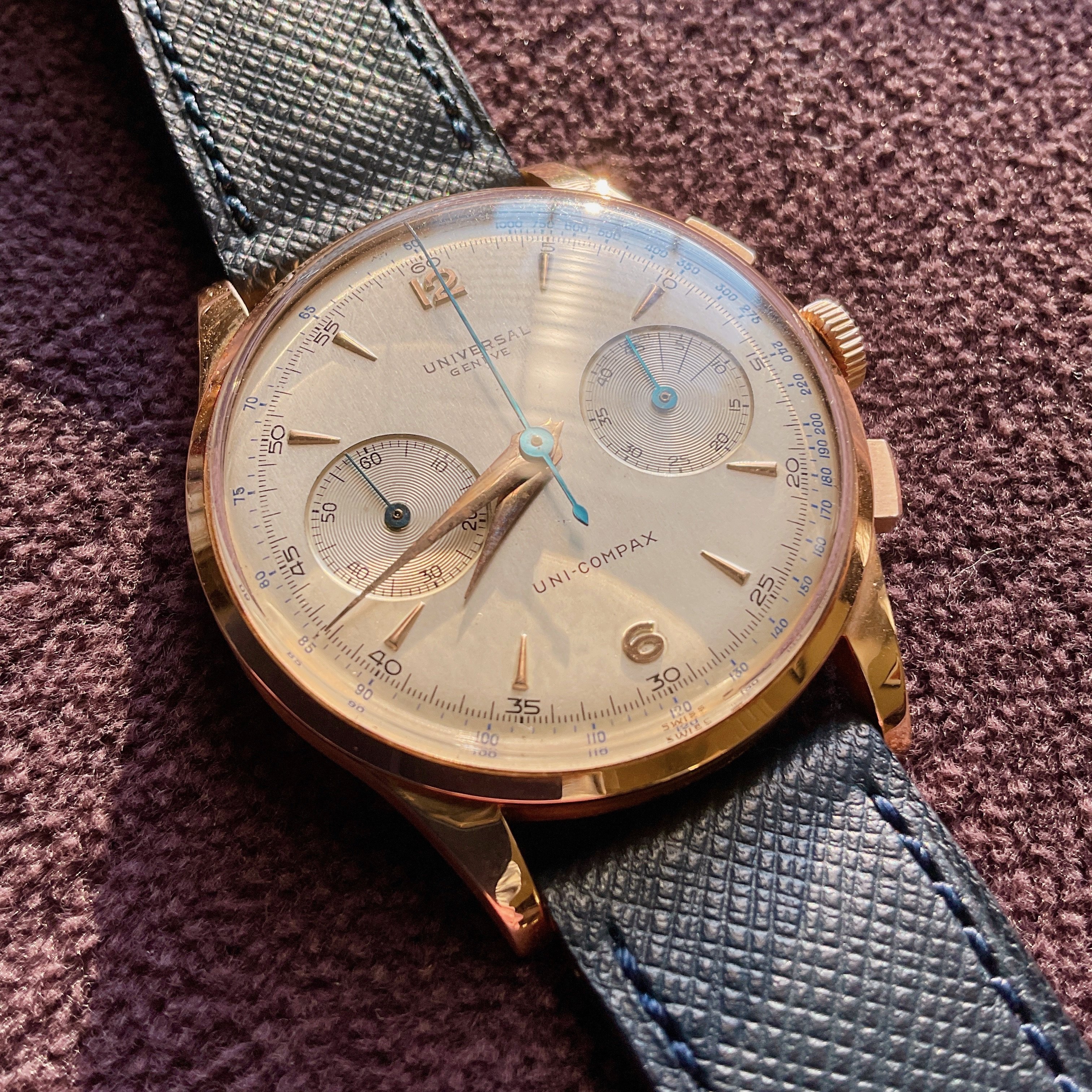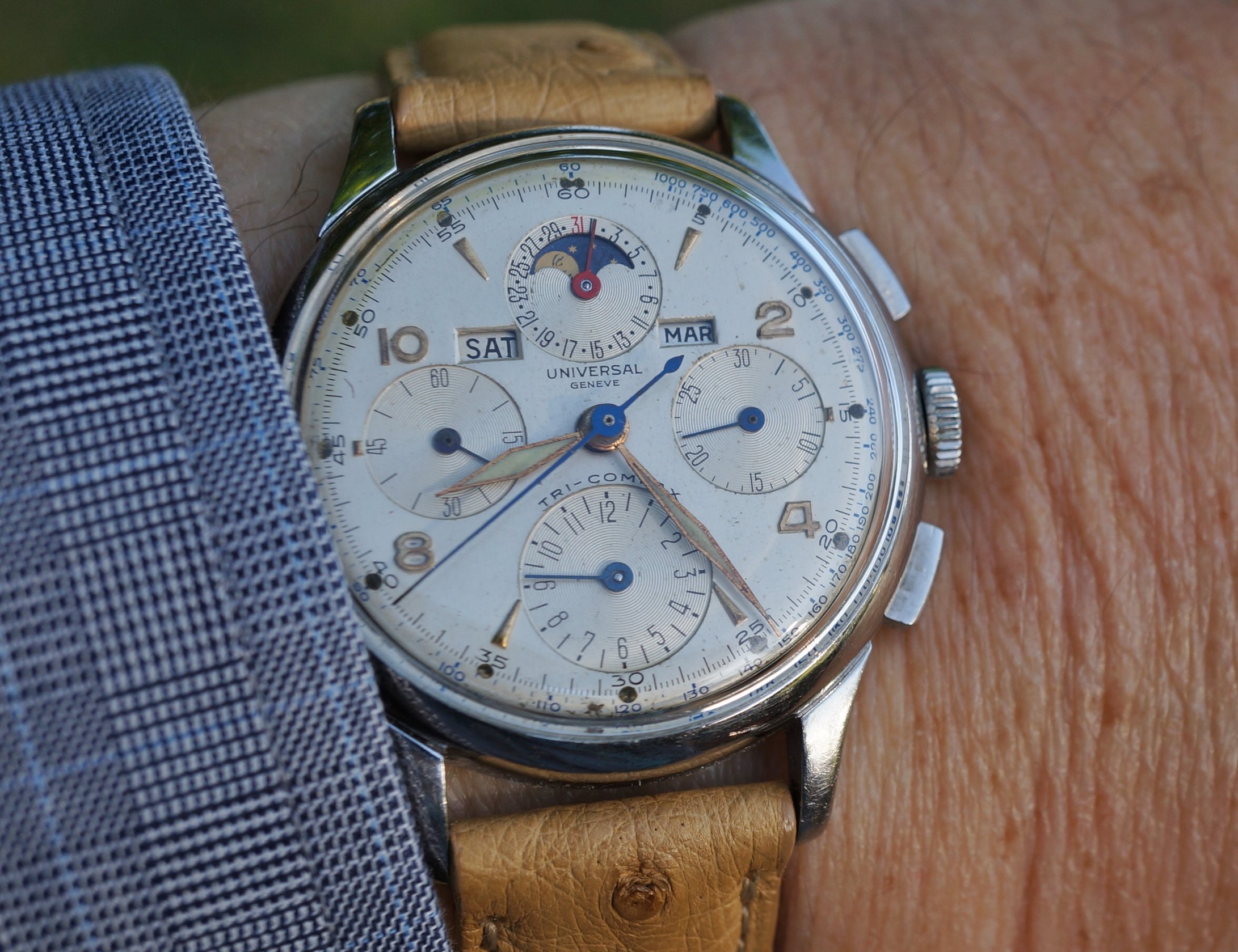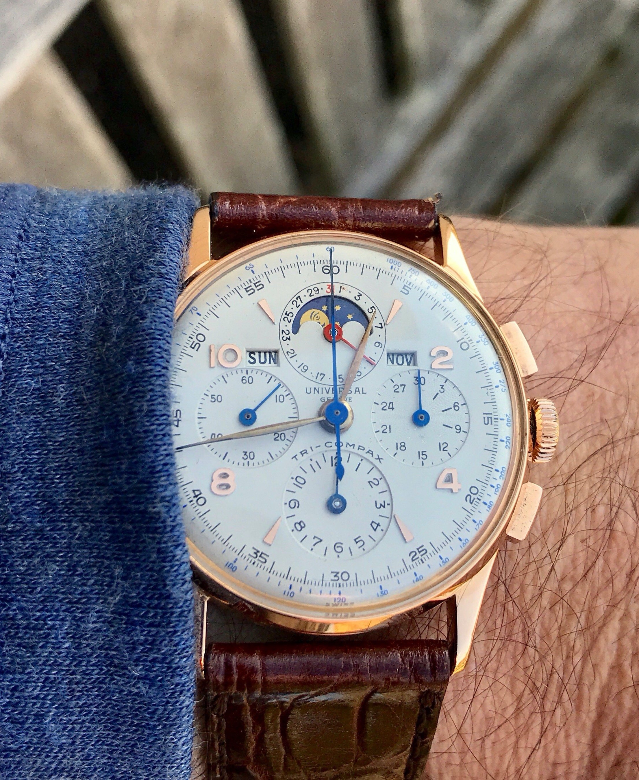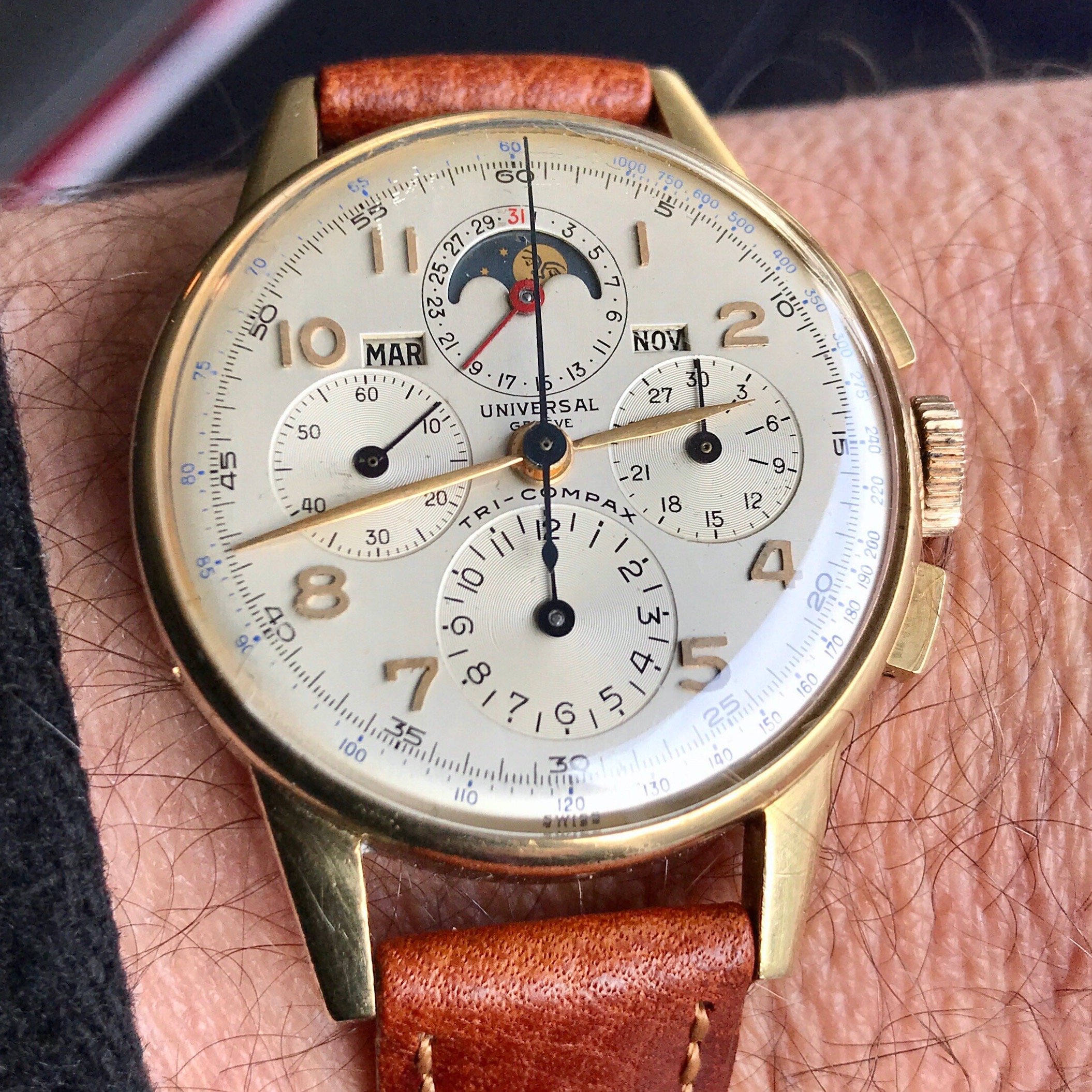 My story is a tale of three watches and begins on a lovely September afternoon in 2015, in the Paris 7th winding down after a week of business. Post lunch and a bottle of wine, a colleague took me to his brother’s vintage shop where in his window were two 40’s TriCompax. I immediately asked to see them. I was enthralled by their complexity and style. To this point I had not paid much attention to Vintage save Rolex and Speedmaster. I immediately inquired about purchasing one and he flatly refused to sell them to me. “You cannot get them serviced in the States” said he. After hanging round the shop I managed to pry my 2998-6 from him with a friends and family discount. My first vintage…but UG had set its hooks.