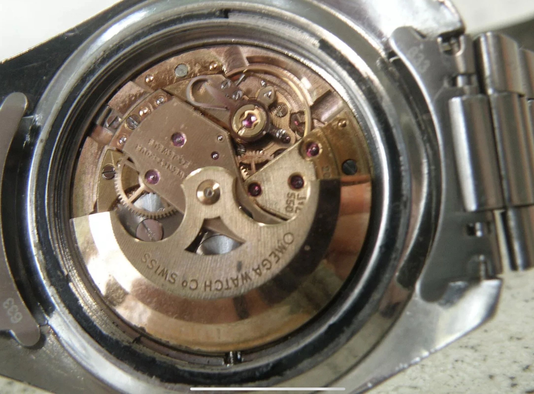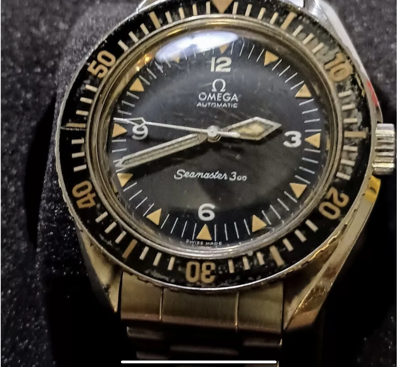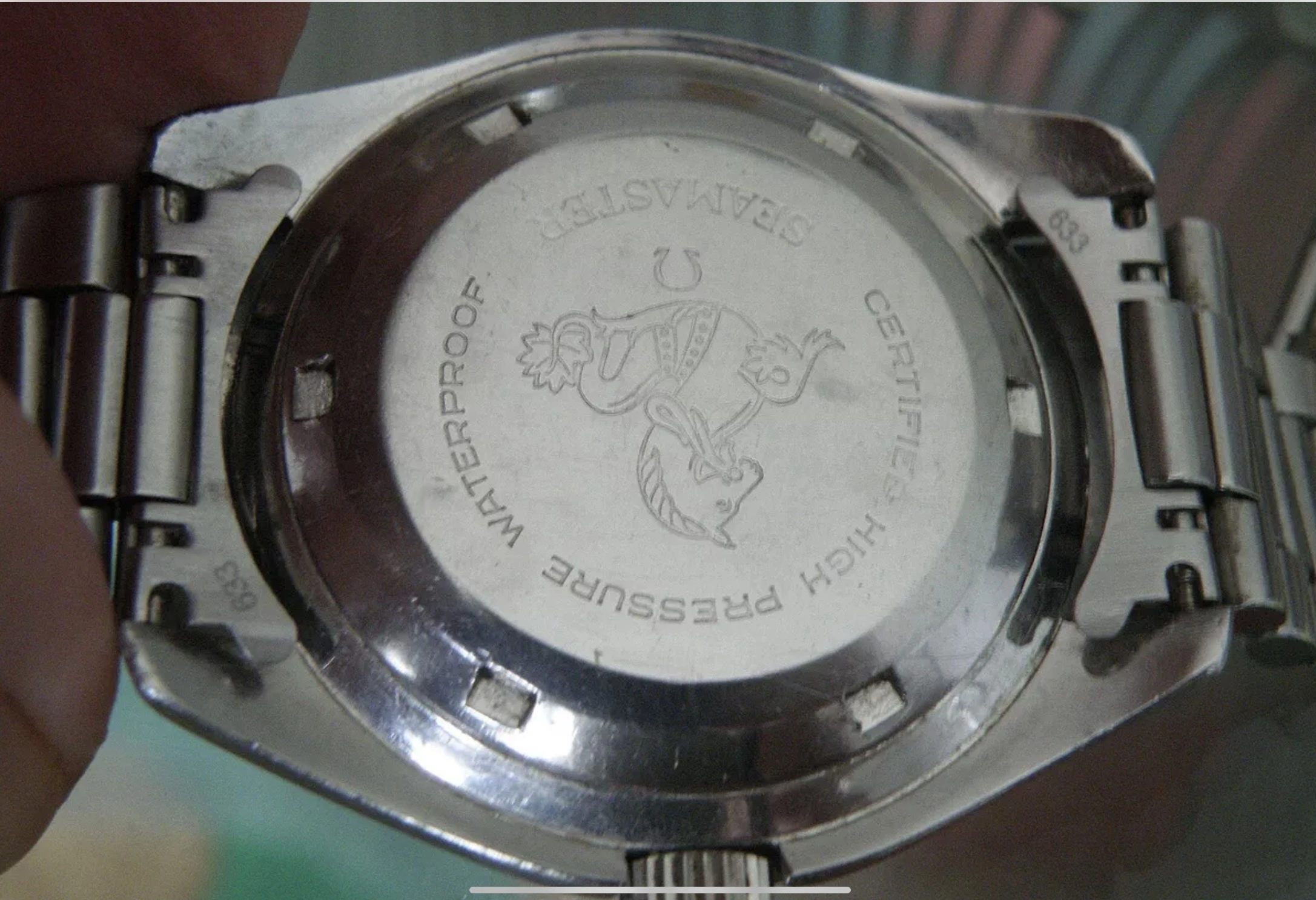 ·Here’s a variation on the “is it a fake” theme. This Seamaster 300 is up for sale on our favorite auction site. The dial is obviously wrong. The bezel, though, looks like a legit 66/67 variant with the flat-serif “1.” I’m no expert, but the caseback looked about right also, with 165.024, “HF,” and “Acier Staybrite” stampings. The cal 550 movement looked legit, although there’s just a glimpse possible of the serial number, which looks like it’s in the 20 million range - 1963 or thereabouts.