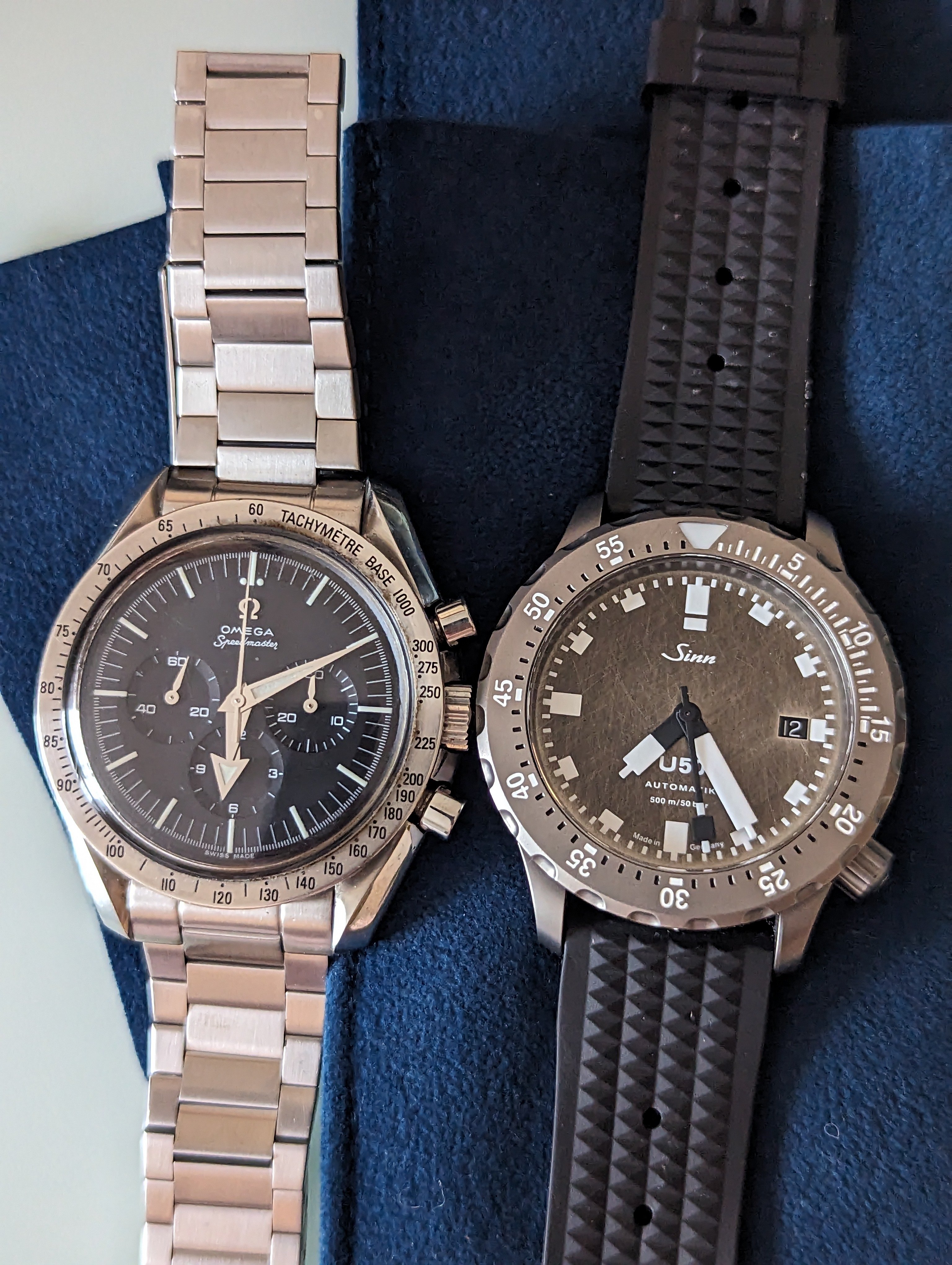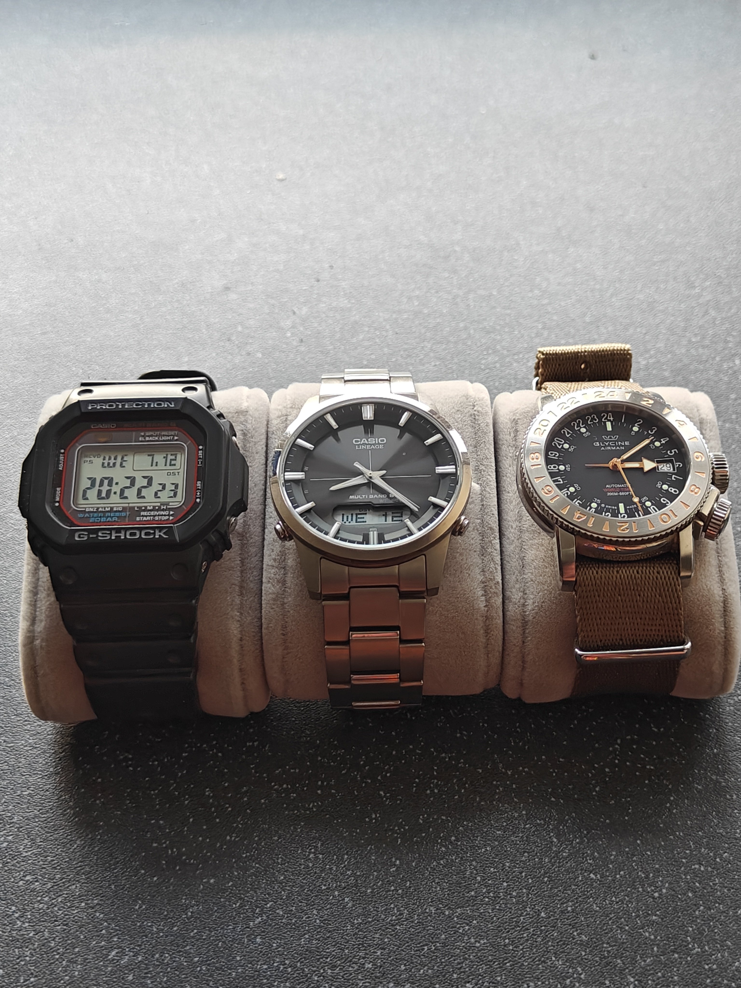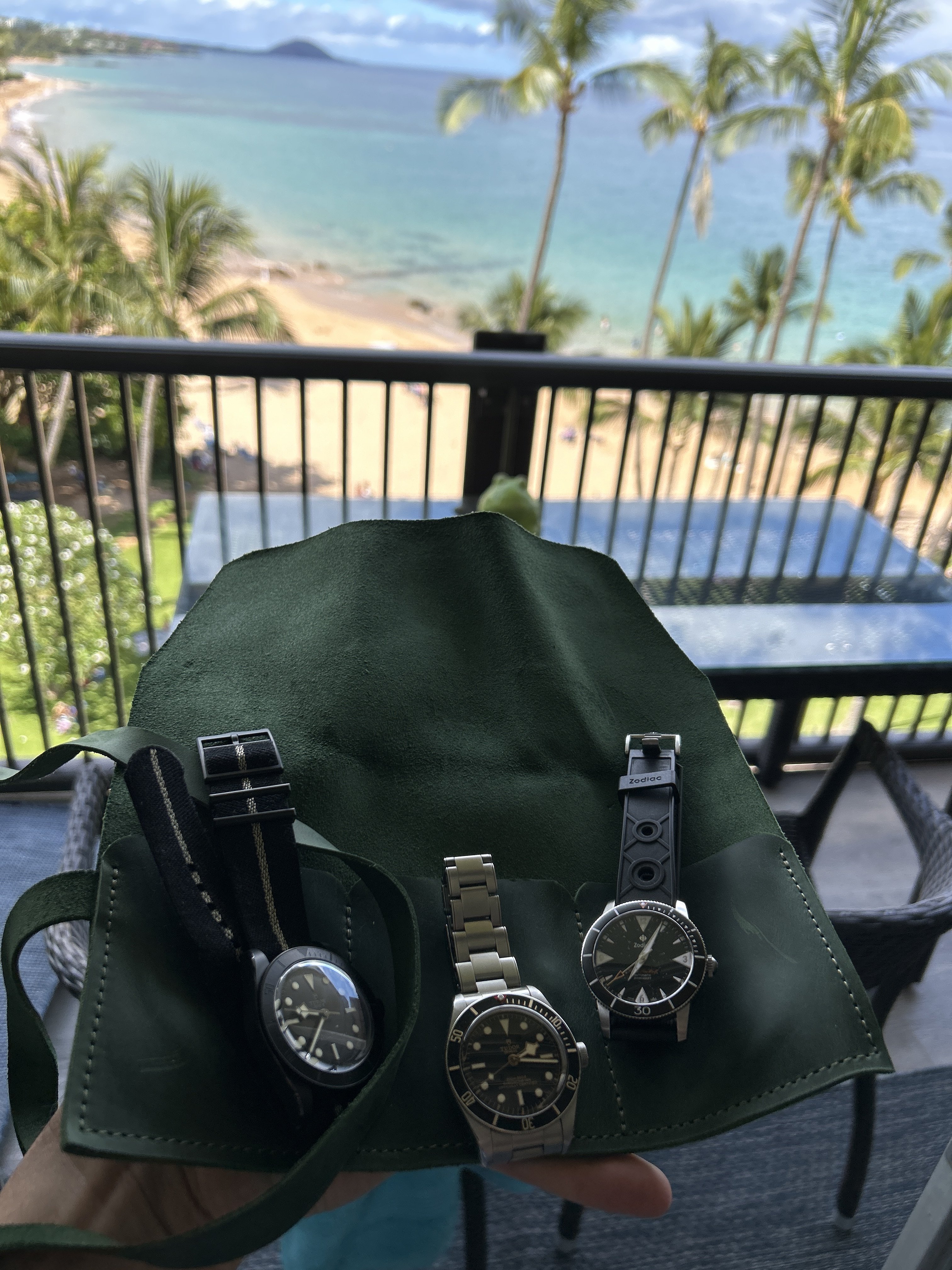 ·I always travel with my Tudor GMT to be able to quickly jump timezones and if I'm going somewhere beachy I'll grab my Oris Aquis GMT too as a beater for the beach, snorkeling, etc. If I'm going back to the UK (and want to show my Dad some of my latest acquisitions) I'll put them in either a 2 piece or 3 piece case.