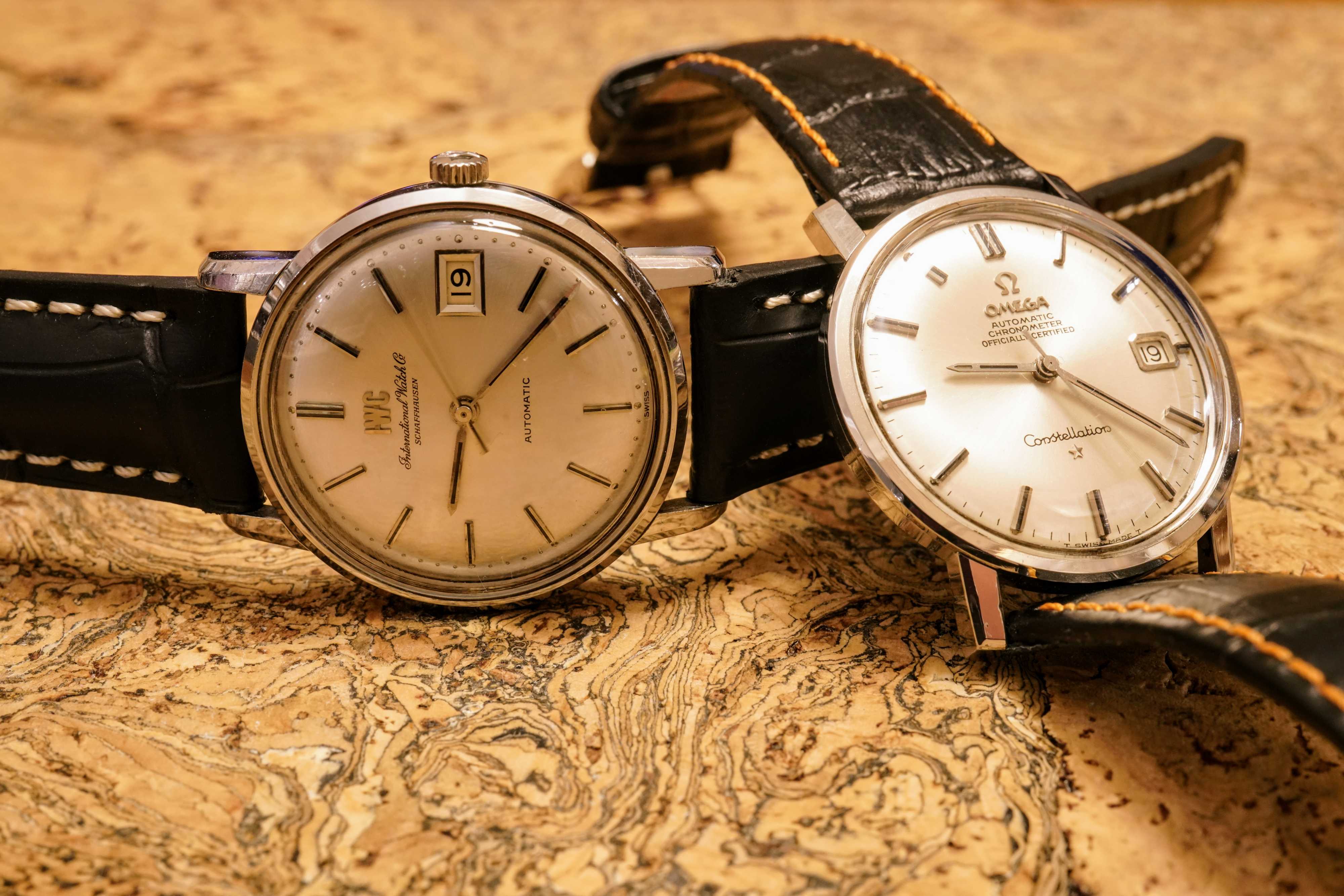 For my own part I'm inexplicably fascinated by conservative-style watches from the mid to late 1960s that all look much the same... 😁 They all have narrow, often inlaid or black-striped hour markers, silver sunburst dials, narrow baton or dauphine hands, simple straight lugs that are often chamfered, usually automatic movements and with date complications being the most popular option. I'm pretty sure that taken together, these features pretty much date a watch to the period bewteen about 1963 and 1969. I suppose the 1960s Seamaster Deville is one classic example - but here are my 168.010 Constellation and my IWC R802AD: