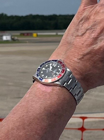 This afternoon at the Oceana airshow I spotted a Rolex GMT 1675 on an older gentleman's wrist. I took a seat next to him and struck up a great conversation about his watch.