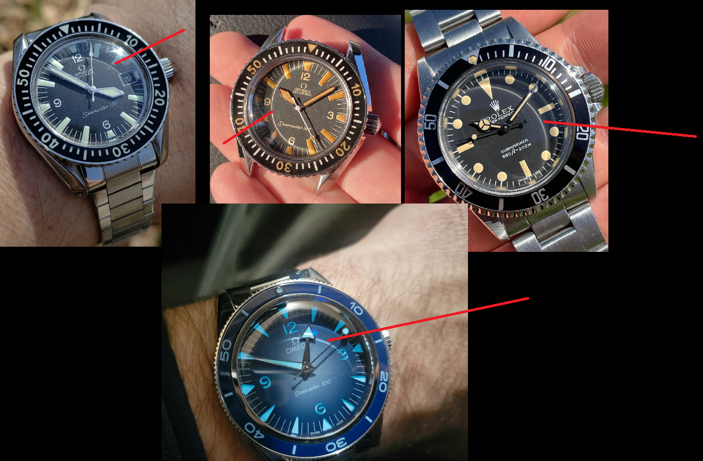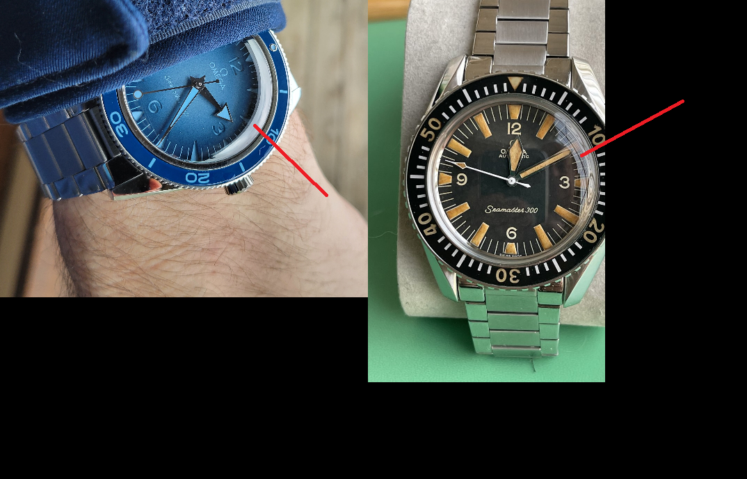 Well, I had a heck of a time taking a good shot of the sapphire dome (it tends to vanish at the top straight on) and it isn't quite as domed as the 1960's SM300, but it is nicely domed- and the way it plays with light is very, very similar. no milky ring (but of course that's an artifact of the "boxed" style tall crystal). Point being, Omega can make killer sapphire crystals that are reminescent of vintage.