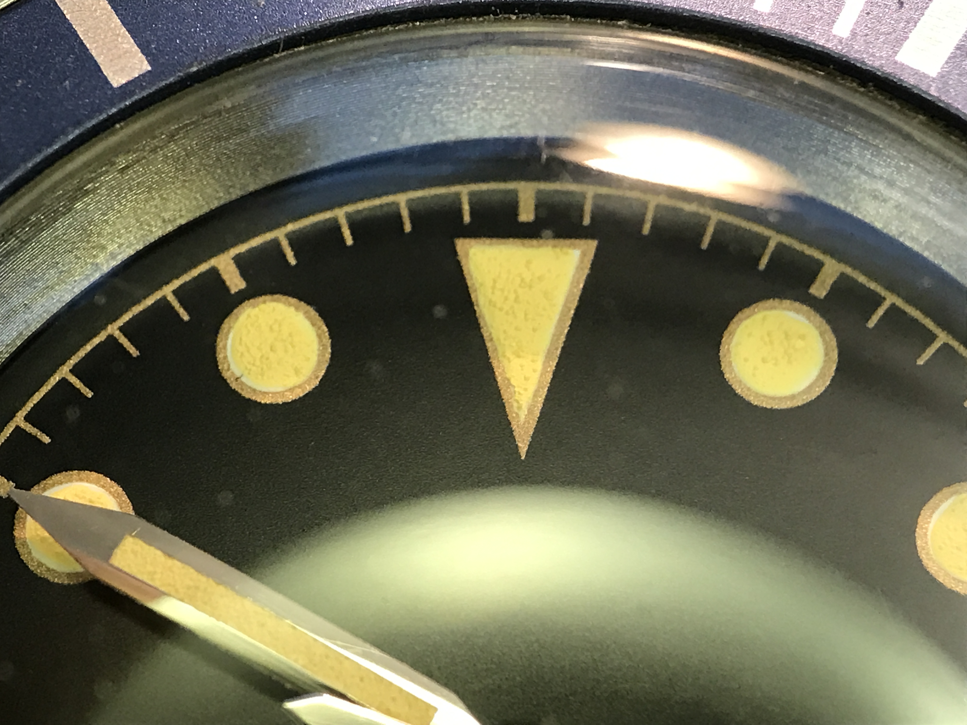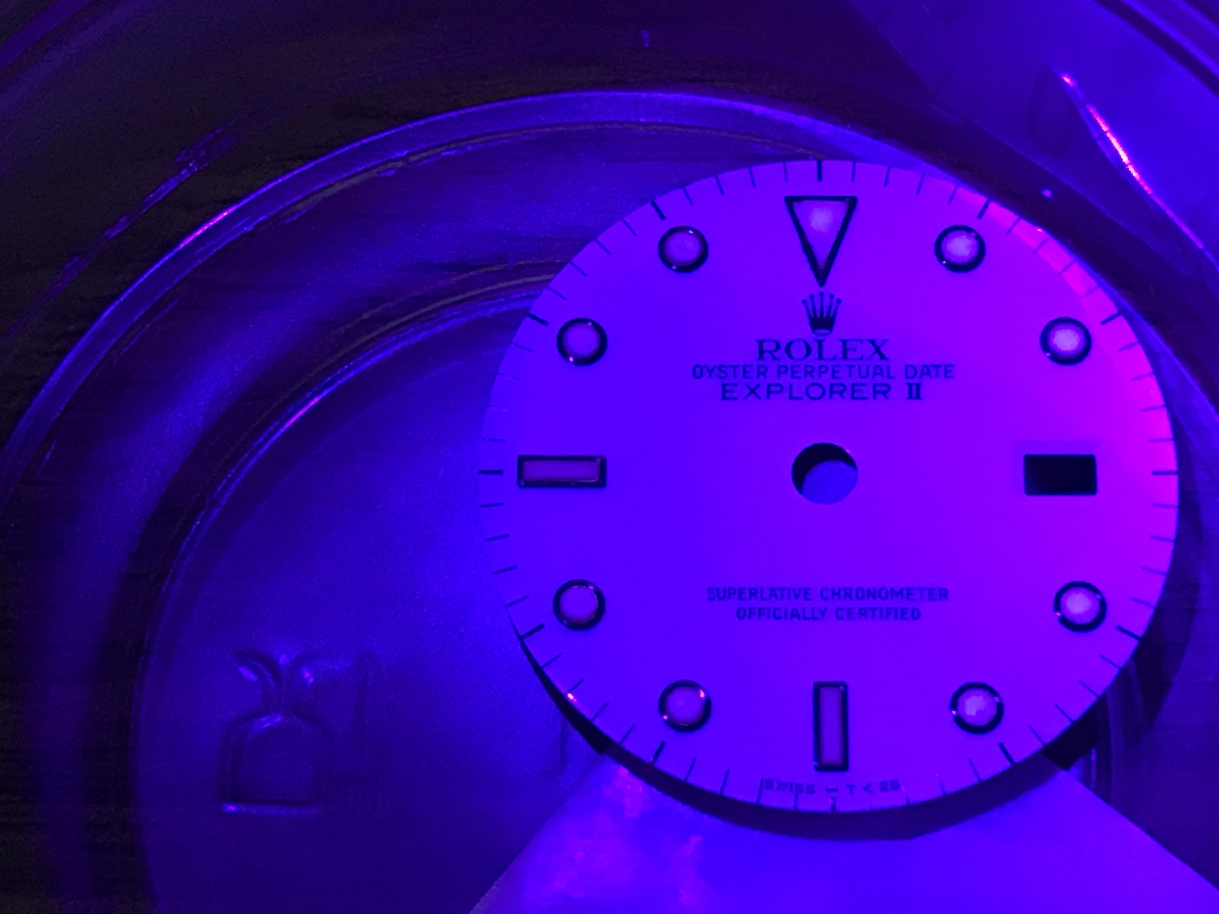 The lume has a nice patina but looks quite different from the other dials in daylight when inspected by loupe. When activated with UV light, the lume glows lightly.