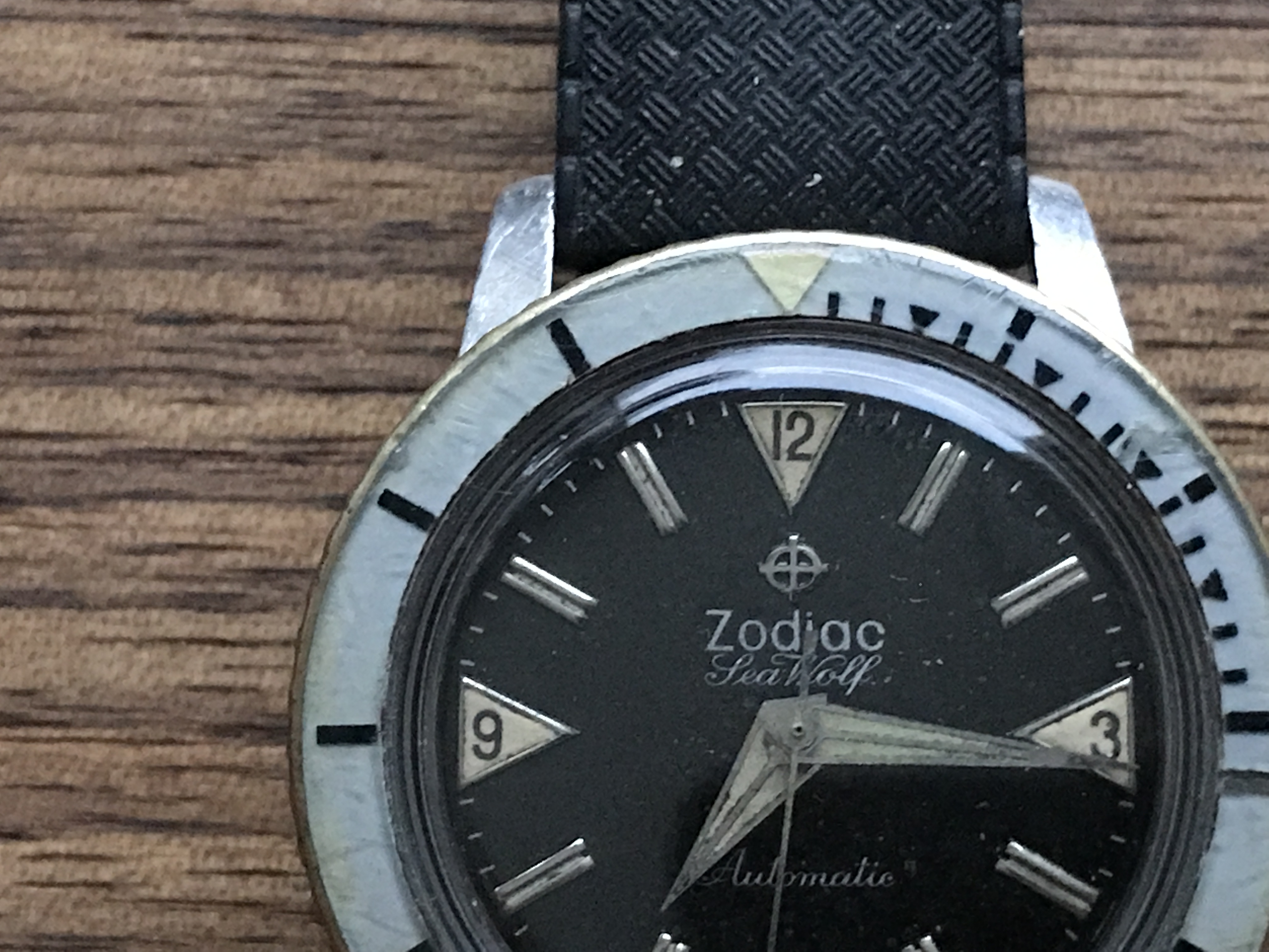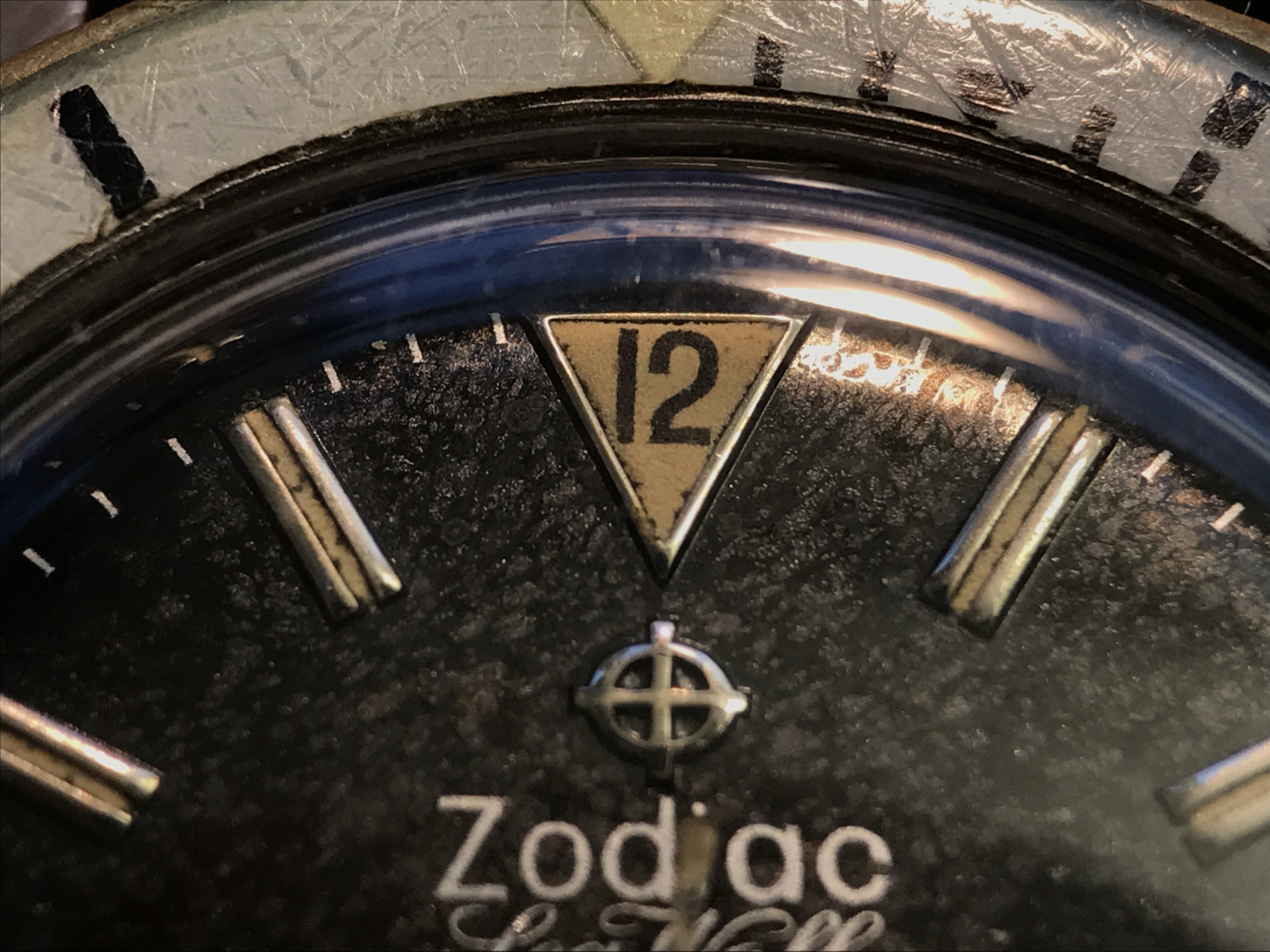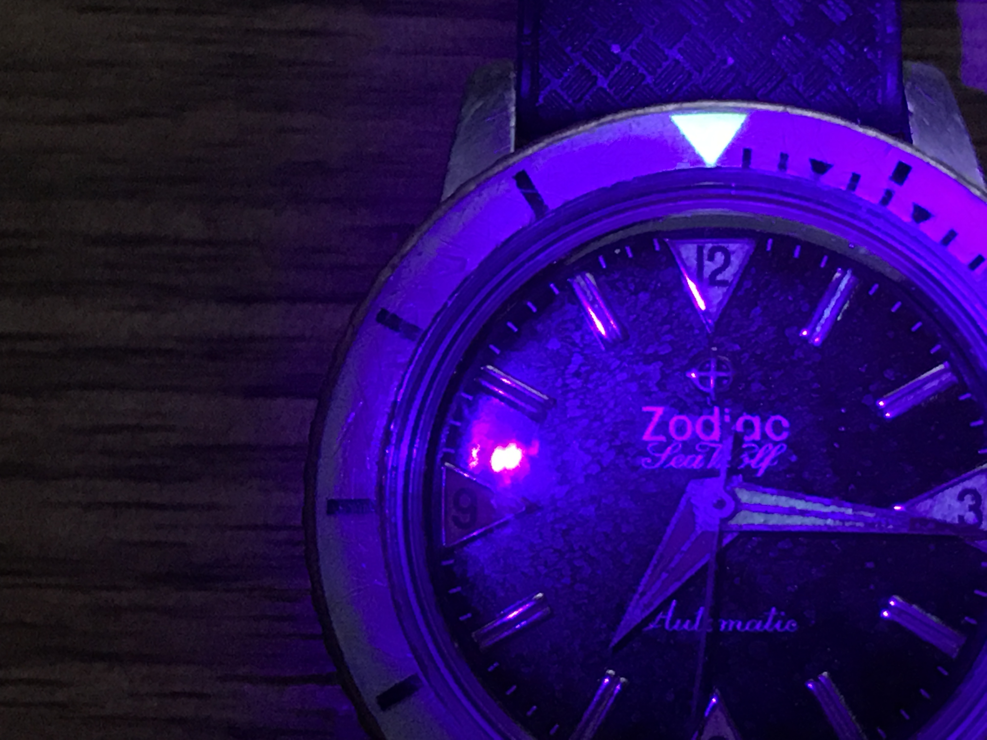 I chose the Zodiac Sea Wolf for comparison since it is one of my vintage watches which do not glow or reflect under UV light. The lume triangles show heavy patina under natural light, but as I mentioned I didn’t notice any reflection or glow. (The lume triangle on bezel however glows quite strong)