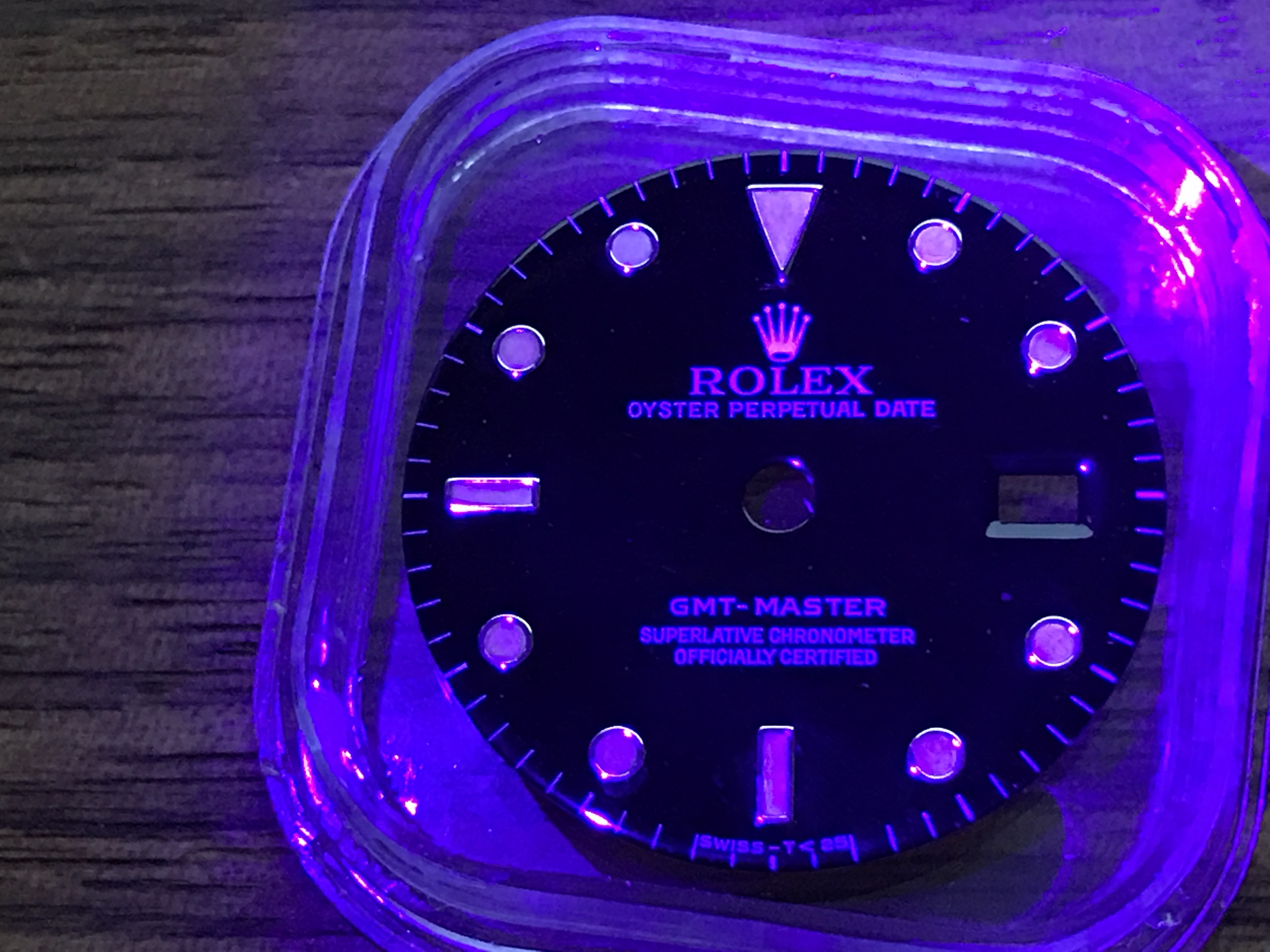 To research the topic, i inspected some of my own watches and spare dials which do not show the typical glow under UV light. I looked at the following examples: