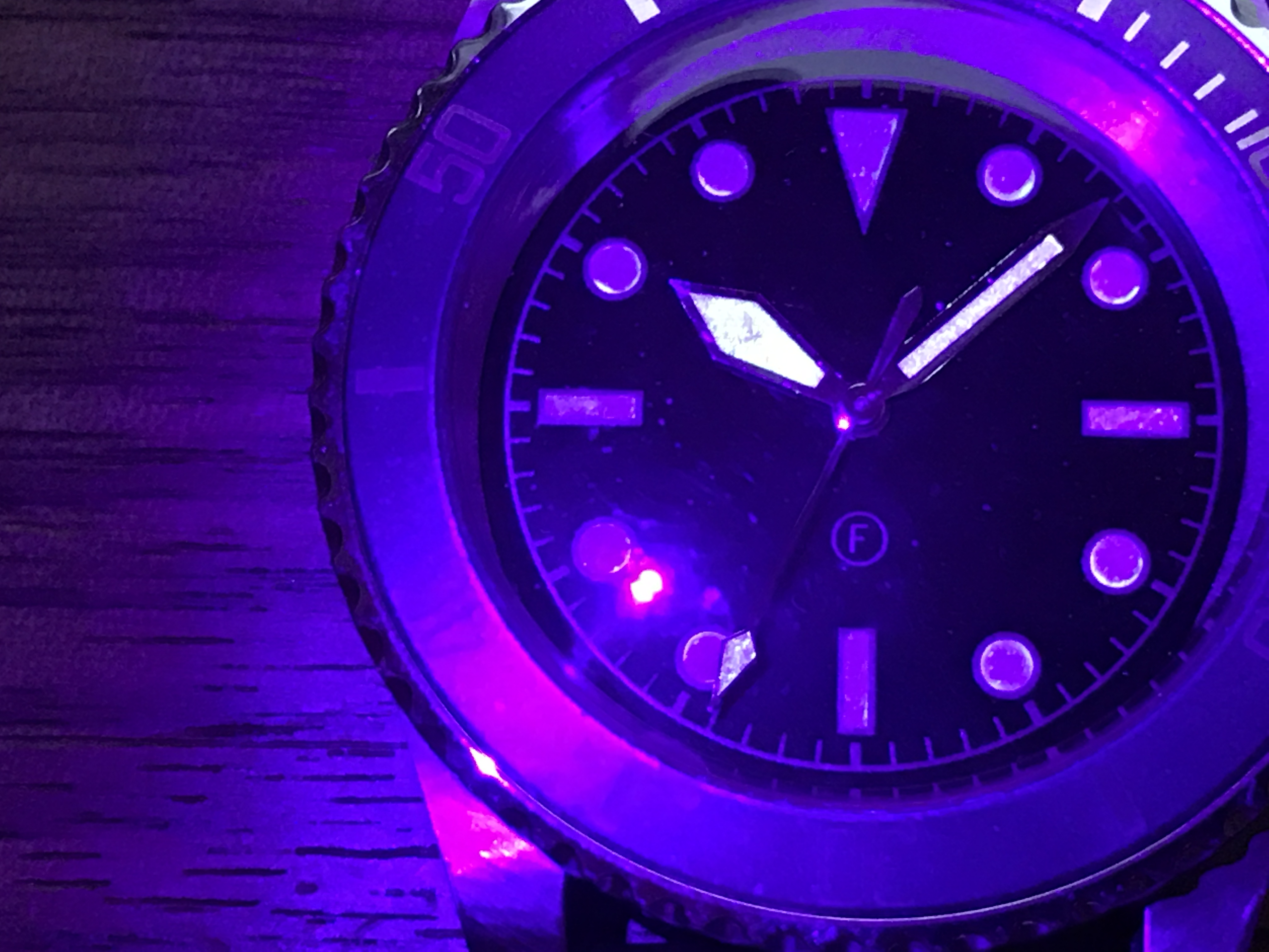 In natural light, the lume dots and triangle shows as a light beige, matt patina. Under UV light, I observed a slightly different reaction as the inner parts of the lume dots/triangle see to reflect the light.