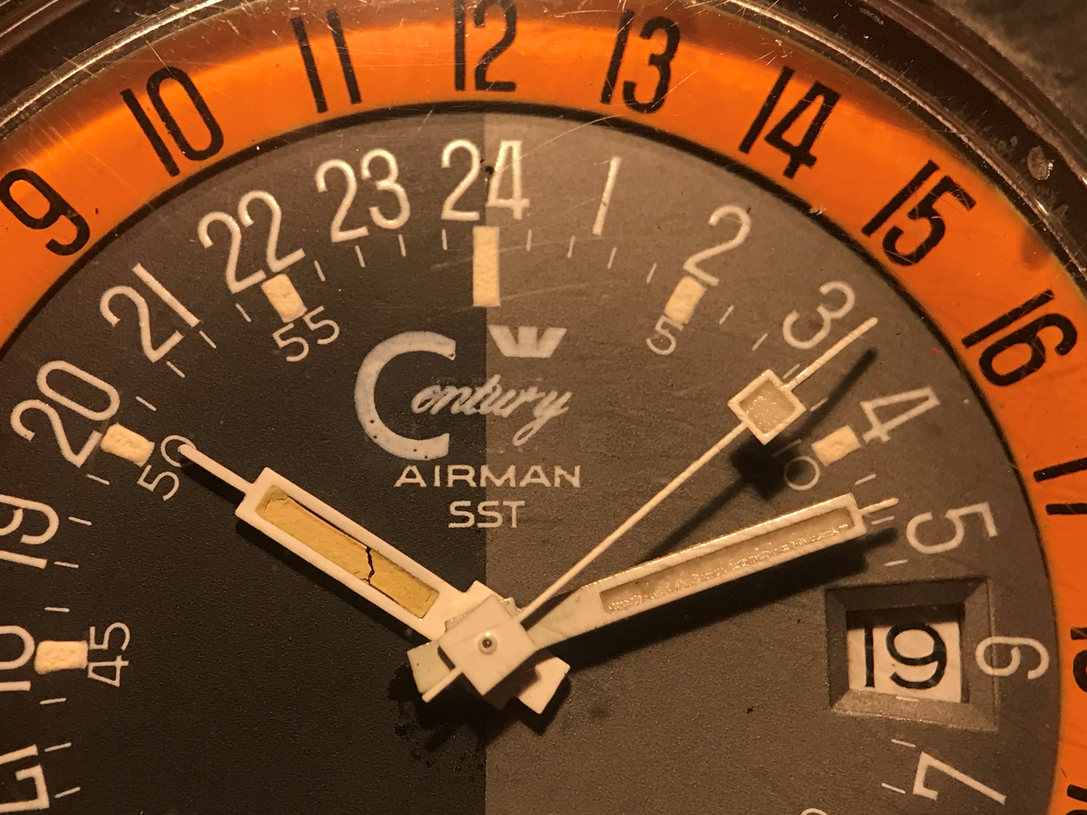 Finally there is this interesting case of a 1970s Glycine Airman SST. Upon close inspection of the hands, the minute and second hand seem to be an old relume job, while the hour hand appears to be the original, albeit cracked lume. But none of the hands reflects or glow under UV light. The lume markers do slightly glow however. It could of course be that for the reluming of the minute and seconds, a nonglowing sort of paint was used.