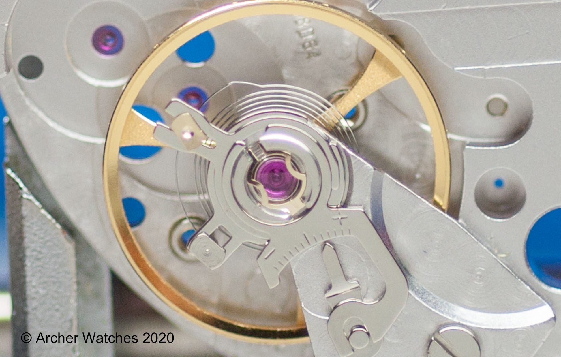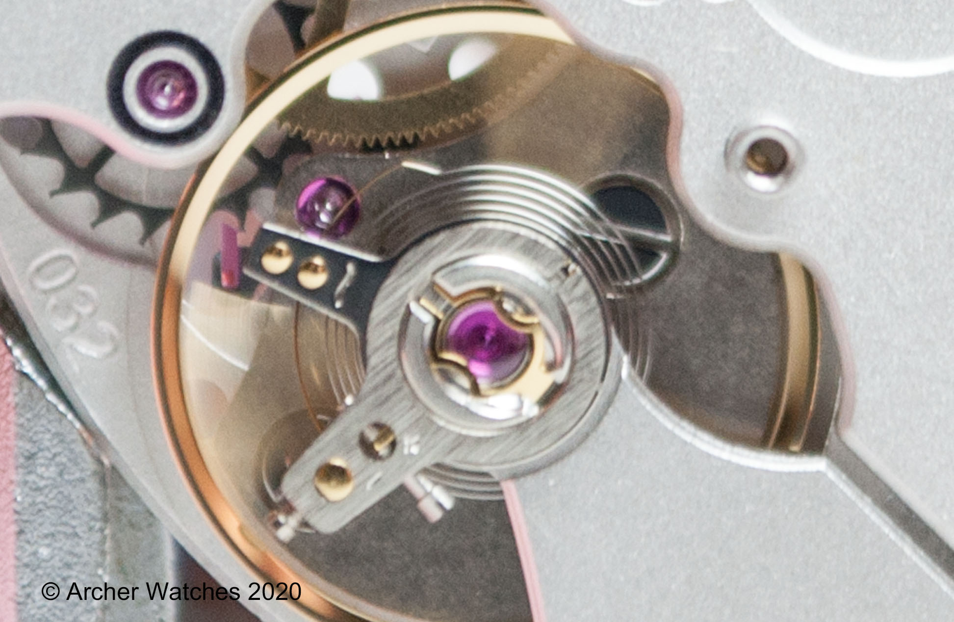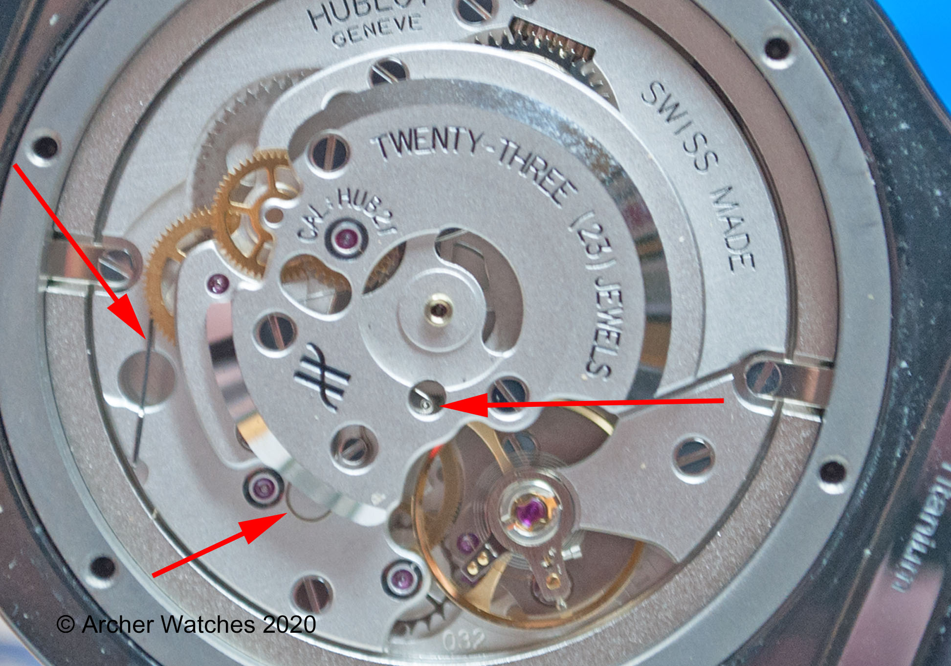 It's a pretty clever solution, and this came to mind because someone again asked if it was okay to leave your chronograph running in another post on the forum today. Hublot have made it so that this part of the chronograph mechanism runs non stop whenever the watch is running. There were a few other upgrades they made, so they placed a jewel on the barrel bridge for the barrel arbor, used a ceramic ball bearing in the rotor, and used a Triovis regulator on the balance.