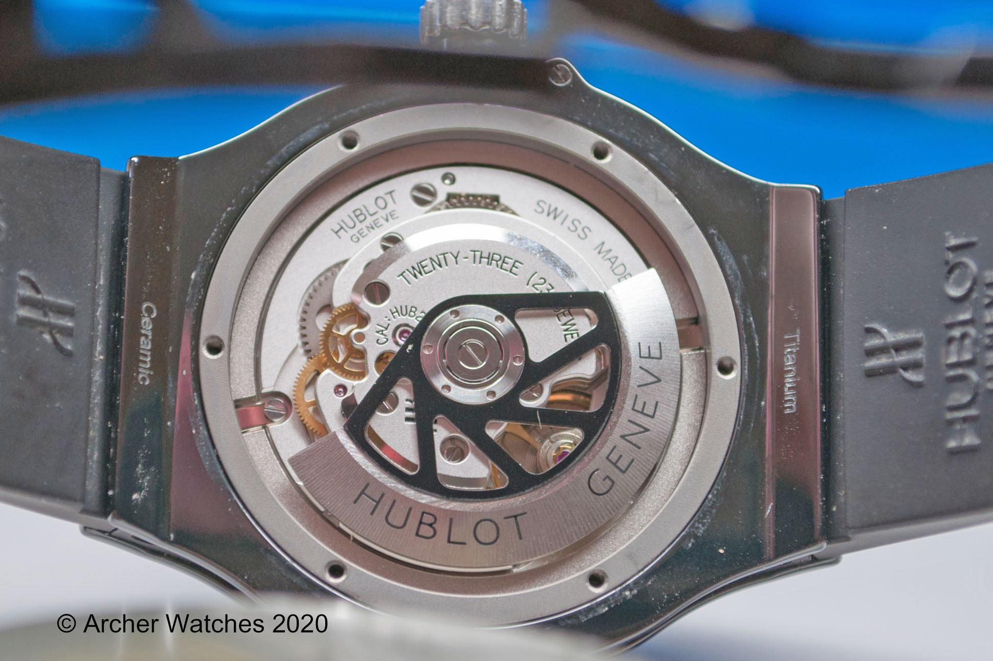 44mm case made of ceramic and titanium. A dial marker had fallen off, the chapter ring had come loose, and the seconds hand was jammed on that ring. So this watch had some issues right off the bat. I removed the screws from the back of the case, and found this "HUB 21" inside: