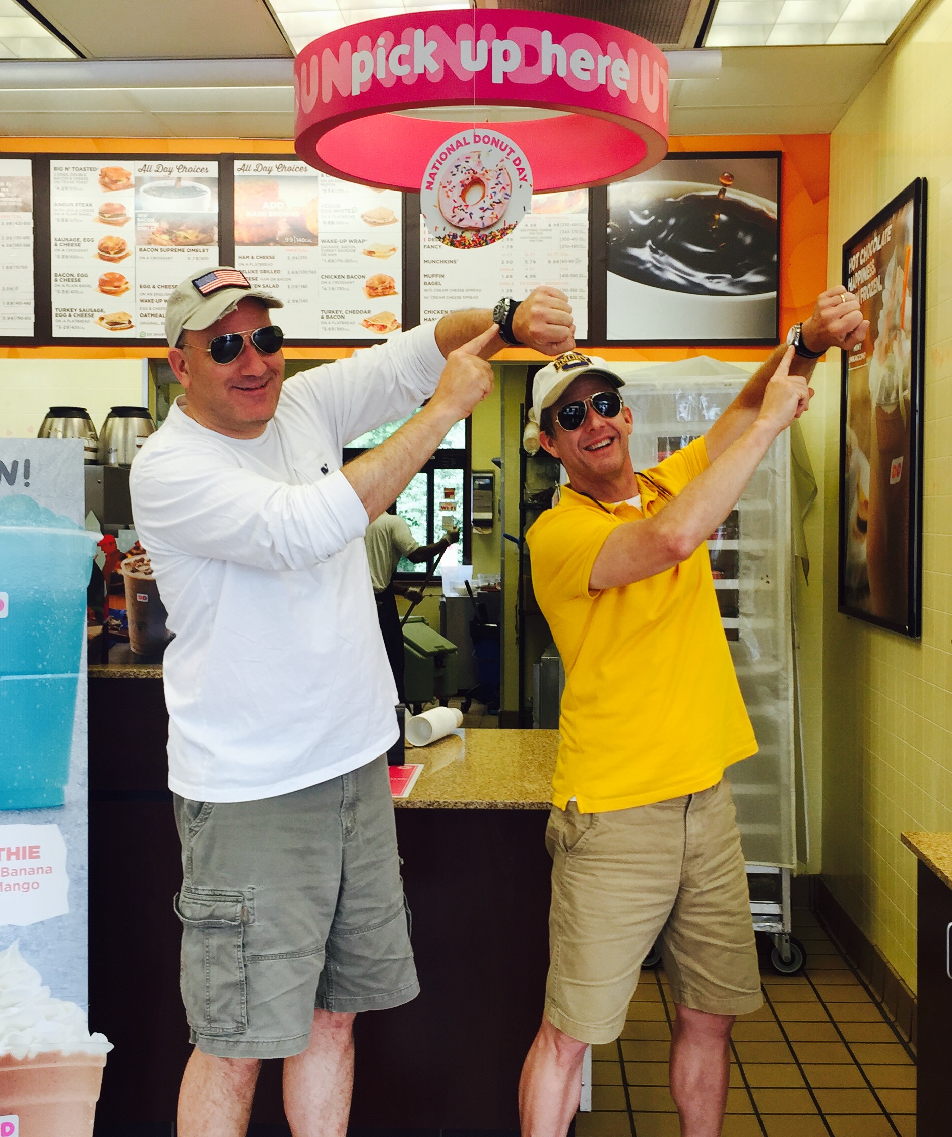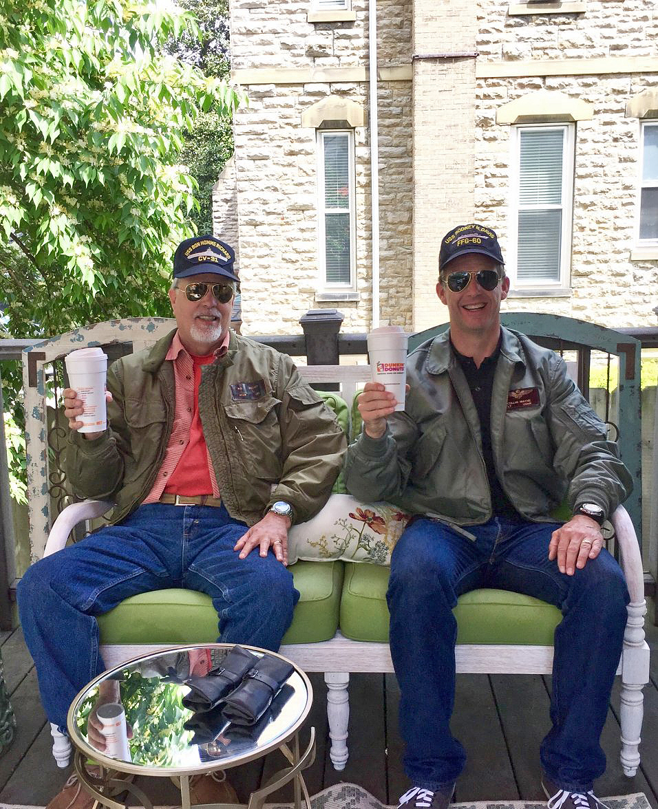 Pictured below is Steve on the left and myself on the right...Steve wore his father-in-law's Navy jacket and ship ball cap so I had to whip out my Navy jacket and ship ball cap...AND we consumed Dunkin' Donuts coffee...good times! 馃憤