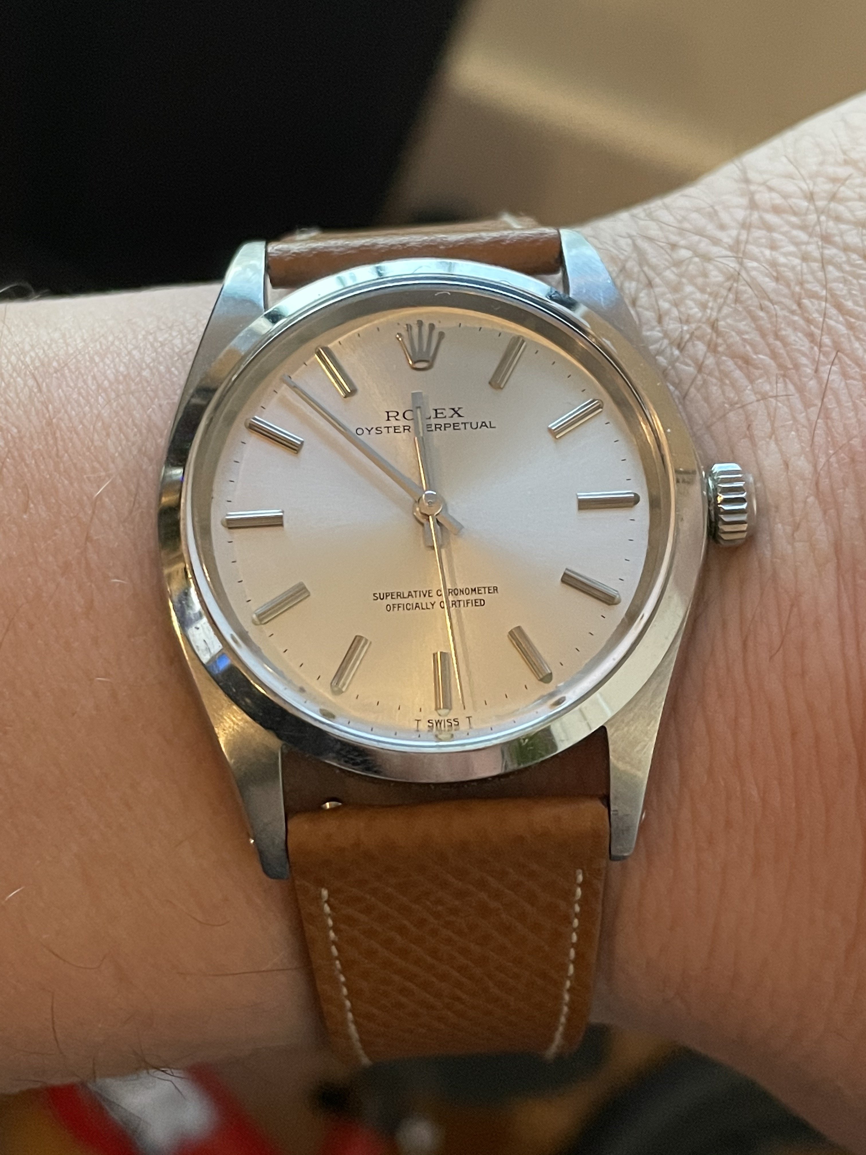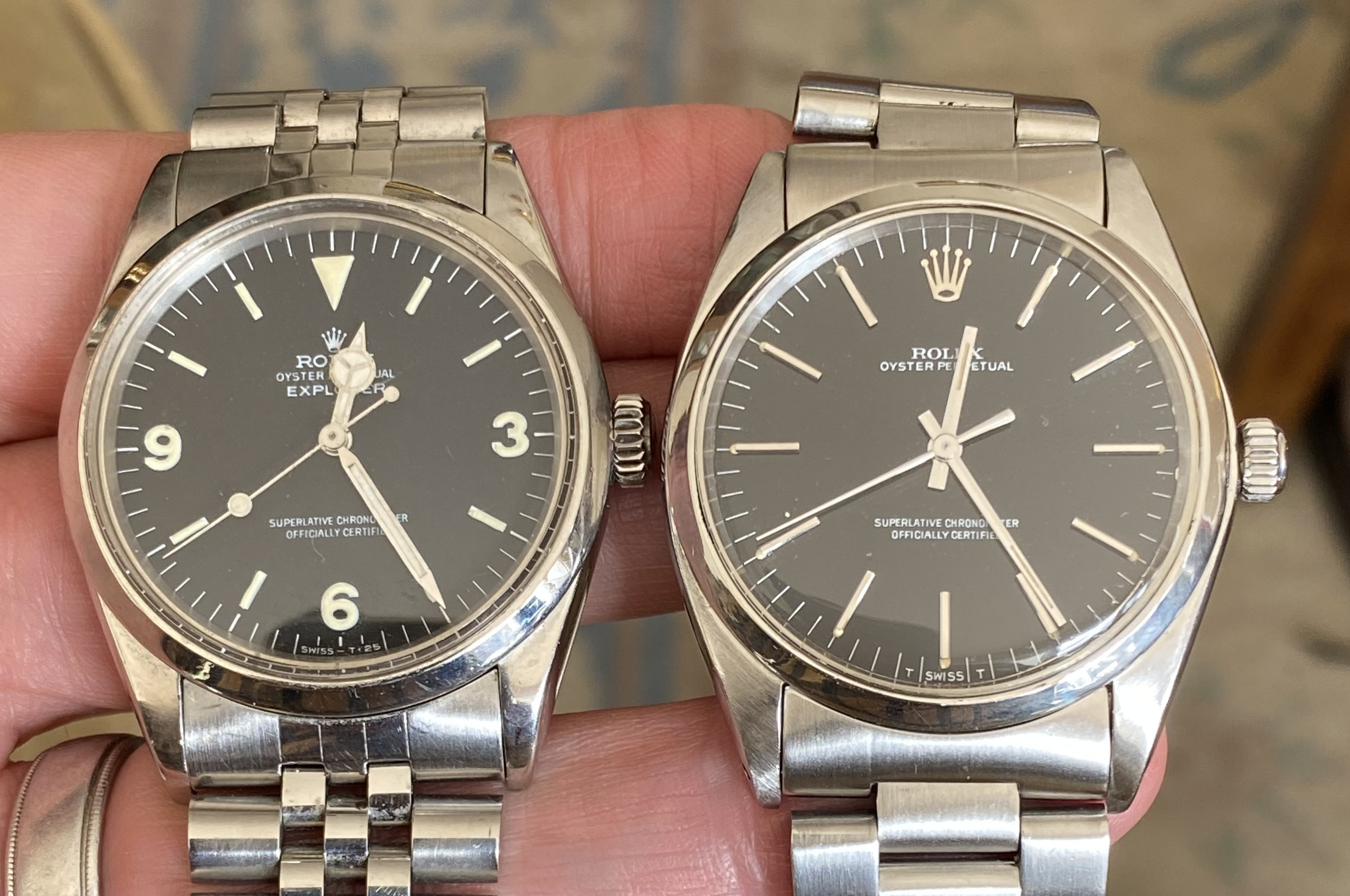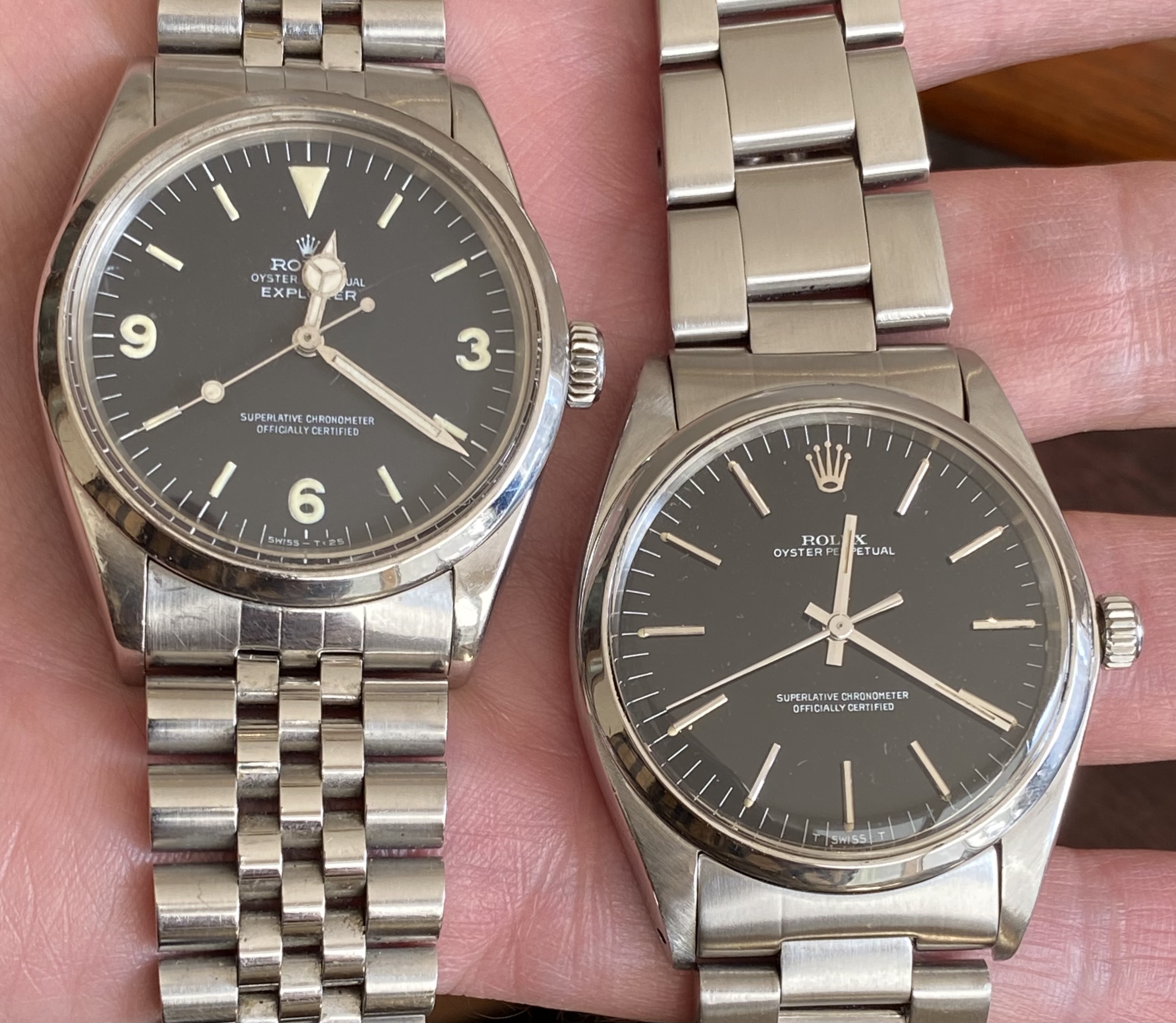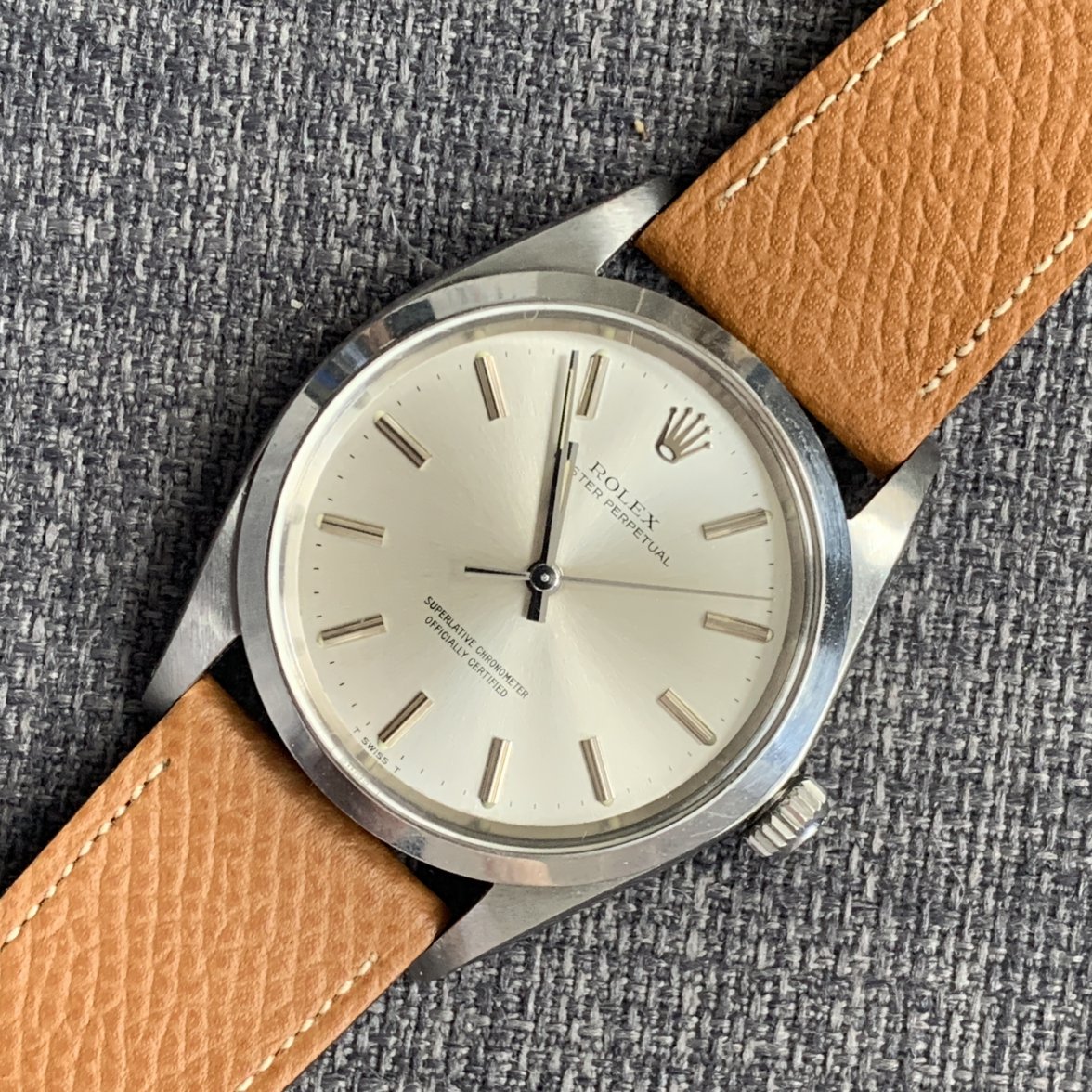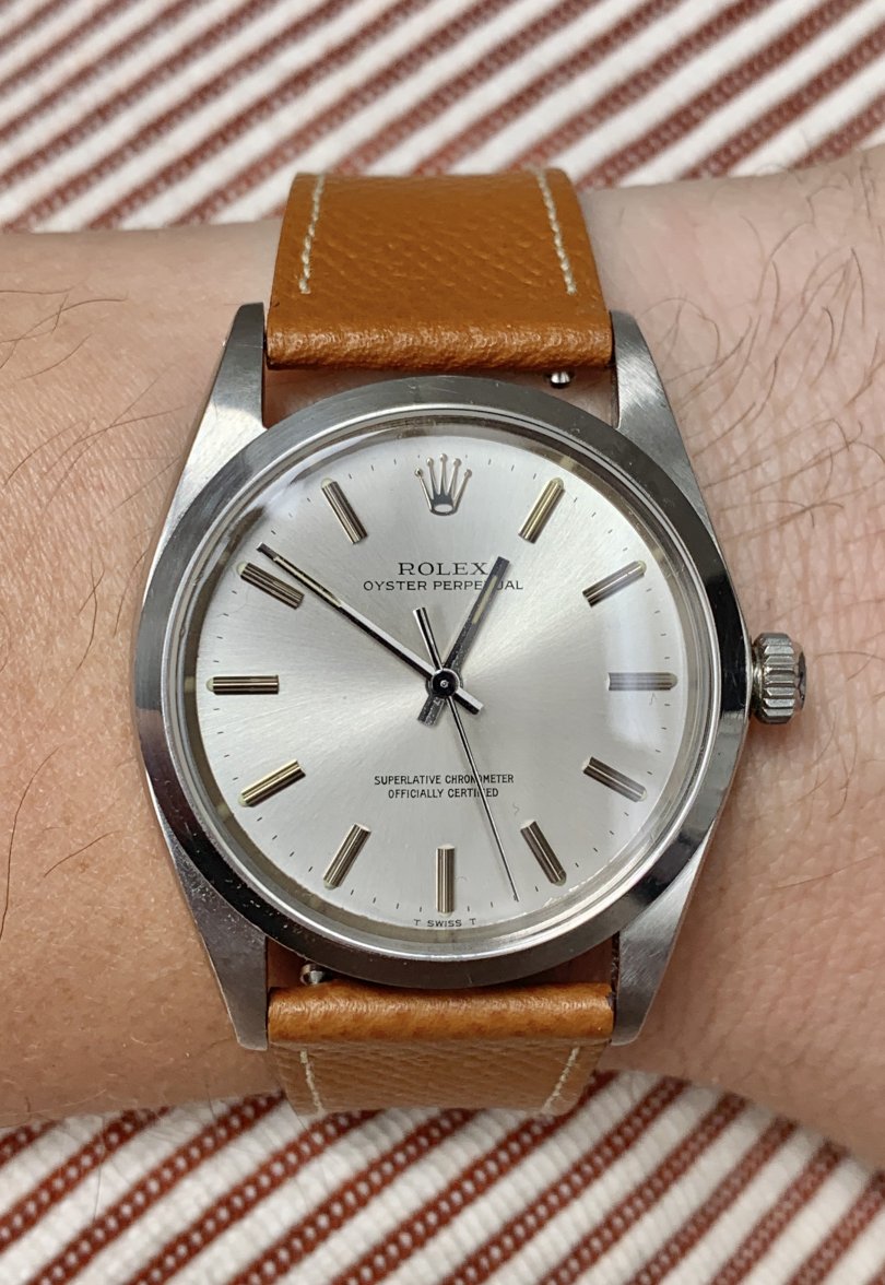 ·Some time earlier this year, in looking for 36mm 70’s no date Oyster Perpetuals, I stumbled on the 1018 reference. Like a 1002, 1018s have plain bezels (which down plays the whole Rolex thing). I became curious to see how much difference 2mm really was when on the wrist.