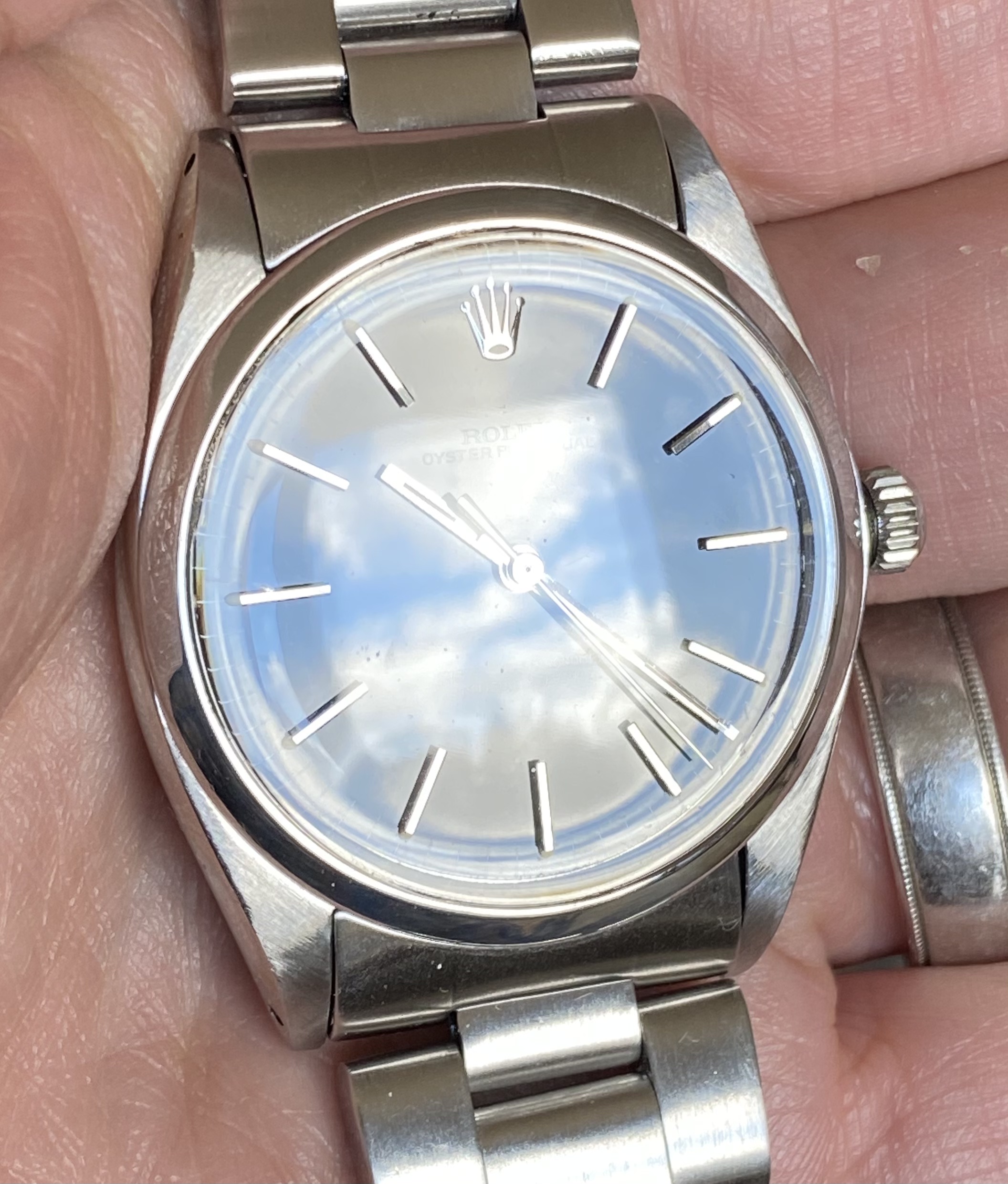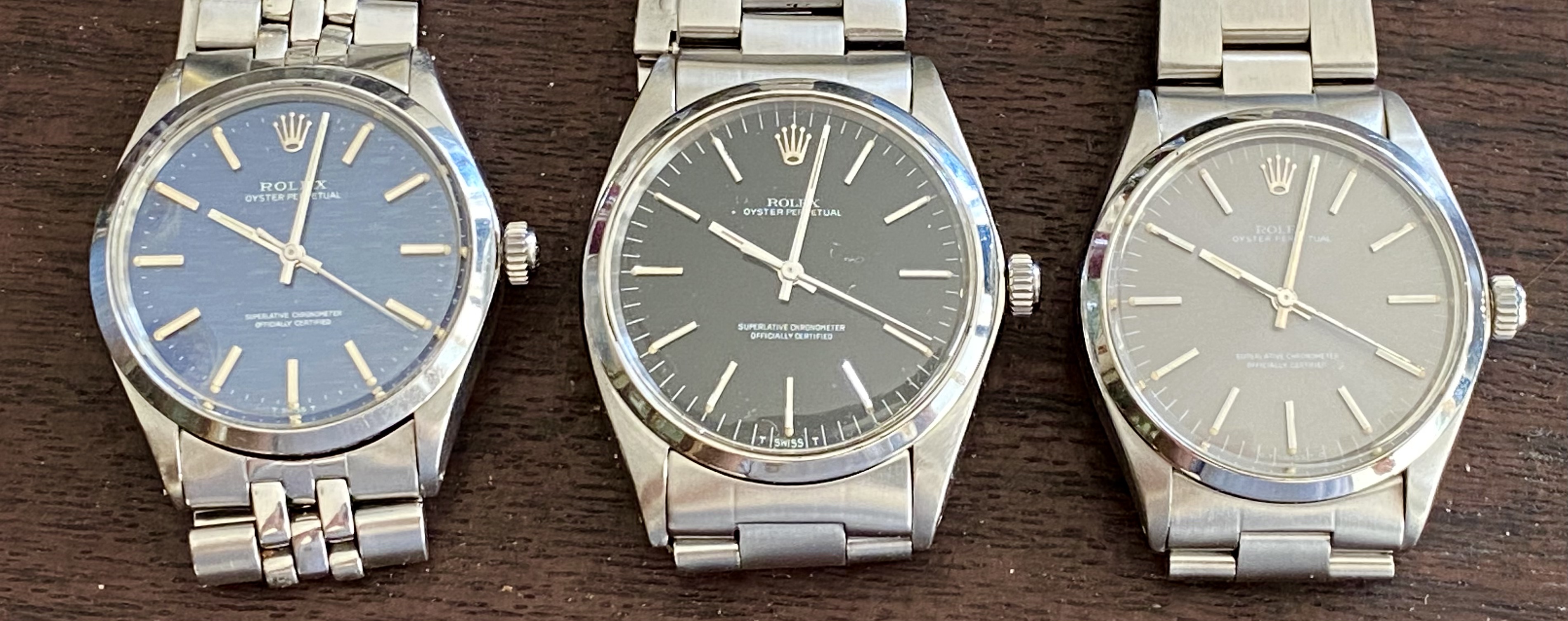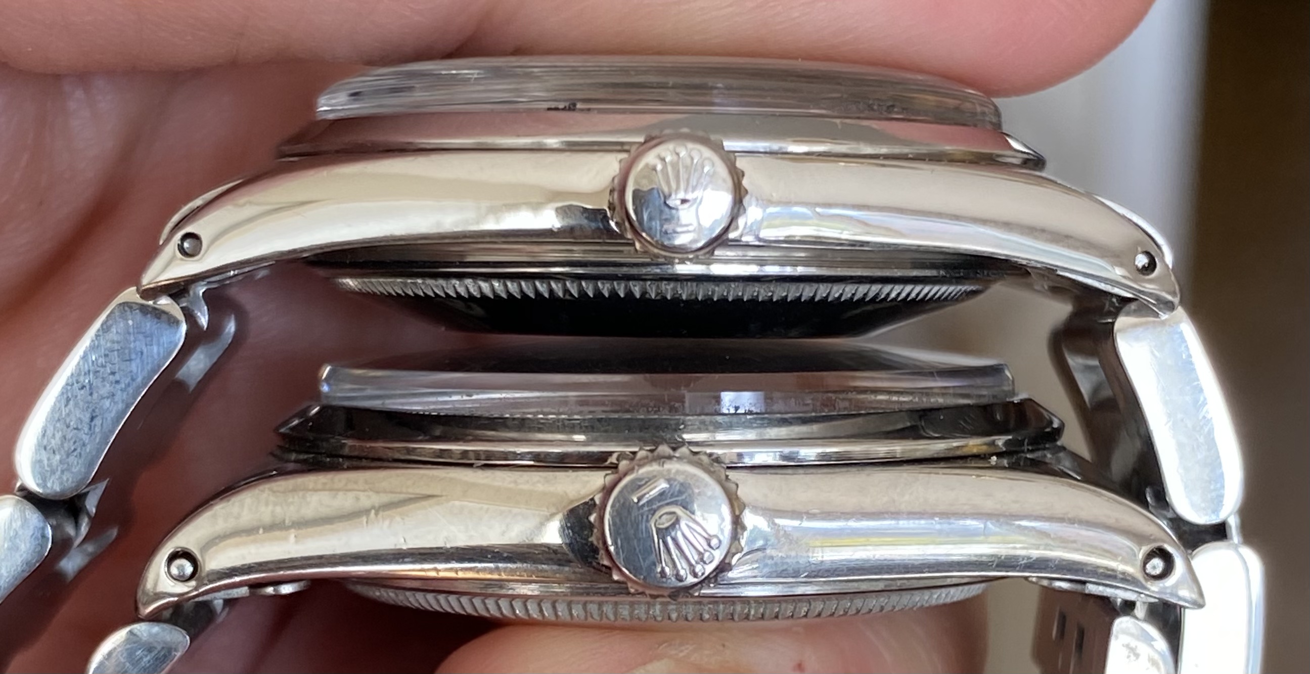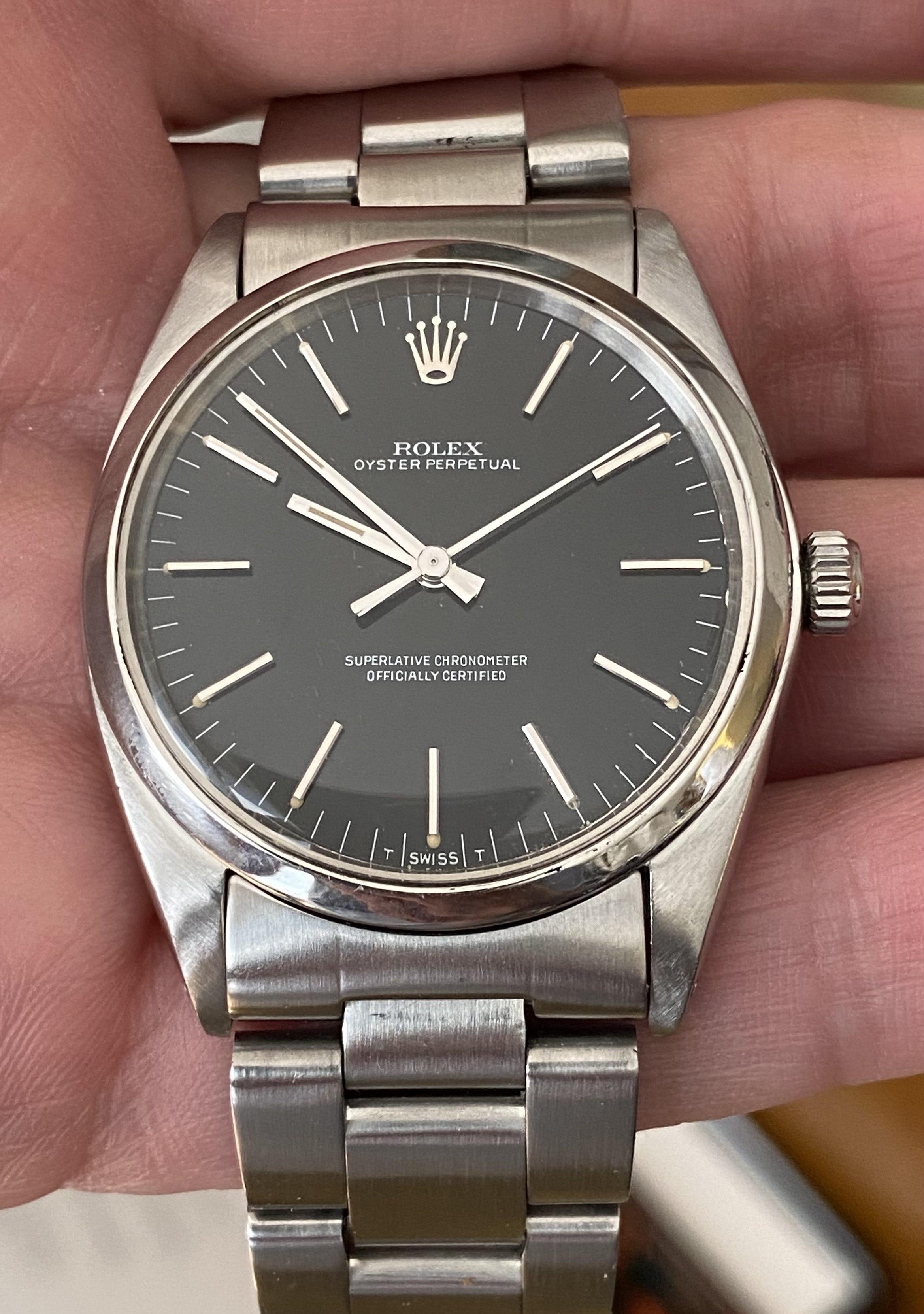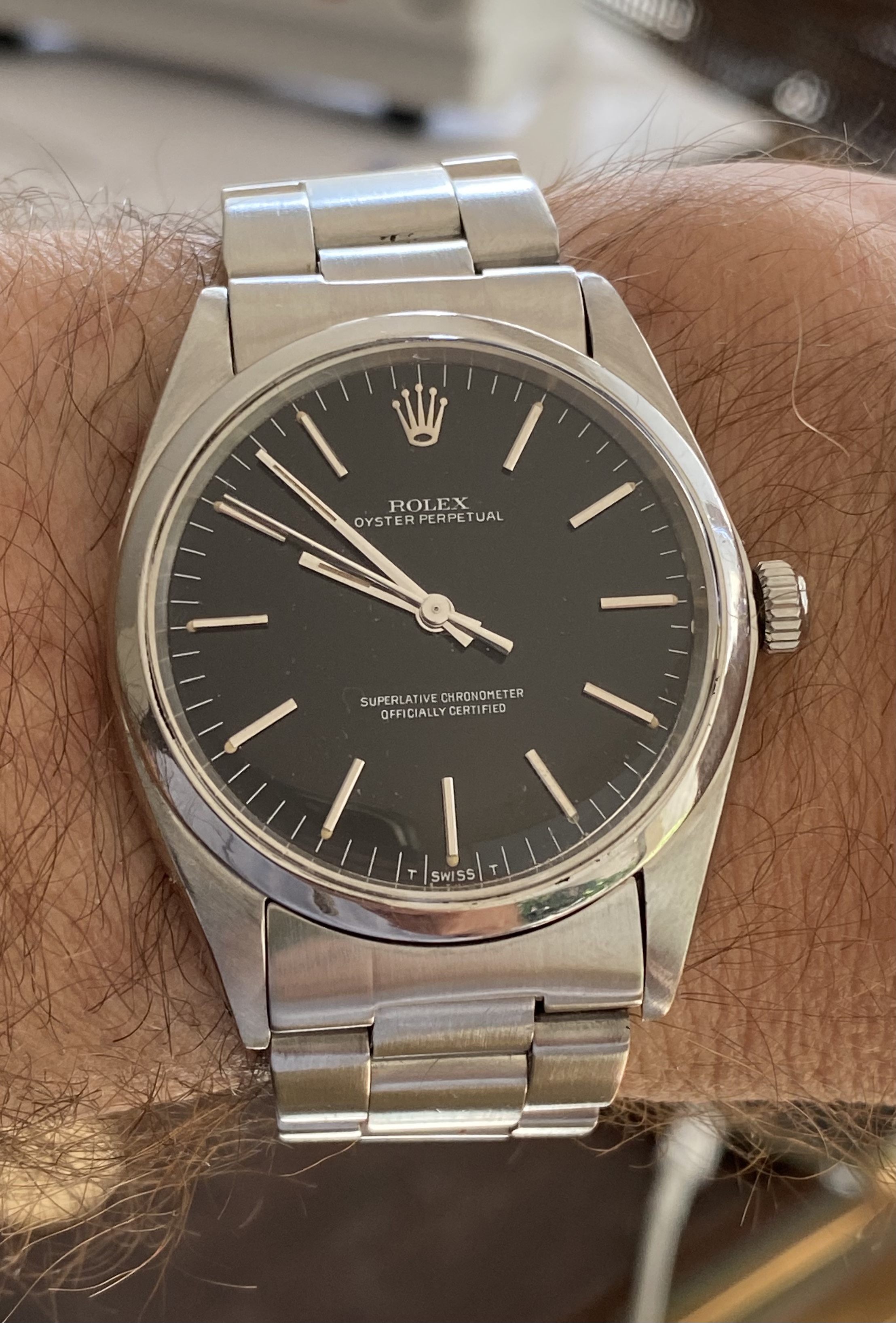 ·Some time earlier this year, in looking for 36mm 70’s no date Oyster Perpetuals, I stumbled on the 1018 reference. Like a 1002, 1018s have plain bezels (which down plays the whole Rolex thing). I became curious to see how much difference 2mm really was when on the wrist.
