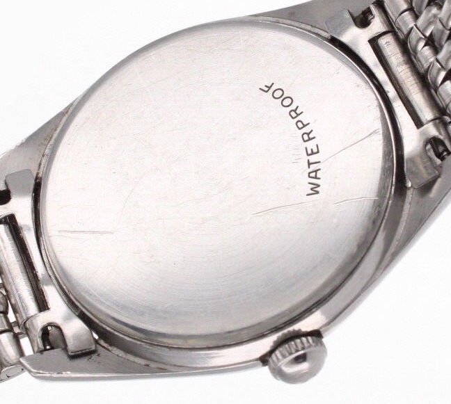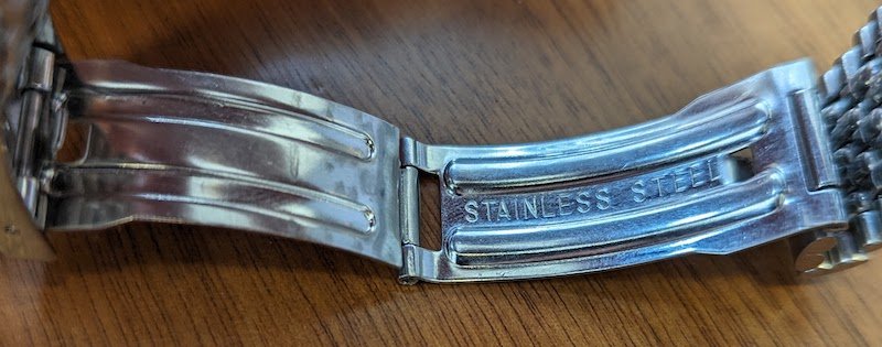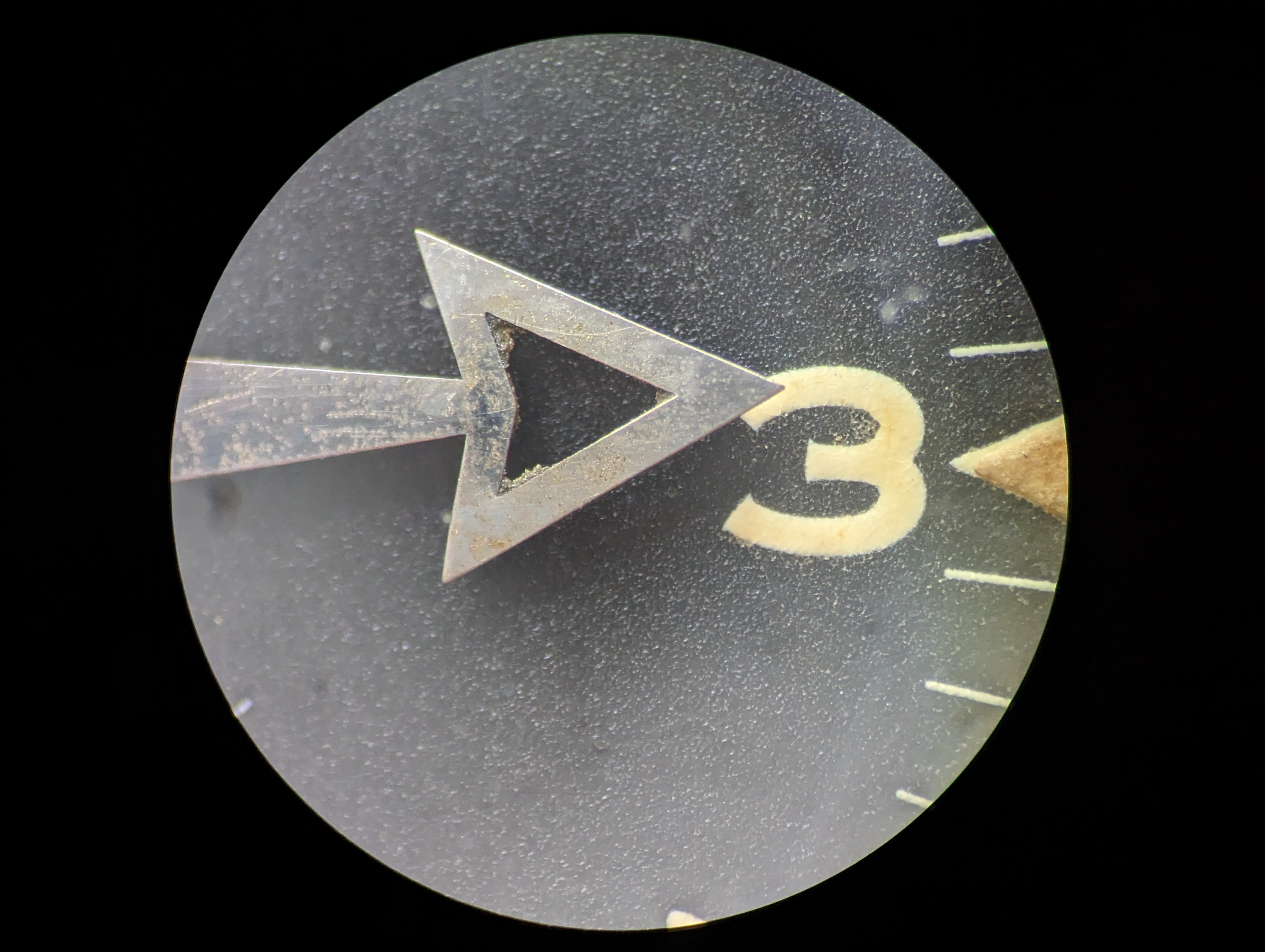 There are two obvious issues about the condition, the missing lume in the hands, and the damage to the luminous paint on the hour indices (9 through 12). I think the previous owner had a start at trying to remove it, and then thought better of it. The hands bother me less since they could be visually fixed and I don't mind having less radium, to be honest. I would prefer the hour indices to be undamaged, but I got a good deal, no? I also think the bracelet is fake, but the listing didn't exactly lie about that: