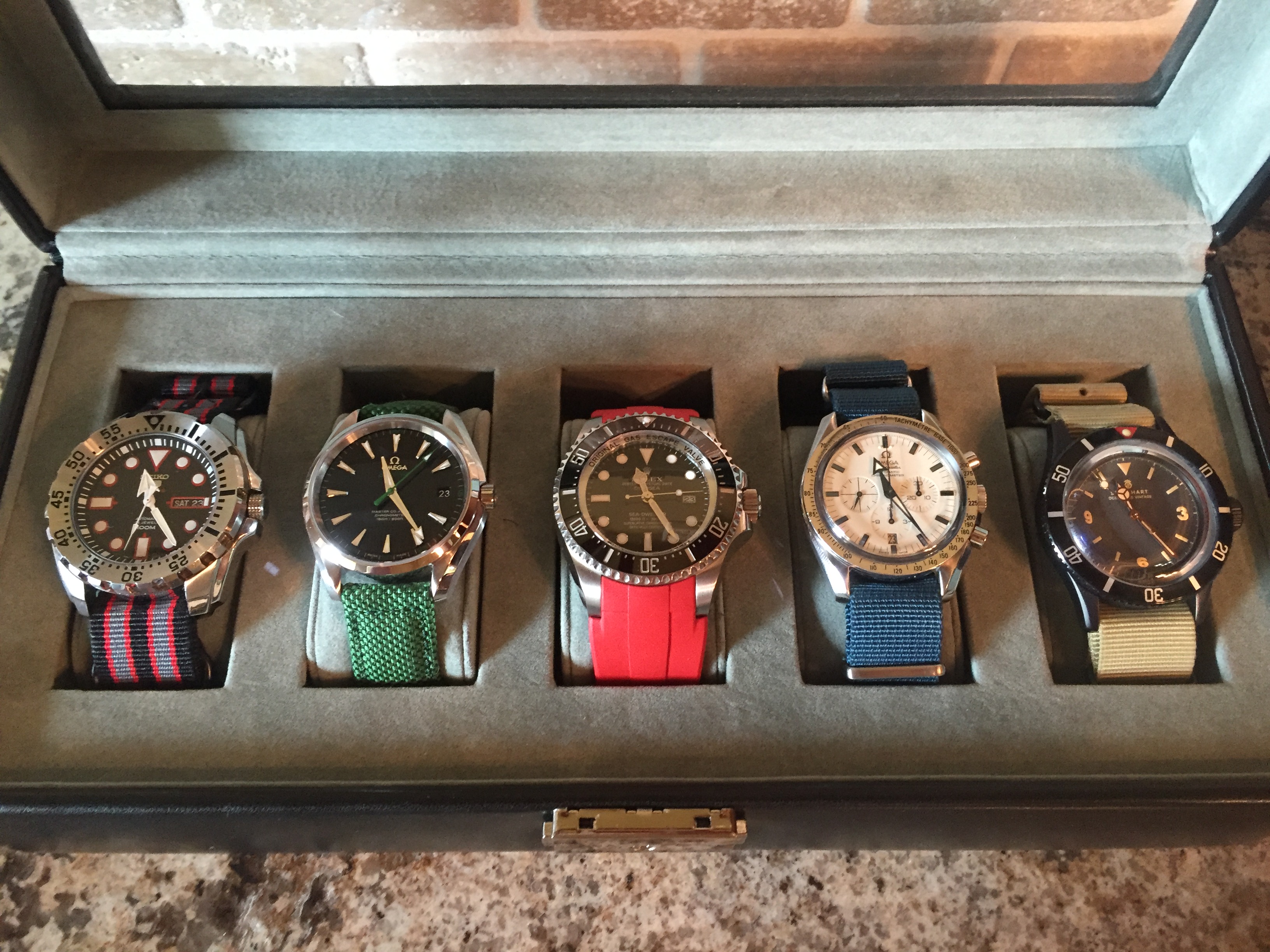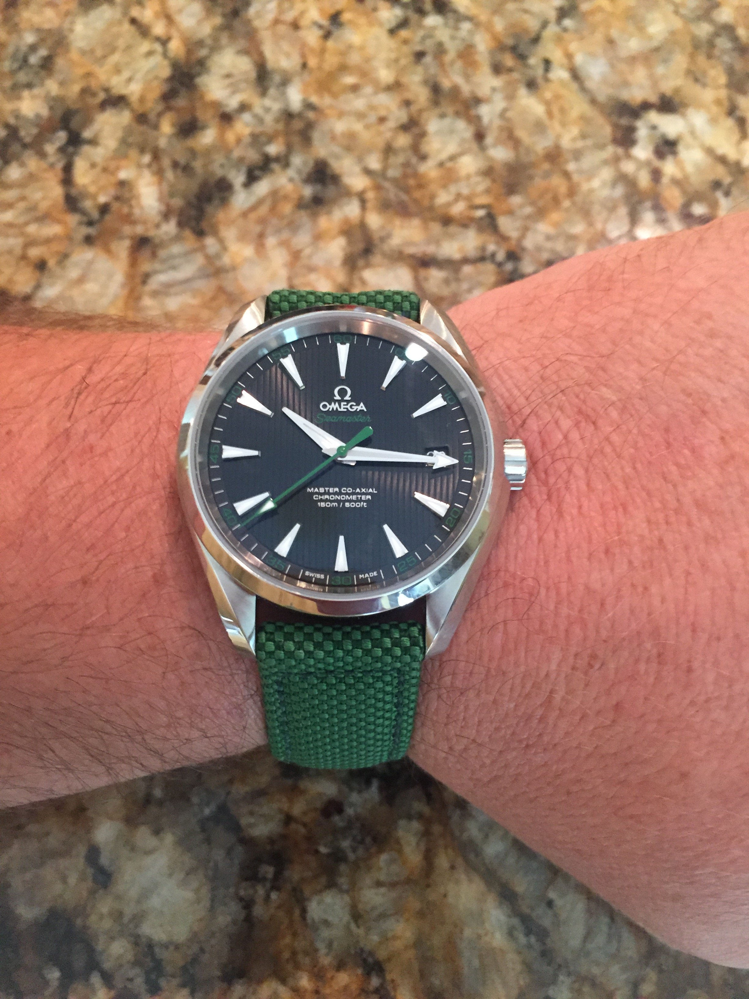 ·I wanted to add something green into the collection. I went back and forth between a Golf and a Hulk Sub, but Amazon Prime Day sealed the deal with an incredible price on the Aqua Terra. I liked that it had green bits, but I knew I wanted more green and I had researched a while back green strap options. Well, something I came across that would work was the Kevlar X-33 strap from Omega. Being that I'd prefer to keep parts OEM (I even put an Omega buckle on a $15 NATO on my Broad Arrow Speedy), I opted to give it a whirl...well, this is the end product. I'm very happy with the outcome: