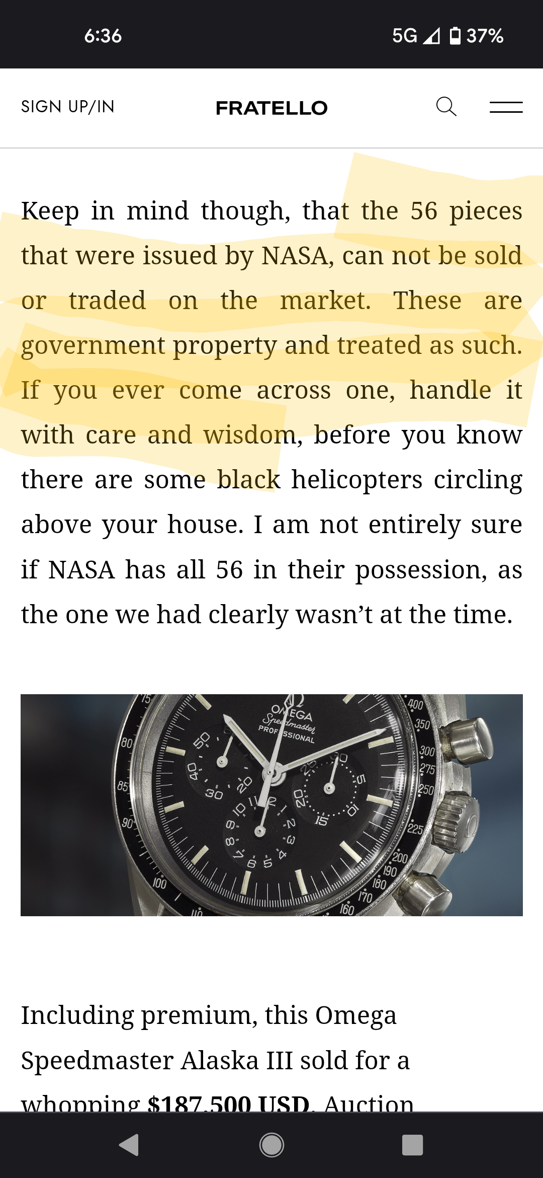 This is a prototype NASA owned one of 56 watches. Most of us would shit our pants just to wear it on our wrist for a day. If someone doesn't understand or appreciate the significance of this watch then that's on them. Is it someone elses responsibility to teach them to respect the history, their history? Hell no. In this age where everything is available on the internet, you must be too lazy or uncaring to do the minimal research, that's on you. What's more, if you only care about how much money you can make ( or didn't make because you sold it too cheap), no mercy. You didn't deserve the watch. People will pay 250k to 500k for this watch, maybe more. Some might only care about the money. I wouldn't know because I don't have that to spend. But they at least hold the watch in some great value, enough to drop real cash. As a nerdy fan of space and speedmasters, it almost feels insulting to sell something like this cheap. Especially if it was family.