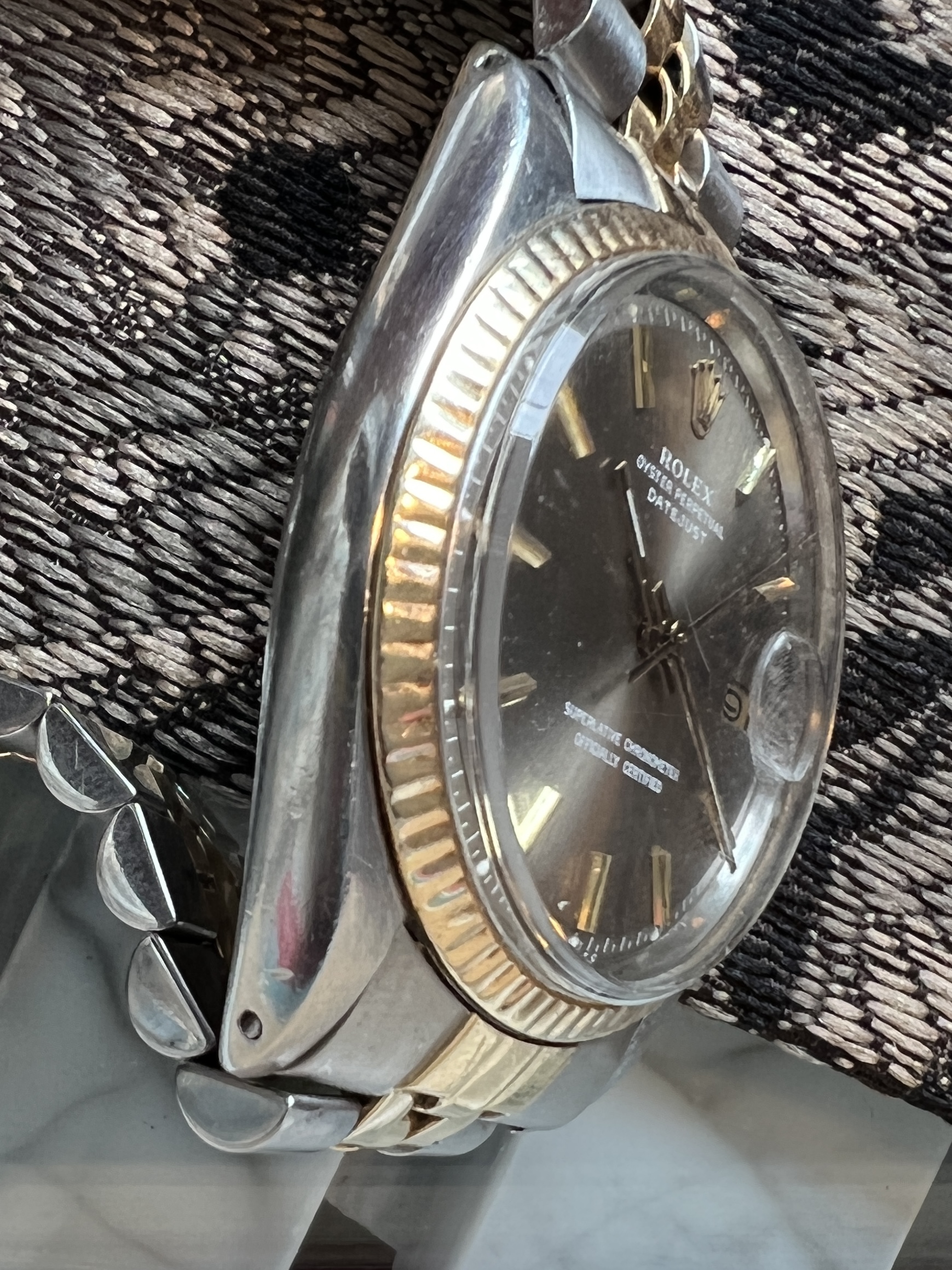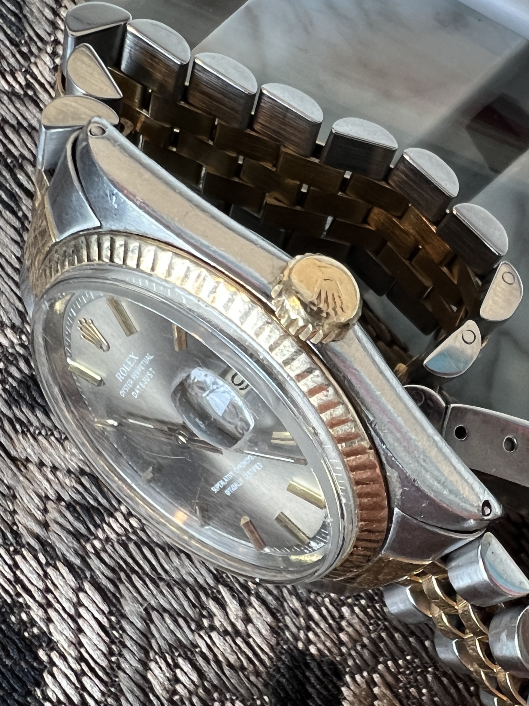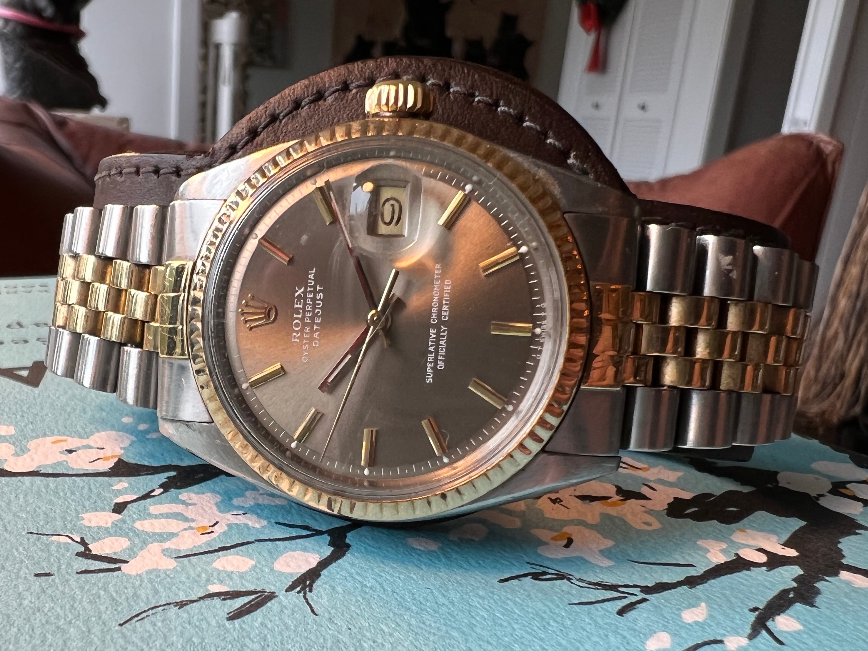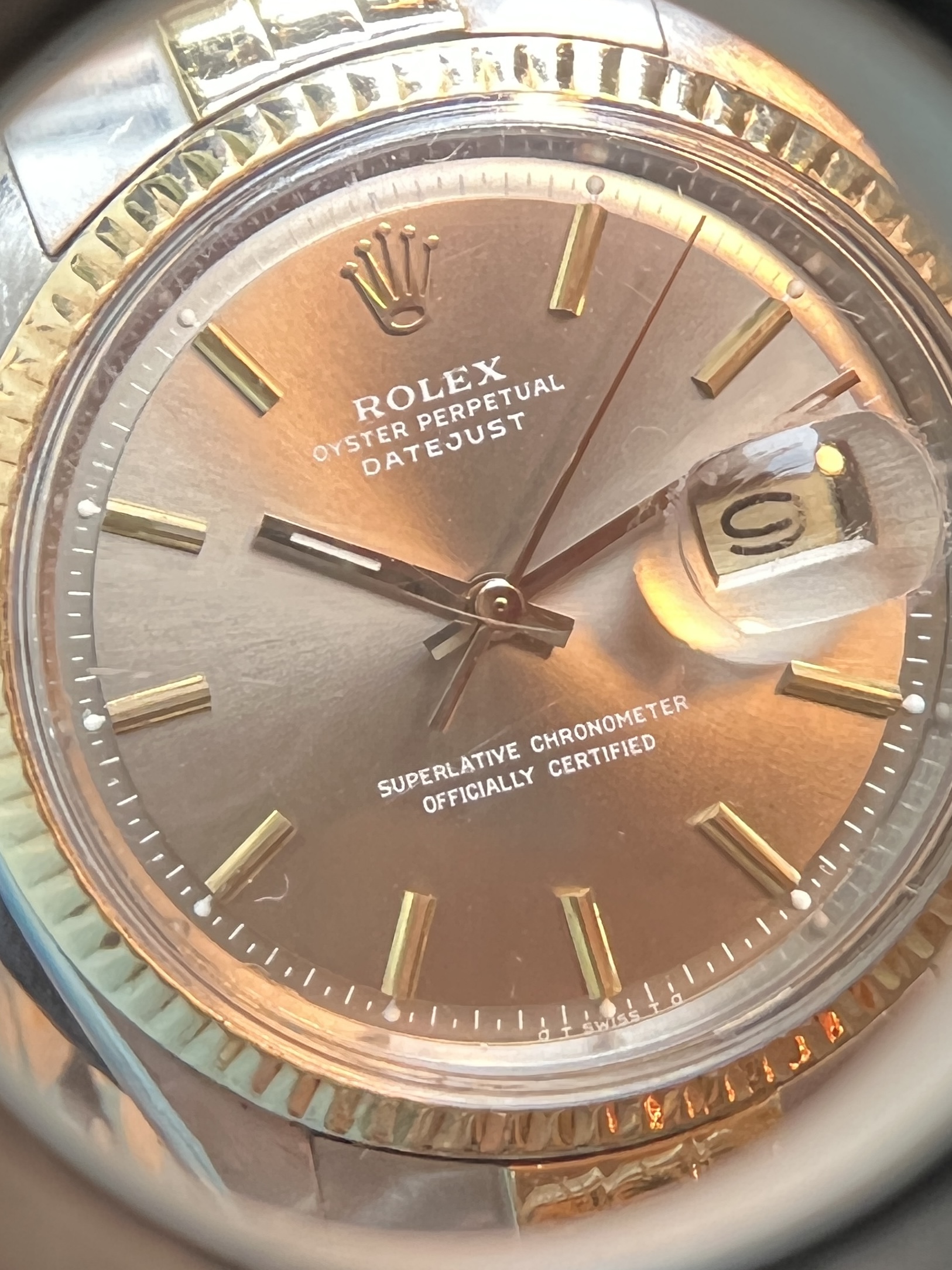 This two-tone datejust, purported to be purchased in 1968-1969, has a “sigma dial.” My understanding is that sigma dials were not “official” with Rolex until 1970, and and they most typically denoted white gold use on dials, but they are known to have been used more rarely by certain dial manufacturers before 1970 (as early as 1968?) and found on two-tones with yellow gold indices.
