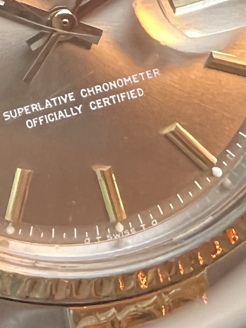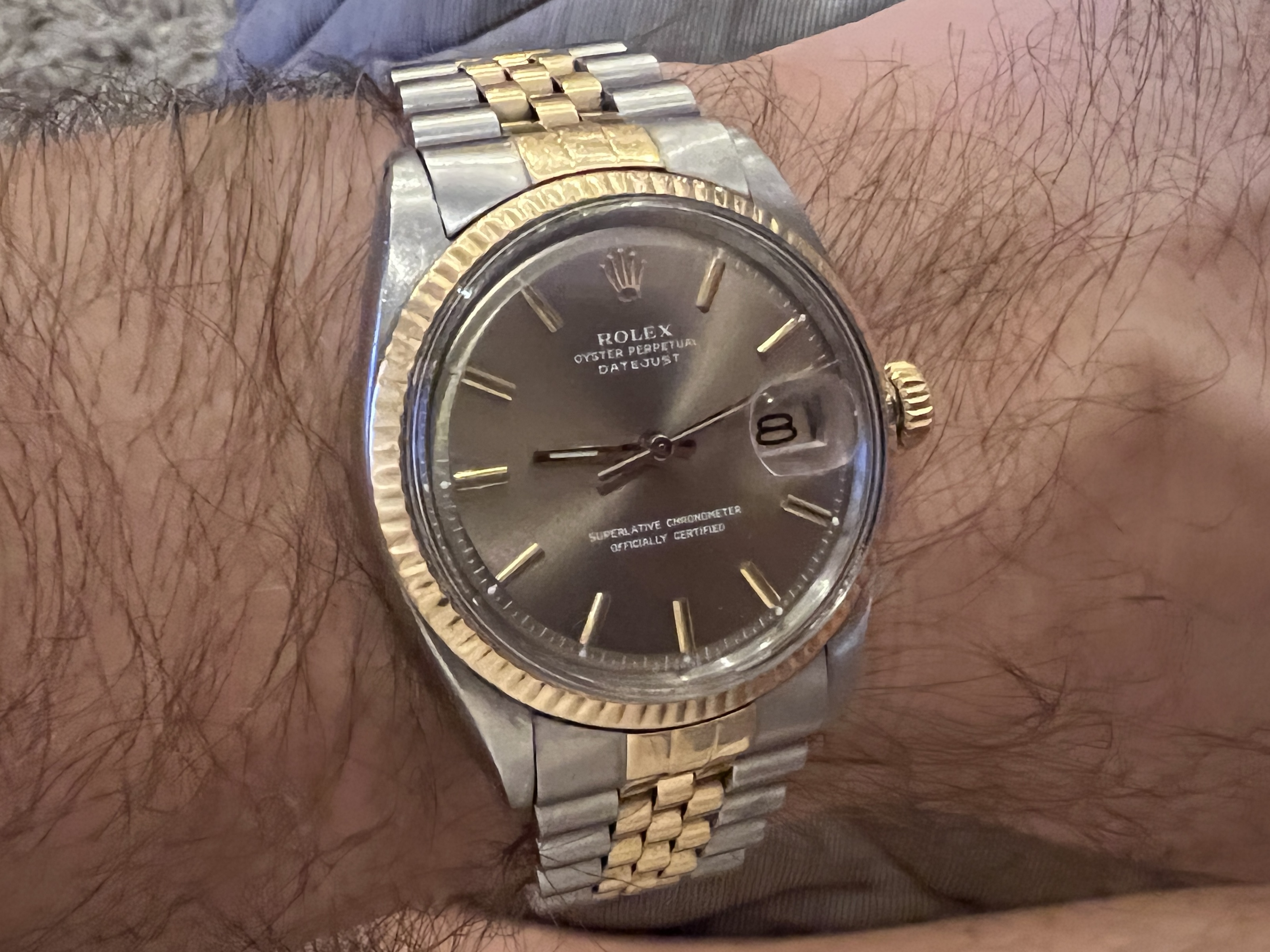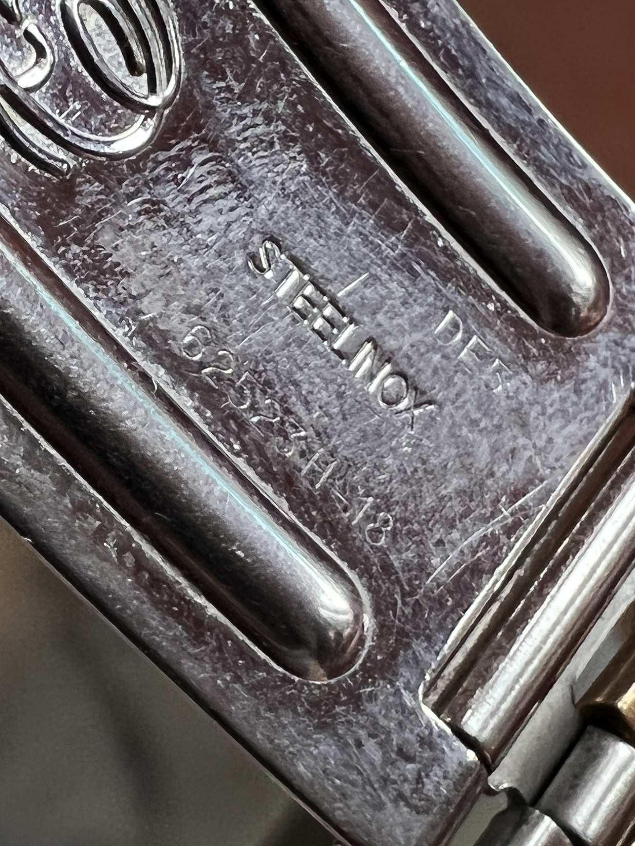 This two-tone datejust, purported to be purchased in 1968-1969, has a “sigma dial.” My understanding is that sigma dials were not “official” with Rolex until 1970, and and they most typically denoted white gold use on dials, but they are known to have been used more rarely by certain dial manufacturers before 1970 (as early as 1968?) and found on two-tones with yellow gold indices.