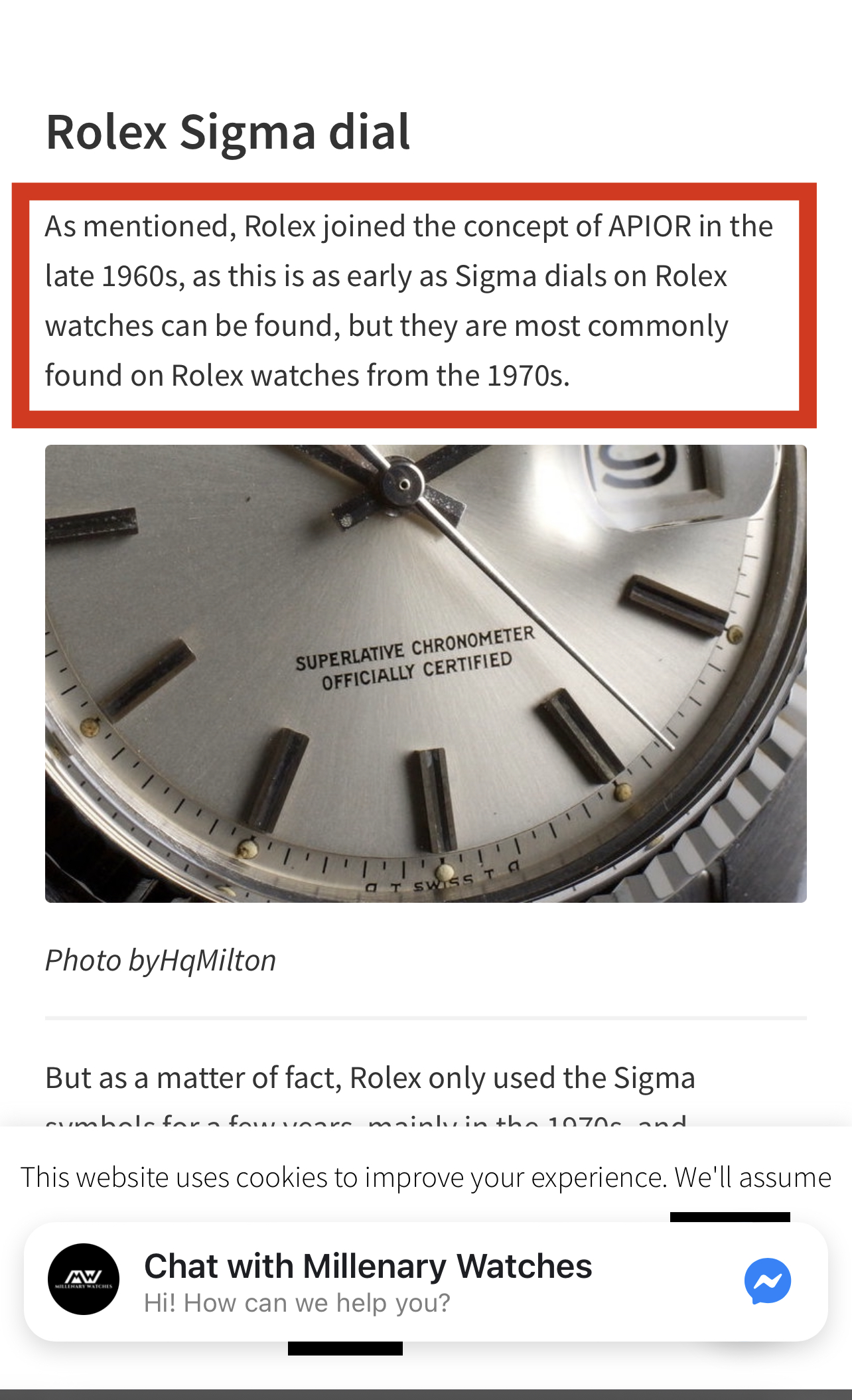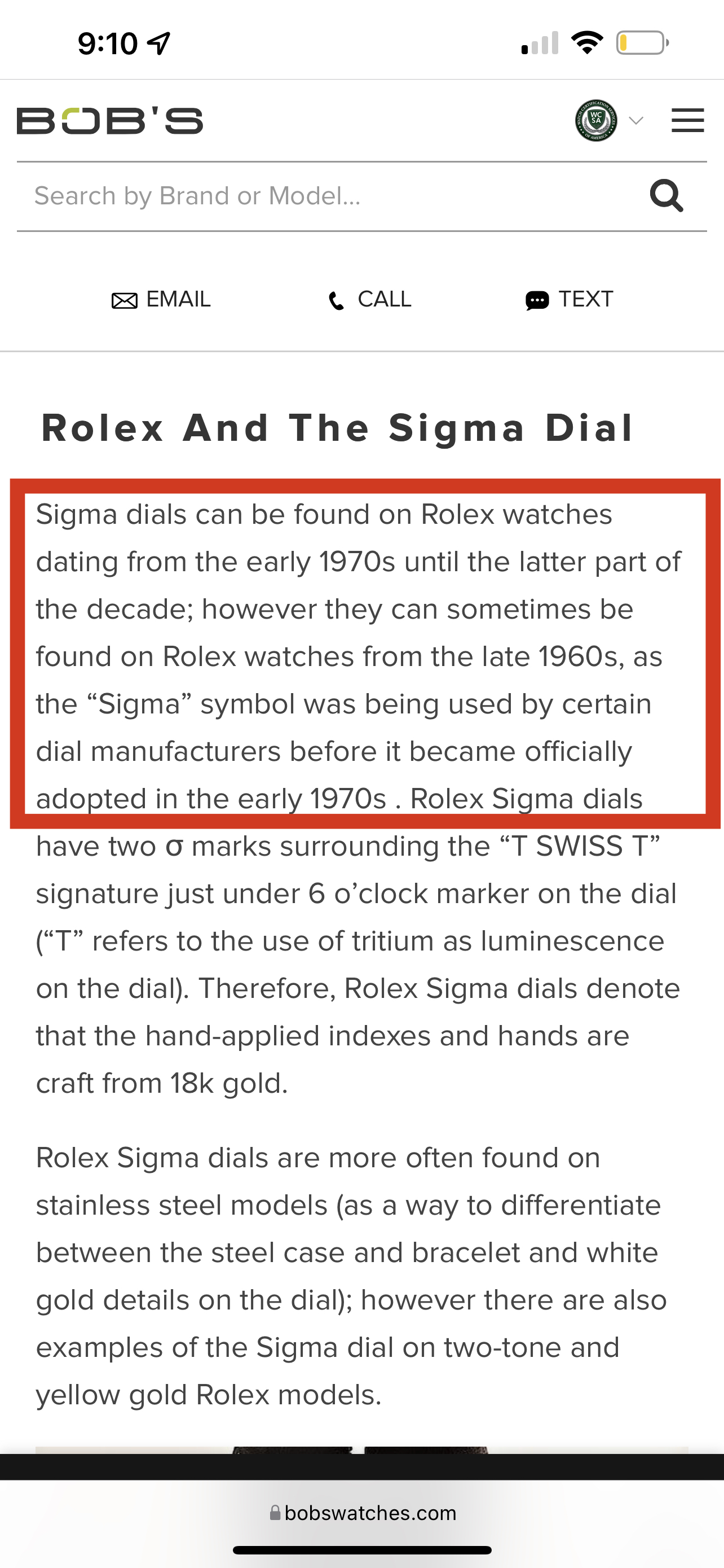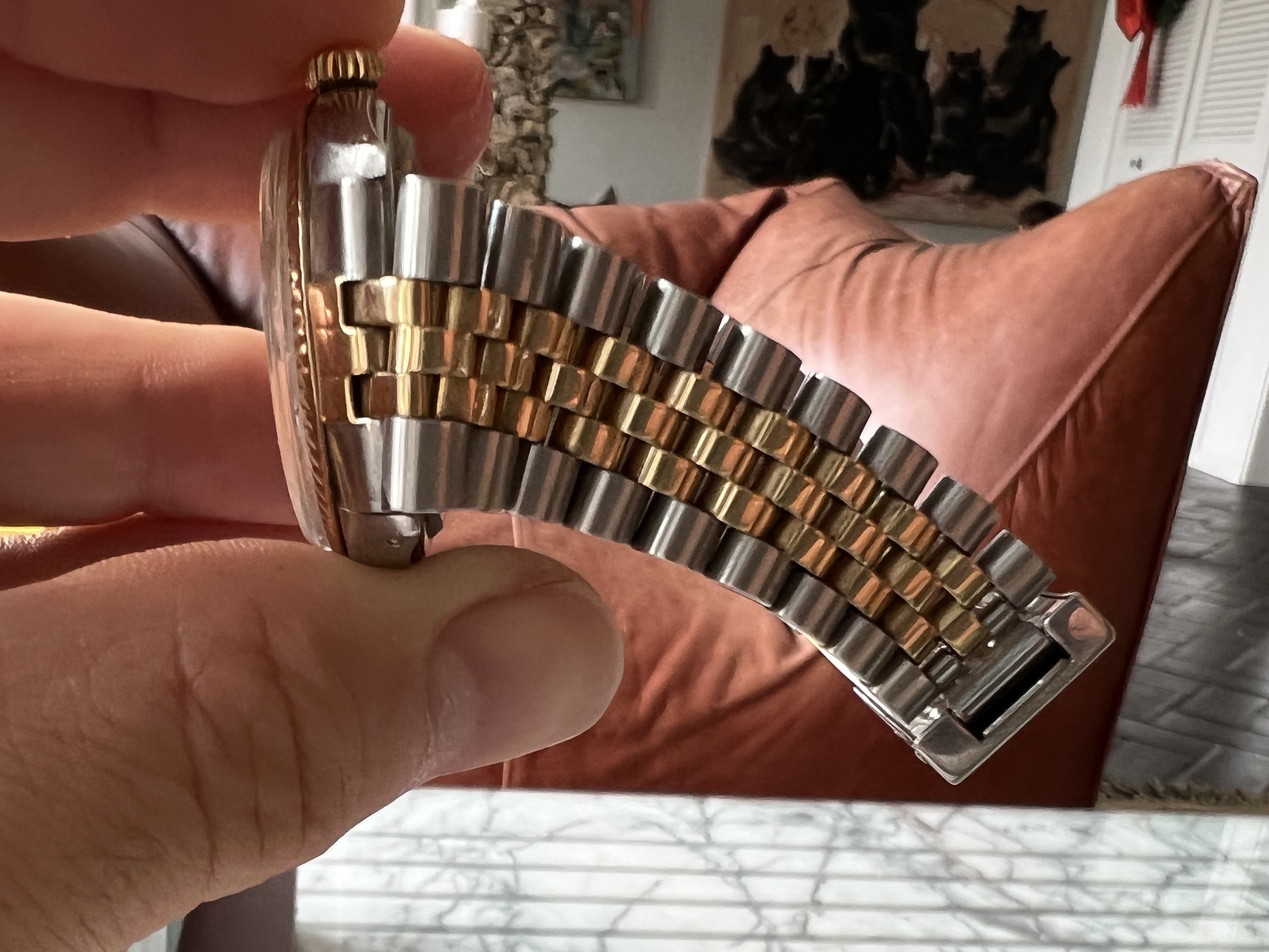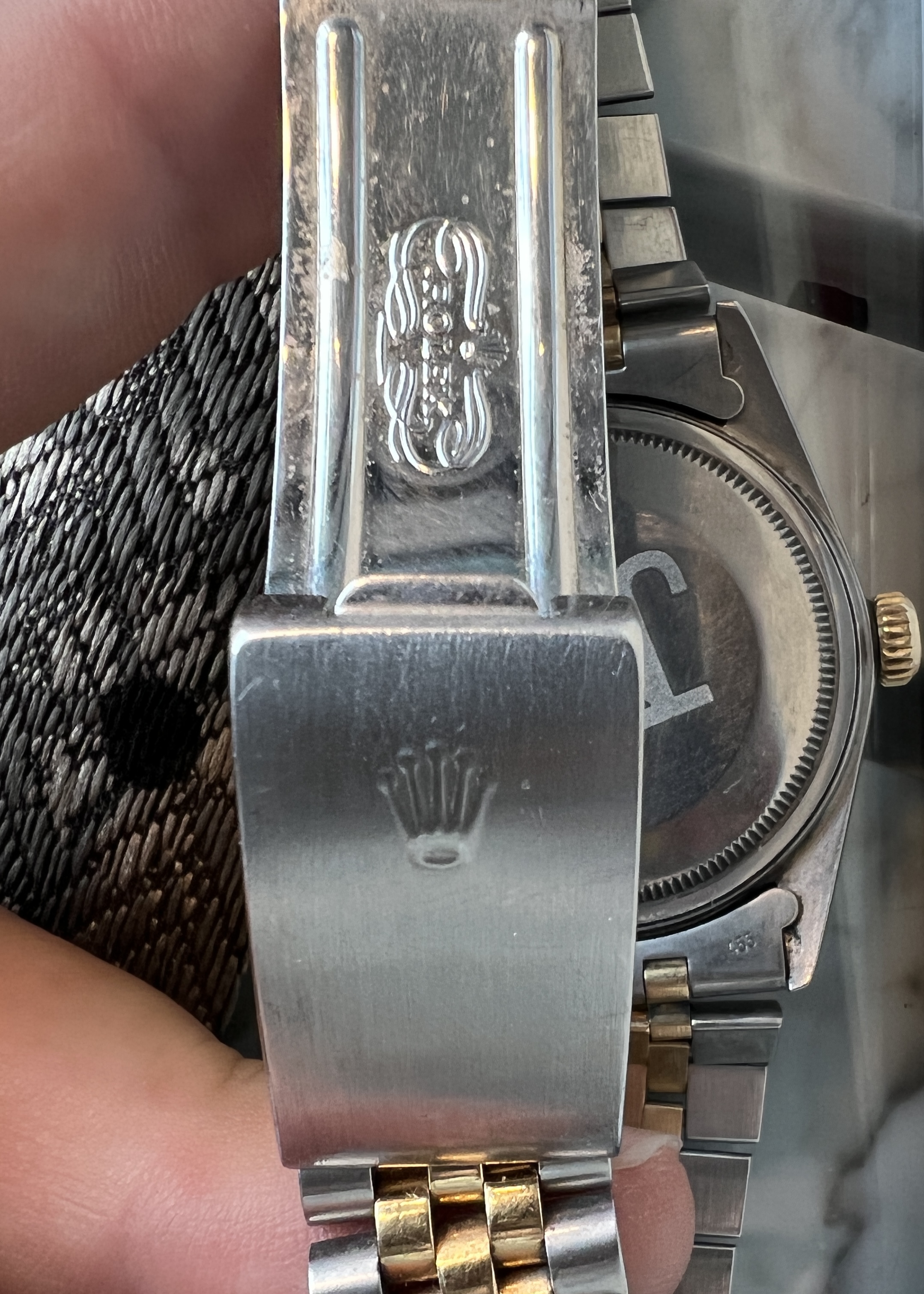 This two-tone datejust, purported to be purchased in 1968-1969, has a “sigma dial.” My understanding is that sigma dials were not “official” with Rolex until 1970, and and they most typically denoted white gold use on dials, but they are known to have been used more rarely by certain dial manufacturers before 1970 (as early as 1968?) and found on two-tones with yellow gold indices.