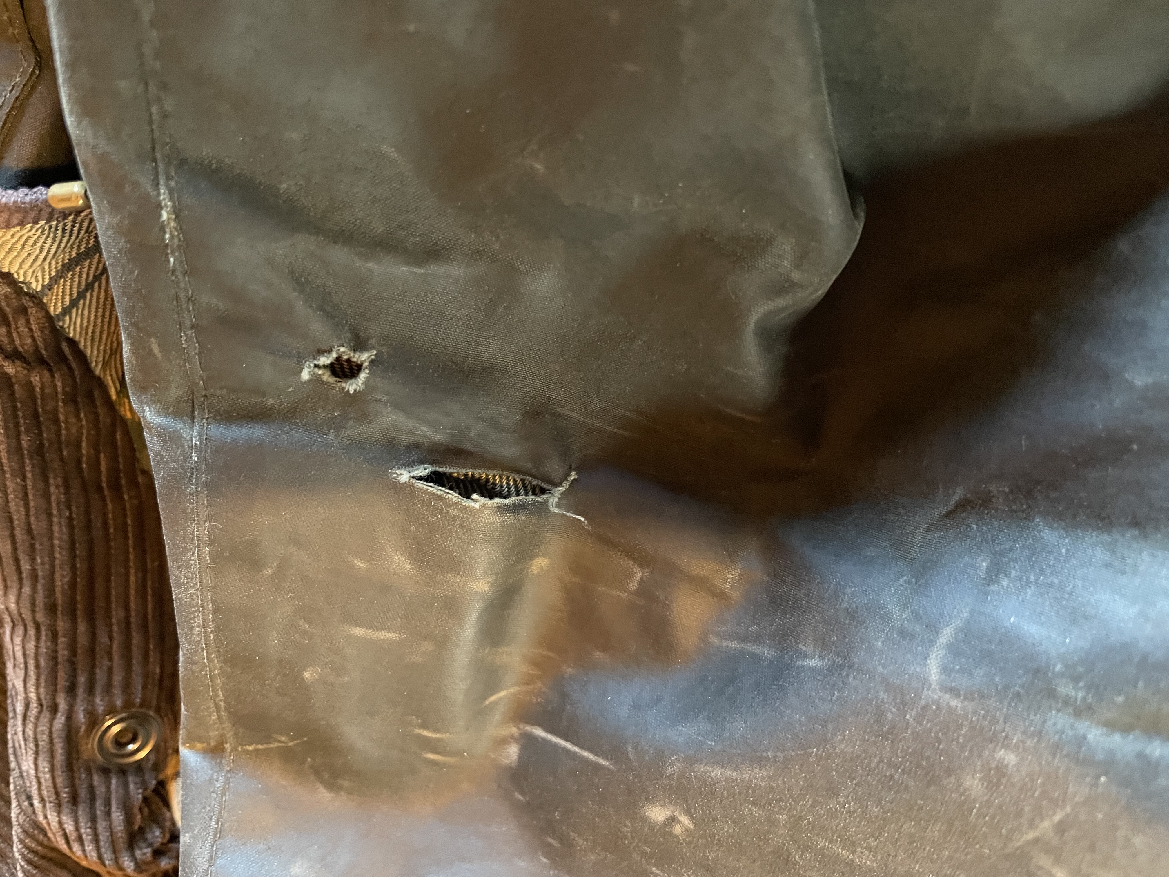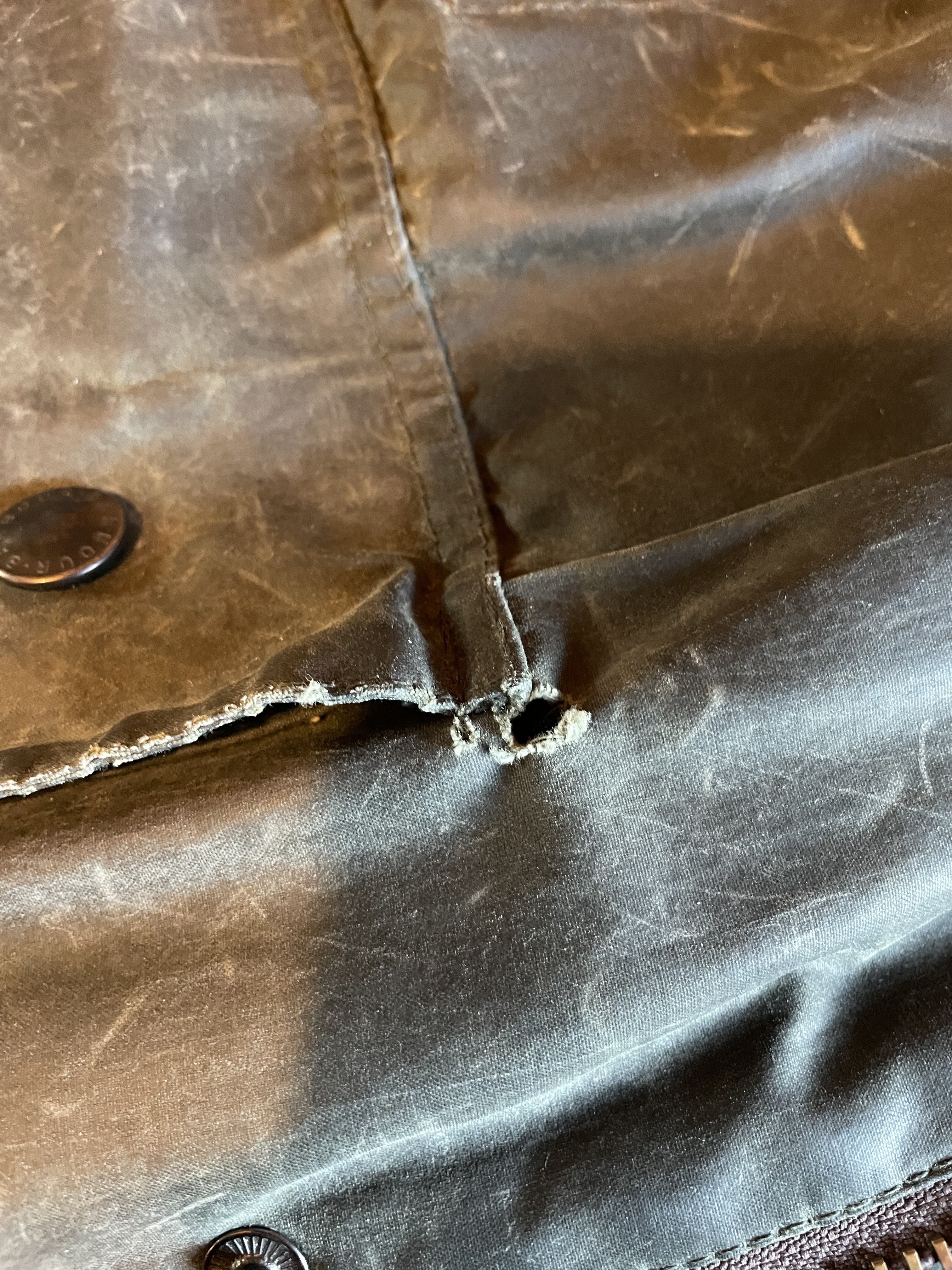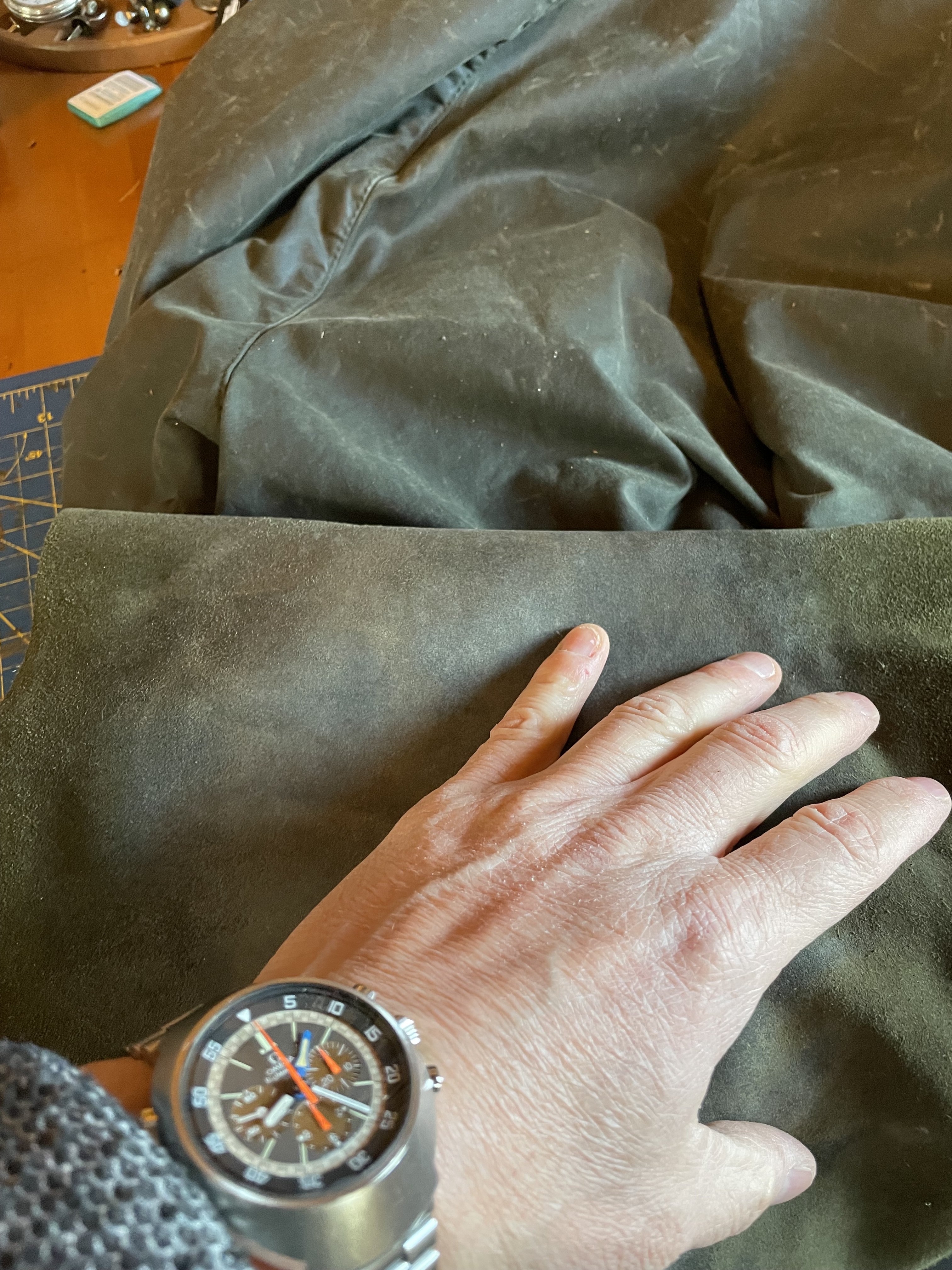 I have some old green suede from motorcycle chaps. Glad this is written text because however you pronounce « chaps », some asshole inevitably corrects you. The green arrow shows the worn chaps and the yellow arrow shows the jacket. Not a bad match for patching material. First watch shot. The watch will get involved again later… I cut two patches for the pocket tear. One on the inner shell, glued, and one on the outer shell. The patch will be visible, and I am fine with that. I have a new waxed Belstaff if I want a new and tailored look. Yes, I like this Barbour better and am keeping it! The Belstaff… not bad but a bit too « slim ». I am slim too, but am in my early 50s, so the more relaxed Barbour fits better.