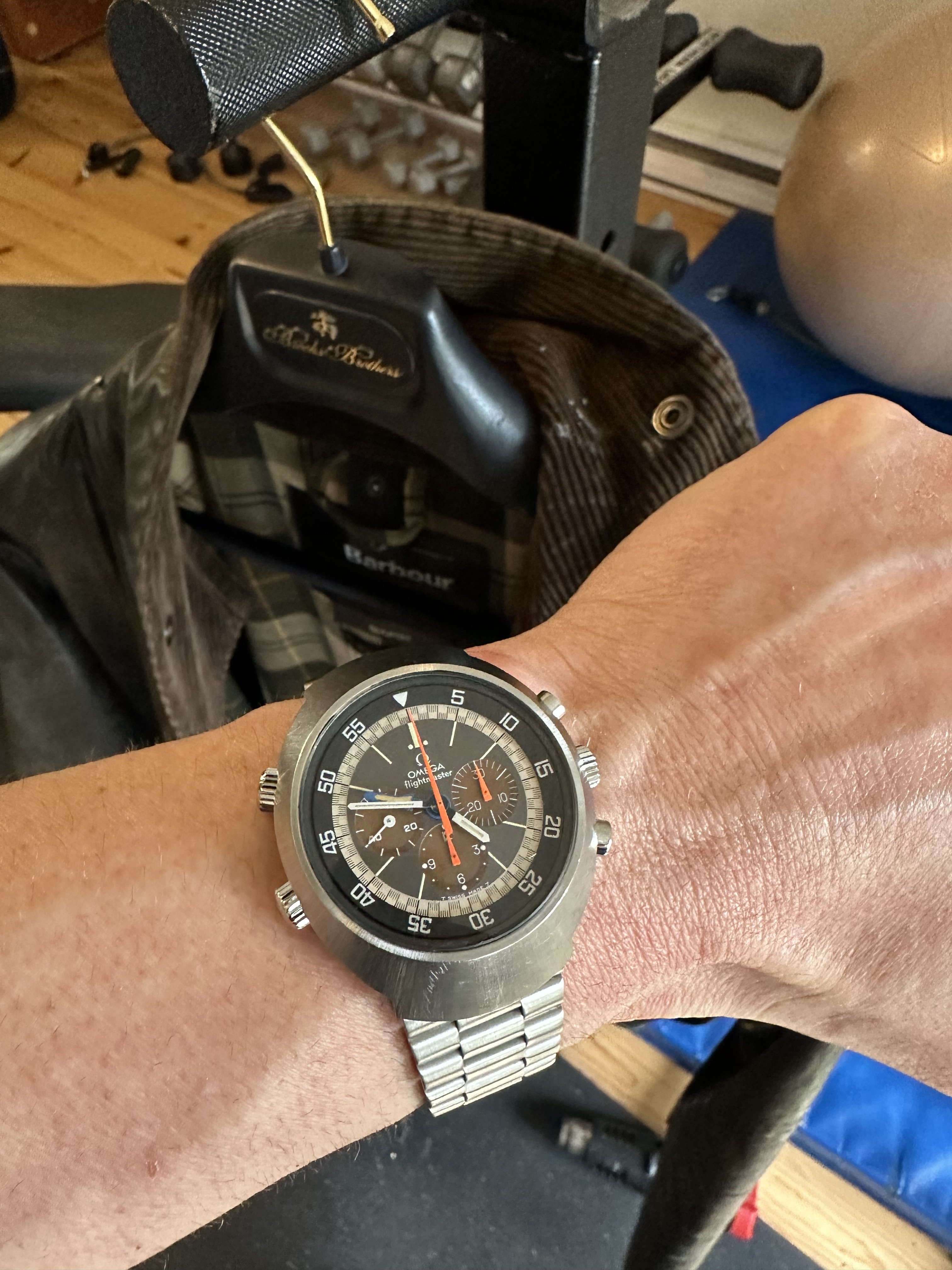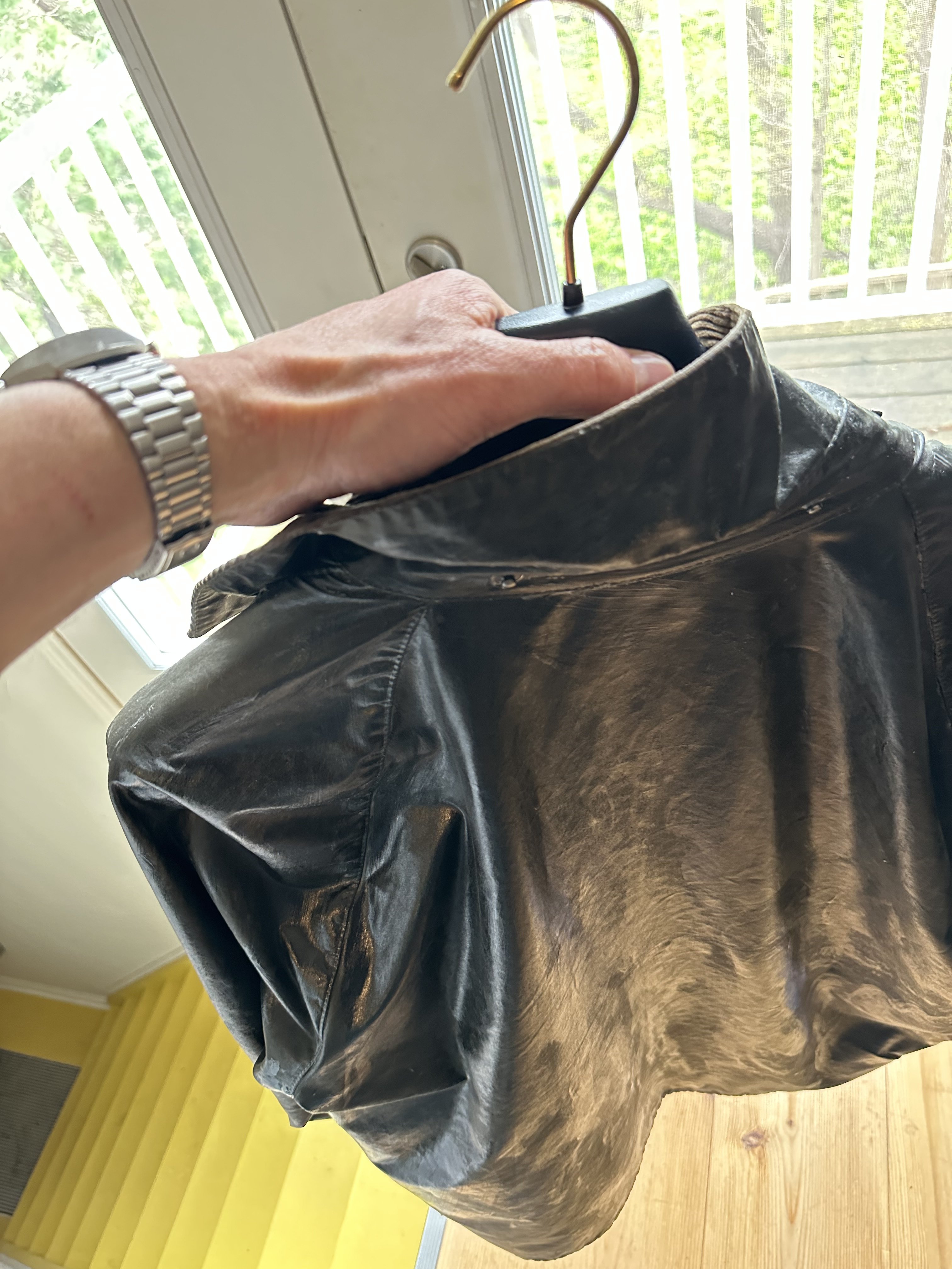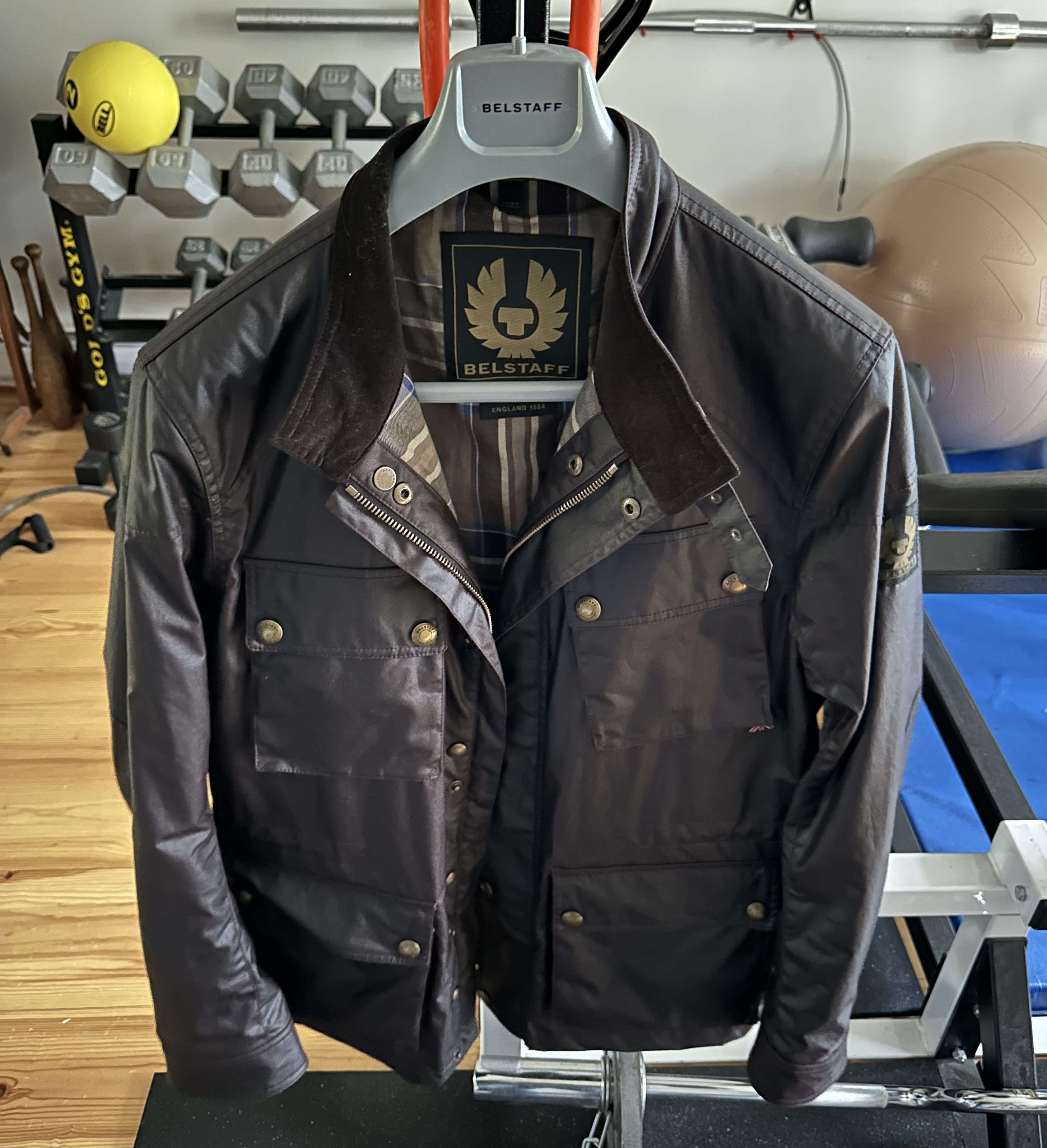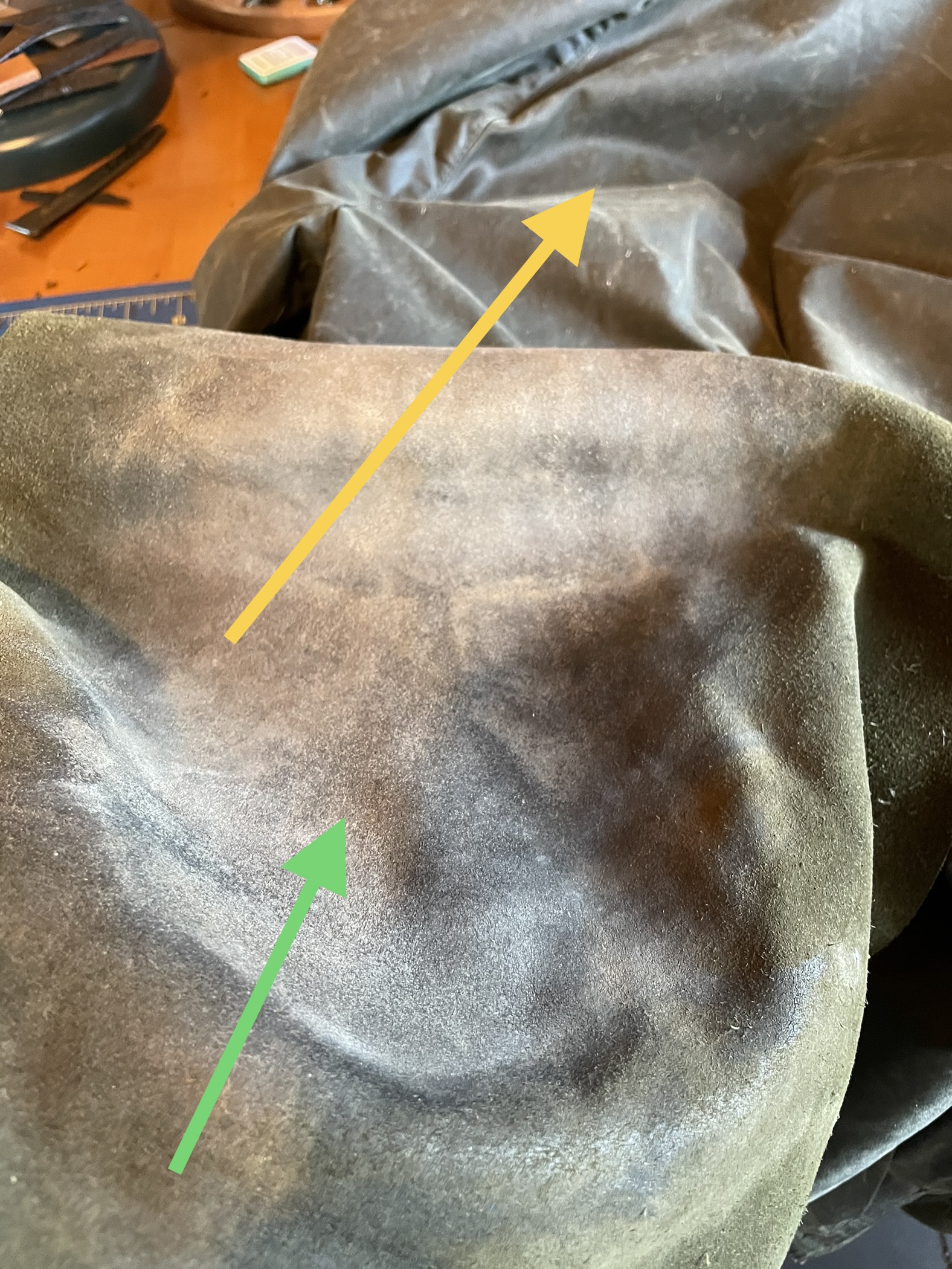I have some old green suede from motorcycle chaps. Glad this is written text because however you pronounce « chaps », some asshole inevitably corrects you. The green arrow shows the worn chaps and the yellow arrow shows the jacket. Not a bad match for patching material. First watch shot. The watch will get involved again later… I cut two patches for the pocket tear. One on the inner shell, glued, and one on the outer shell. The patch will be visible, and I am fine with that. I have a new waxed Belstaff if I want a new and tailored look. Yes, I like this Barbour better and am keeping it! The Belstaff… not bad but a bit too « slim ». I am slim too, but am in my early 50s, so the more relaxed Barbour fits better.