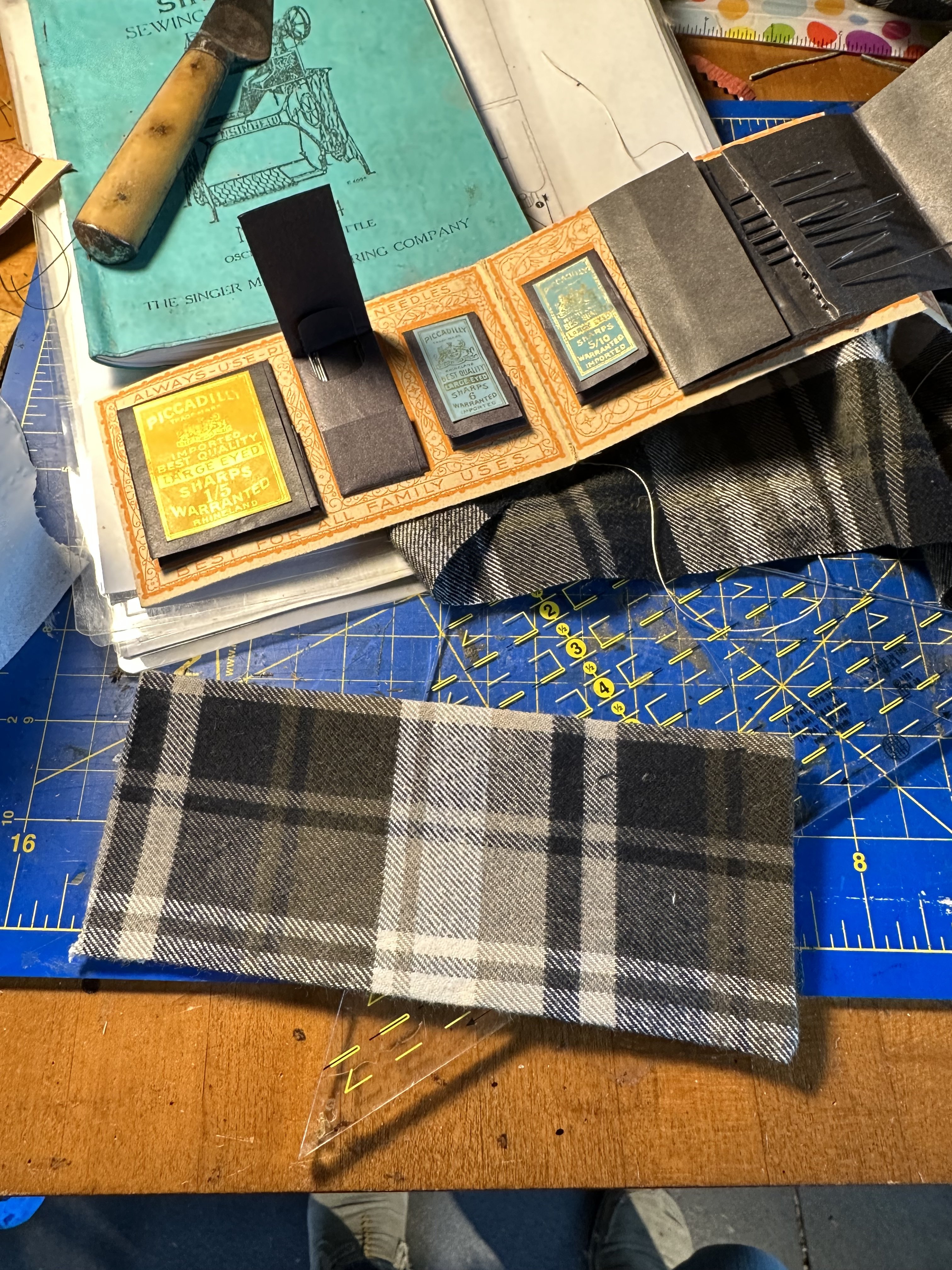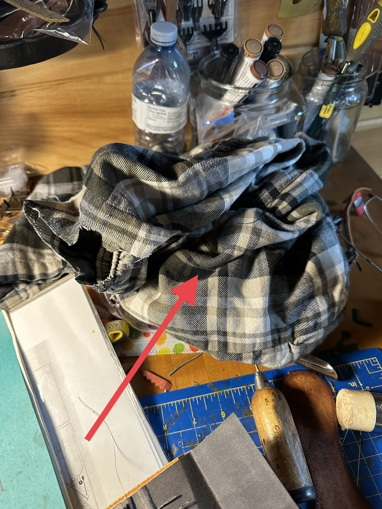The red arrow shows a pair of cotton pyjama pants from Goodwill. I cut out a patch, ironed it and stitched the folded sides. This will cover the tear in the lining. Photos of the patched pocket, liner and sleeves to follow.
